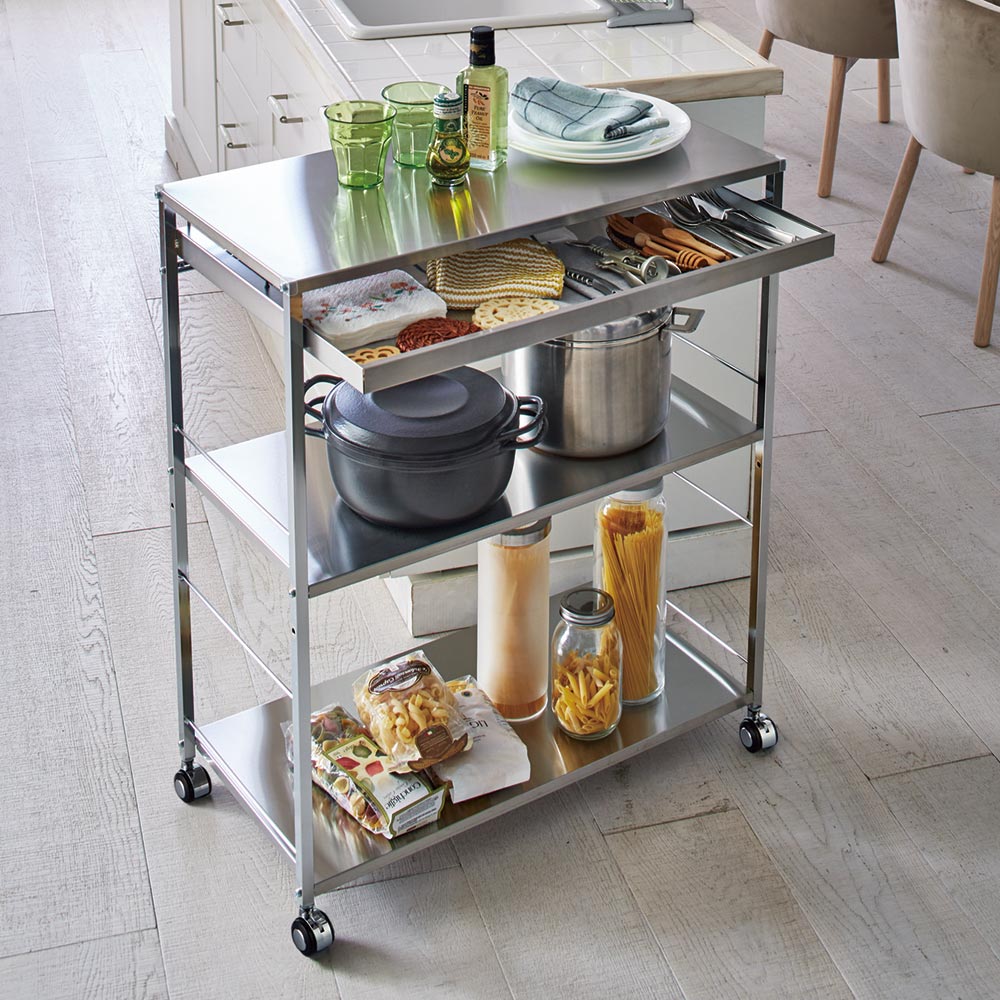 ※ご注意ステンレス部分にはキズ防止用のフィルム状保護シートが付いている場合があります。一度剥がしてしまいますと、ご返品をお受けできませんので十分ご注意ください。本商品は「ステンレス作業台ワゴン 引き出し1杯タイプ 幅73.5cm」です。調理などの補助スペースとして使えるステンレス製ワゴン。キャスター付きで移動もラク。引き出しにはラップやカトラリーを収納できます。高さ85cmでシンクに続く作業台として使える、ステンレス製キッチンワゴン◆一般的なキッチンシンクの作業台の高さに合わせた高さ85cmです。◆ステンレス製の天板は傷や汚れ・水はねに強く、調理作業スペースとして使えます。◆ステンレス製の天板には熱いものも直接置くことができます。◆キャスター付きで好きな場所へ動かせ、作業時にはストッパーで動かないように固定できます。細部にこだわったディノス家具・企画商品です◆中棚の高さは2段階調節できます。◆天板下に引き出し付きで、ラップやカトラリー、ふきんなどのこまごましたキッチン雑貨を収納できます。◆幅サイズが50cm・73.5cmから選べます。上質なインテリアにマッチする美しいキッチンワゴン◆高級感ある佇まいが、落ち着いたキッチン収納を演出します。◆おしゃれなシステムキッチンにぴったりのデザインです。◆お部屋のインテリアをモダンにされている方におすすめです。安心と信頼の国内生産品◆熟練の家具職人がひとつずつ丁寧に仕上げたキッチンワゴンです。◆細部の丁寧な仕上がりなど、国産品ならではの高品質をお楽しみください。