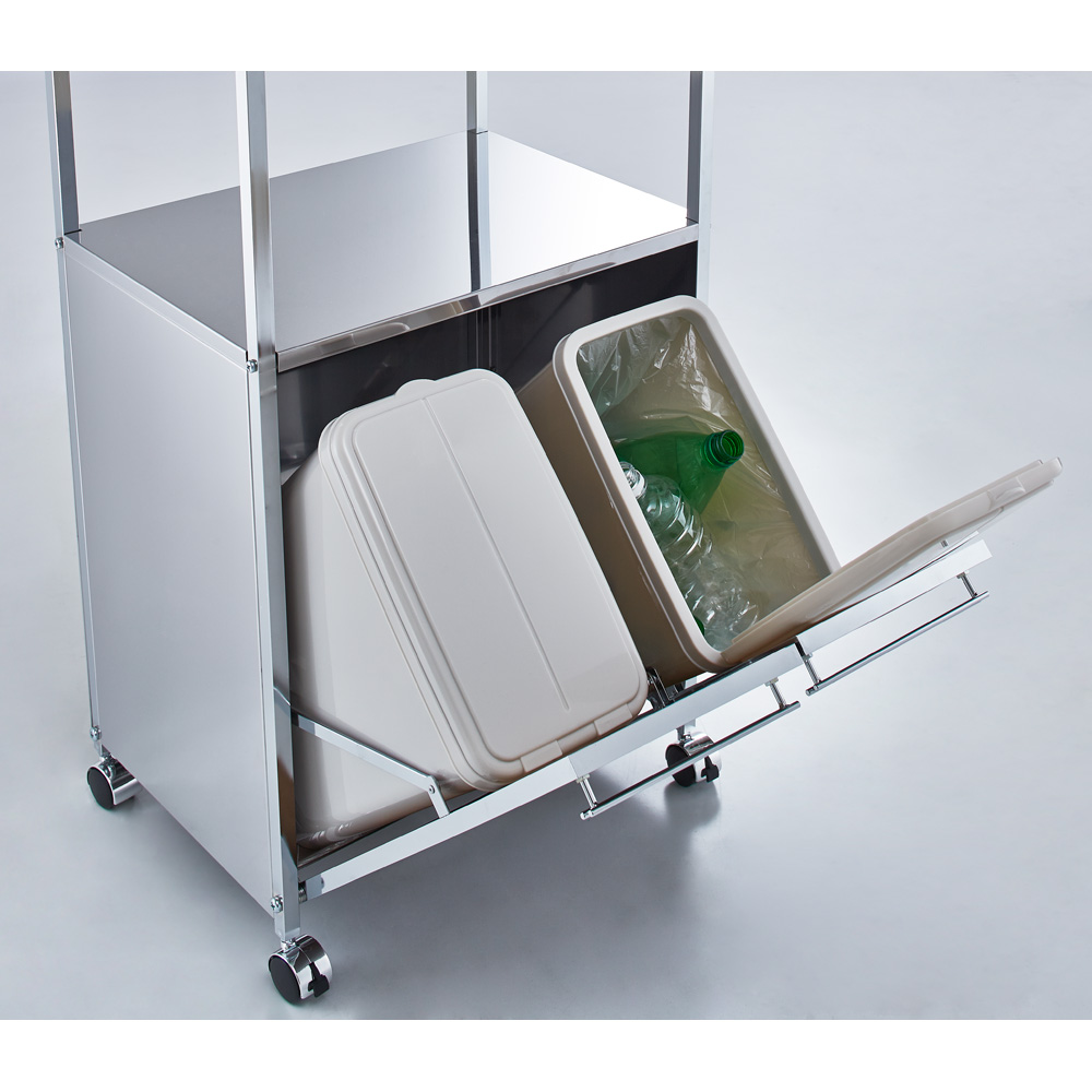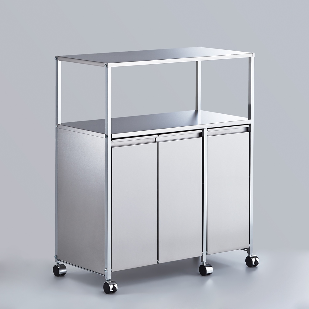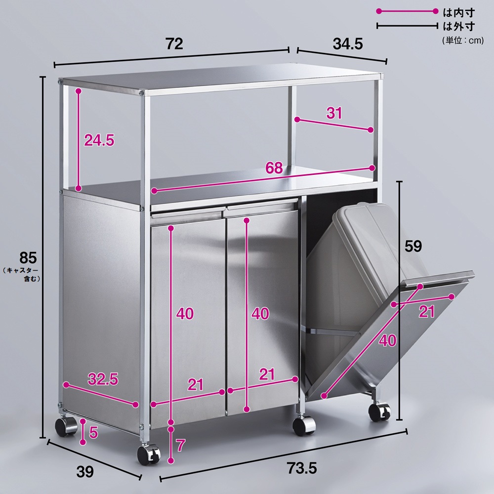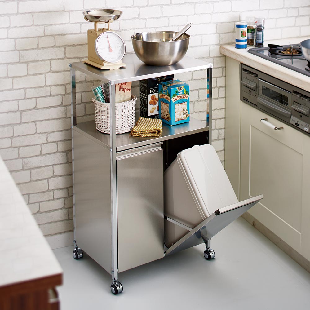 ※ご注意ステンレス部分にはキズ防止用のフィルム状保護シートが付いている場合があります。一度剥がしてしまいますと、ご返品をお受けできませんので十分ご注意ください。本商品は「ステンレス作業台ワゴン ダスト3分別 幅73.5cm」です。調理中の補助スペースとして使えるステンレス製ワゴン。キャスター付きで移動もラク。ダストボックスはフタ付きでニオイ漏れもしにくく、中のペールは取り外して洗えます。高さ85cmでシンクに続く作業台として使える、ステンレス製キッチンワゴン◆一般的なキッチンシンクの作業台の高さに合わせた高さ85cmです。◆ステンレス製の天板は傷や汚れ・水はねに強く、調理作業スペースとして使えます。◆ステンレス製の天板には熱いものも直接置くことができます。◆キャスター付きで好きな場所へ動かせ、作業時にはストッパーで動かないように固定できます。◆キッチンの作業スペースが足りない方へ。作業スペースを増やしながらゴミの分別もできます。水はねや汚れに強い分別ダストボックス◆置き場所をとるゴミ箱の上を作業台として有効活用できるキッチンワゴンです。◆ヘアライン風のマットな仕上がりのステンレスはクールな印象。◆14Lのペールが2分別には2個、3分別には3個付属し、フタ付きなのでイヤな臭いも軽減。◆ペールにはごみ袋の口を留められるストッパーが付いているので、一つのペール内でごみの分別も可能です。◆ペールは取り外して洗うこともでき、清潔を保てます。上質なインテリアにマッチする美しいキッチンワゴン◆高級感ある佇まいが、落ち着いたキッチン収納を演出します。◆おしゃれなシステムキッチンにぴったりのデザインです。◆お部屋のインテリアをモダンにされている方におすすめです。安心と信頼の国内生産品◆熟練の家具職人がひとつずつ丁寧に仕上げたキッチンワゴンです。◆細部の丁寧な仕上がりなど、国産品ならではの高品質をお楽しみください。