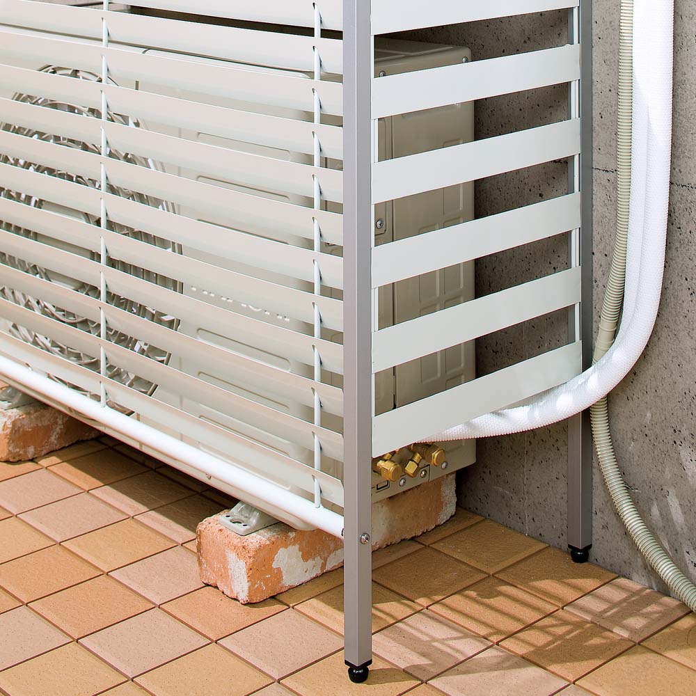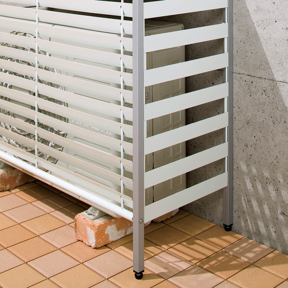 ※スチール製品は素材の特性上、経年変化でサビが発生致します。長くお使い頂くために、お届け直後の錆止め材の塗布をお薦めしております。 また、ご使用開始後も定期的なお手入れをお薦めします。(お手入れ方法&取り付け方法)室外機まわりが収納空間に大変身。◎お庭に興ざめなエアコンの室外機、モダンに隠します◎・おうちの裏手でもご近所からは見られてしまう、やっかいなエアコン室外機。・室外機まわりにもこだわりたい方に、おすすめのアイテムです。◎エクステリアに溶け込むデザイン◎・せっかく作り込んだお庭の中で、エアコン室外機の存在が浮いていませんか?・モダンデザインのアイアン製エアコン室外機カバーなら、建物の外壁やガーデンにもしっくりなじみます。・ホワイトとダークブラウン、お家の外観に合わせたカラーからお選びください。・別売のサイドパネルの使用で、よりスッキリした外観になります。◎機能的な逆ルーバー構造◎・正面の逆ルーバーは、エアコン室外機からの熱風を上方に逃がします。・ベランダへ熱がこもるのを防ぐだけでなく、植物を守る効果も。・逆ルーバーは、通常ルーバー(下向き)にも組立が可能です。◎室外機カバー上部の空間を有効活用◎・カバー上部には天板付き。室外機を隠しながら、室外機カバー上部のデッドスペースを有効活用できます。・ちょっとした飾り棚として、また簡単な作業台としても重宝します。・【天板耐荷重約10kg】◎耐候性や耐腐食性に優れた素材を使用◎・サビに強いガルバリウム鋼板とボンデ鋼板を使用しました。◎脚部にはアジャスター付き◎・設置時のガタツキを抑えるアジャスターが付いています。・設置場所に傾斜がある場合も、室外機カバーを水平に設置できます。【信頼と安心の国内工場での生産品】・管理の行き届いた日本国内の工場で、加工から製造、梱包に至るまで丁寧に仕上げました。・細部の丁寧な仕上がり、国産品ならではの品質は自信を持っておすすめします。【ガルバリウム鋼板】・アルミニウムを溶融した亜鉛合金メッキで表面処理し、耐久性・耐熱性と防食作用を兼ねそなえた鋼板です。