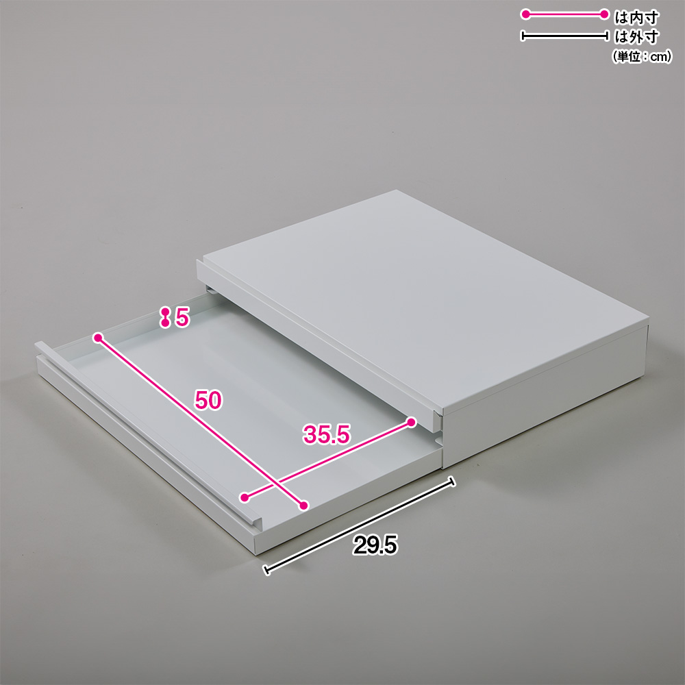 (ア)ホワイト ラップやミトンなどレンジ周りの小物を収納できる内寸高さ約5cmの引き出し付き。(単位:cm)