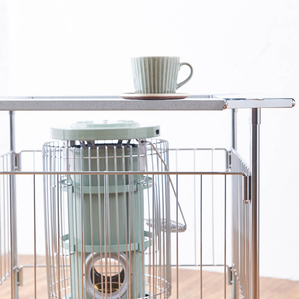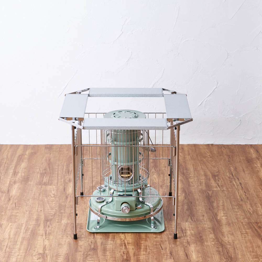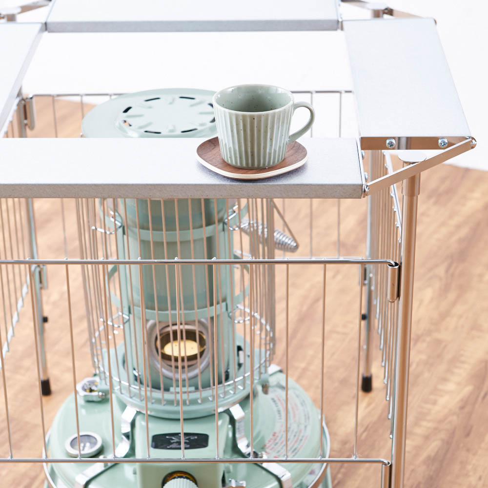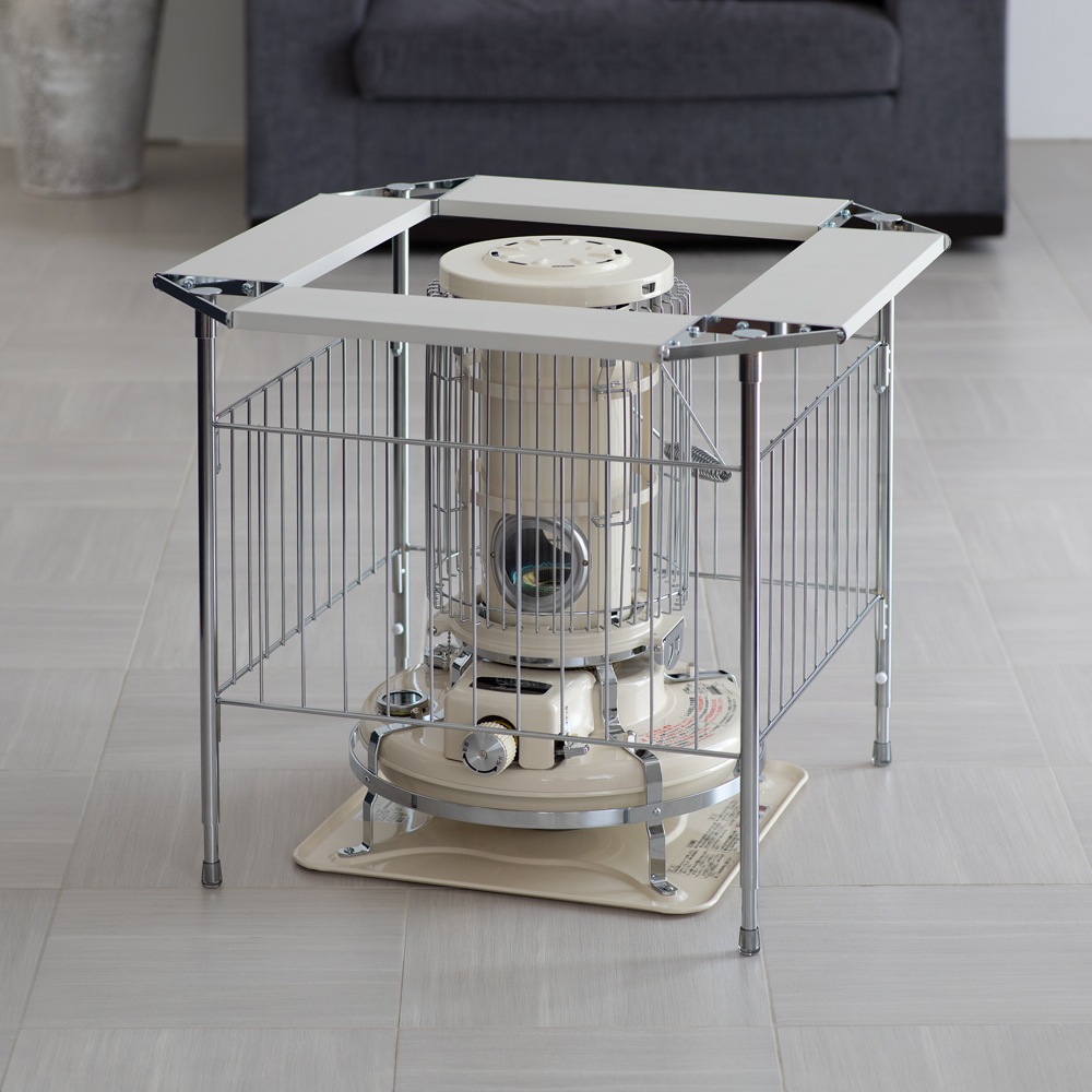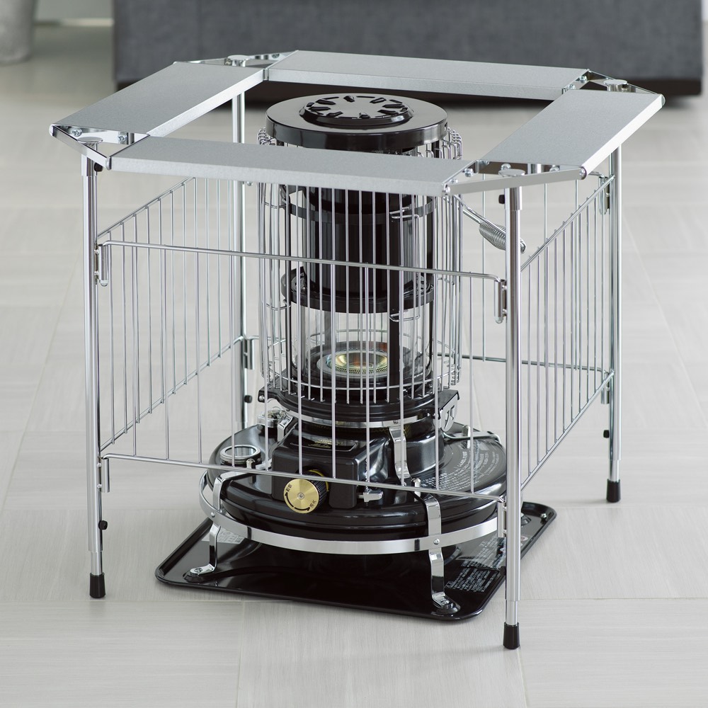 石油ストーブ専用の金属製サークル。ストーブの高さに合わせて、脚部が二段階に伸縮します。冬に石油ストーブが欠かせないご家庭に石油ストーブを使いたいけれど、室内にそのまま置いておくのがちょっと心配、という人も多いはず。カーテンなどの布が揺れて触れたりする可能性を考えると、直接触れないようにガードするものがあると安心です。そこで役に立つのがこのストーブサークル。石油ストーブとセットで検討してみるのもおすすめです。石油ストーブをすっぽりカバースチールにクロムメッキを施したサークルで、格子の幅は10.8センチ。石油ストーブの上からかぶせ、カバーできます。クールでスタイリッシュなデザインなので、お部屋にインテリアとしてもおしゃれになじみます。【ポイント1】ストーブに合わせて脚の長さを調整できる格子の下の脚の部分が空いているのは、ストーブの操作をしやすくするため。サークルをそのつど動かす必要がなく、設置したまま手を入れてストーブのつまみ部分の調節をしたり、給油ができます。さらに、この脚の部分は伸縮式で、使うストーブに合わせて二段階の調整が可能です。【伸ばした場合】本体高さ60cm、パネル下開口高さ22cm【縮めた場合】本体高さ55cm、パネル下開口高17cm※お使いの石油ストーブの操作部の位置、高さを事前にご確認ください。【ポイント2】使わないときは折りたたんで薄く折りたためるので、使わないときはすき間に省スペースにしまえます。【ポイント3】天板耐荷重は2kgまで4面にガルバ鋼板の天板付き。マグカップなどのちょい置きができます