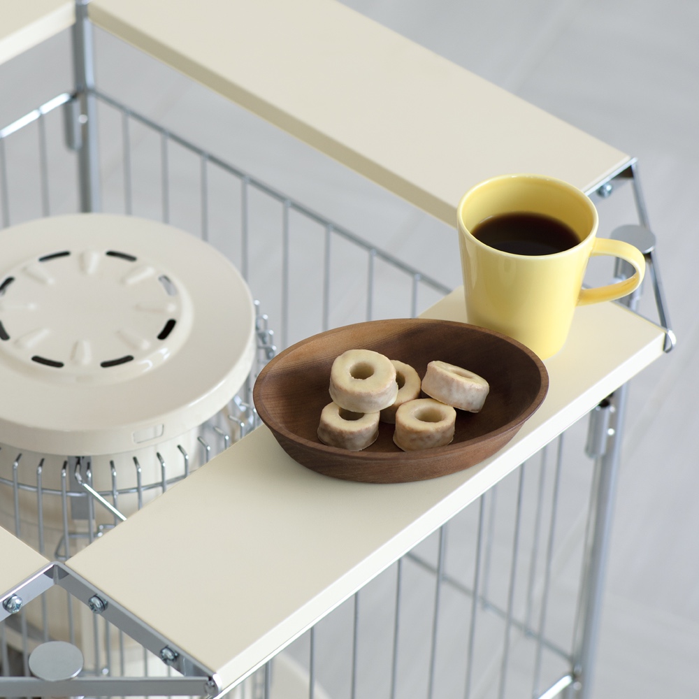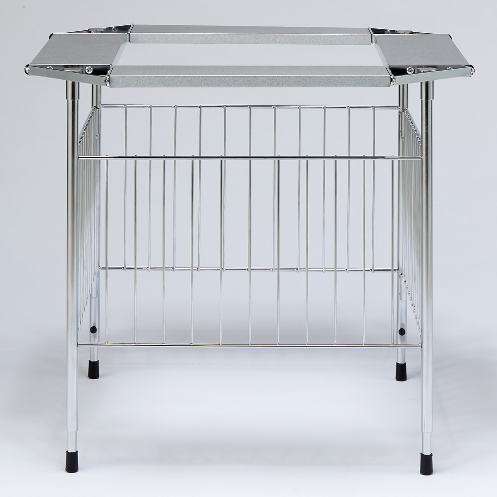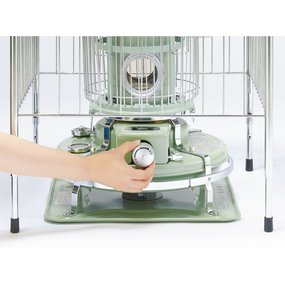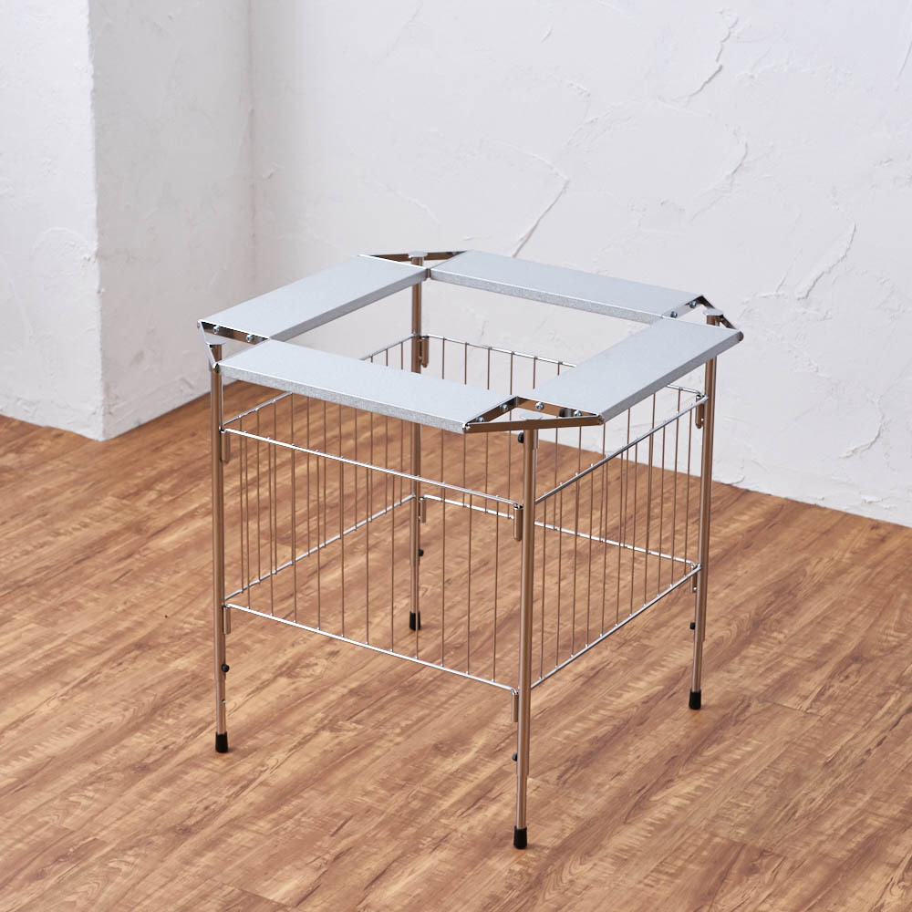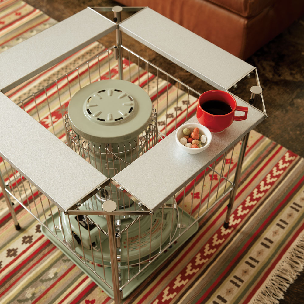 石油ストーブ専用の金属製サークル。ストーブの高さに合わせて、脚部が二段階に伸縮します。冬に石油ストーブが欠かせないご家庭に石油ストーブを使いたいけれど、室内にそのまま置いておくのがちょっと心配、という人も多いはず。カーテンなどの布が揺れて触れたりする可能性を考えると、直接触れないようにガードするものがあると安心です。そこで役に立つのがこのストーブサークル。石油ストーブとセットで検討してみるのもおすすめです。石油ストーブをすっぽりカバースチールにクロムメッキを施したサークルで、格子の幅は10.8センチ。石油ストーブの上からかぶせ、カバーできます。クールでスタイリッシュなデザインなので、お部屋にインテリアとしてもおしゃれになじみます。【ポイント1】ストーブに合わせて脚の長さを調整できる格子の下の脚の部分が空いているのは、ストーブの操作をしやすくするため。サークルをそのつど動かす必要がなく、設置したまま手を入れてストーブのつまみ部分の調節をしたり、給油ができます。さらに、この脚の部分は伸縮式で、使うストーブに合わせて二段階の調整が可能です。【伸ばした場合】本体高さ60cm、パネル下開口高さ22cm【縮めた場合】本体高さ55cm、パネル下開口高17cm※お使いの石油ストーブの操作部の位置、高さを事前にご確認ください。【ポイント2】使わないときは折りたたんで薄く折りたためるので、使わないときはすき間に省スペースにしまえます。【ポイント3】天板耐荷重は2kgまで4面にガルバ鋼板の天板付き。マグカップなどのちょい置きができます