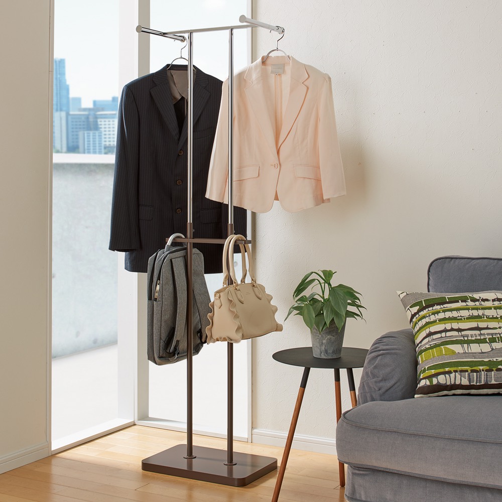 (イ)ダークブラウン 中段のバッグ、小物掛けもとっても便利。ダブルタイプも省スペース。ご家族のちょい掛けハンガーに。 ※商品画像はダブルタイプです。