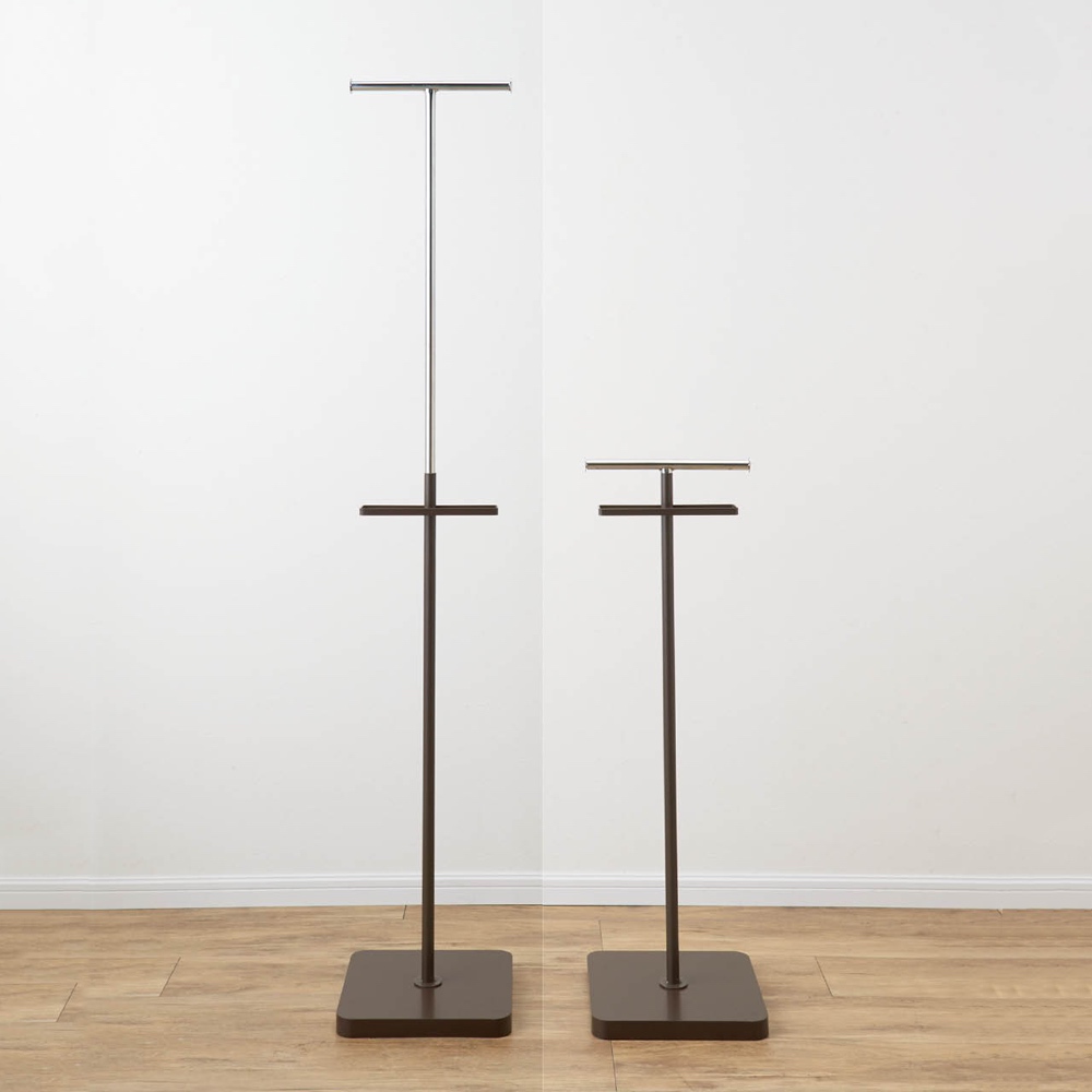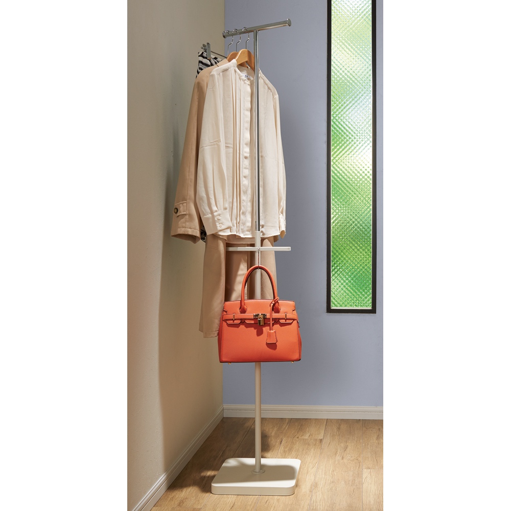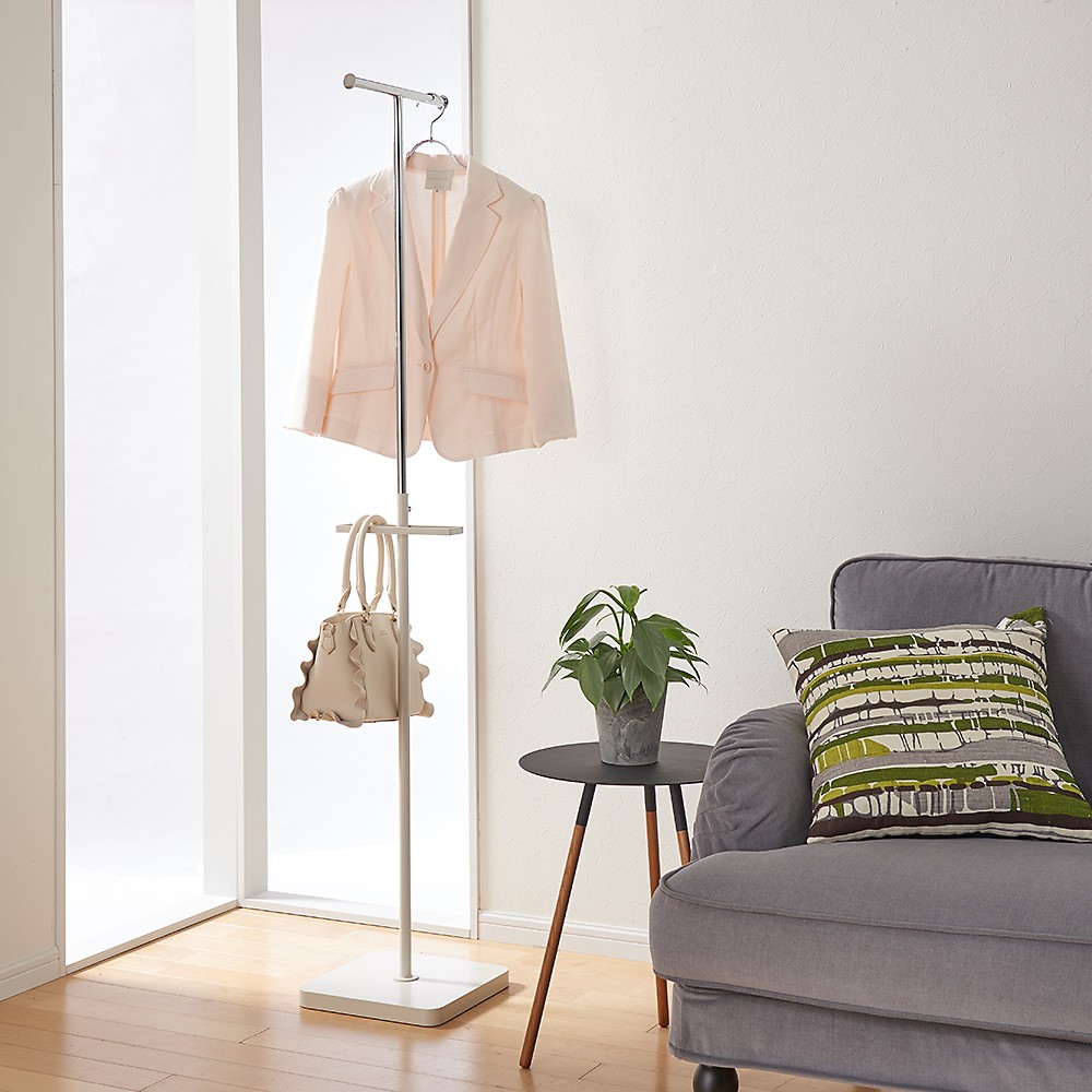 明日のコーデの準備に。あったらいいなと思う場所に。ご家庭に1台は欲しいちょい掛けハンガーラック。ショップにあるような什器を思わせるシンプルモダンデザインで快適オシャレに!ホワイト シングルタイプ省スペース設計の“ちょい掛けハンガー”あったらいいなと思う場所に置ける、まるでショップのようなスタイリッシュなハンガーラック。リビングにおいて普段使いの洋服のハンガーラックとして。クローゼットルームで明日のコーディネート用として。また洗面所前の廊下で洗濯物の一時保管掛け用など、様々な用途に使えます。スッキリと見えながら、しっかりとした造りの国内製造品です。ダークブラウン シングルタイプ ※赤文字は内寸(単位:cm)お部屋のちょっとしたスペースに置けるシングルタイプは幅・奥行どちら30cmで、狭い場所にも置けるサイズ。シリーズ品のダブルタイプは幅48cm、奥行30cm。ご家族の洋服掛けハンガーラックとして活躍します。ベース(床に面する底板)含む本体の色はホワイト、ダークブラウンの2色。ダークブラウン シングルタイプハンガーバーは高さ調節可能高さは最小96.5cm〜最大167.5cmまで調節可能(シングルタイプ・ダブルタイプ共通)。コーディネート例(ダークブラウン シングルタイプ)玄関に置いてコート・バッグのちょい掛けに帰宅直後の一時置き場、ゲストのコート掛けにもおすすめ。 ハンガー1本あたり約5キロの耐荷重なので、重さのある冬物コートも掛けられます。コーディネート例(ホワイト シングルタイプ)※バッグは市販のS字フックを使用して掛けています明日のコーデ準備にクローゼット内に置いて、明日のコーディネート一式をまとめるのにも便利。 たたんで重ねる収納と違い、ひと目で選びやすいので朝の準備が楽になります。ホワイト シングルタイプお子様専用ラックにして、お片付けの習慣を高さを低めに設定して、お子様用のハンガーラックとしてもOK。通学用グッズをまとめて忘れ物防止に。ダブルタイプズレ落ち防止の先端形状ハンガーバーの先端部分は丸形に。洋服がずれ落ちにくい仕様です。バッグやマフラー掛けに便利な小物掛け中段にある長方形の小物掛けもできるハンガーバーには、カバンやリュックはもちろん、マフラー、ストールなども掛けられます。パンツハンガーに掛けたパンツやスカートの置き場としても。小物掛け部分の耐荷重も約5kg。リュックの掛け置きにもリュックのような形のカバン類なら、背負うような形でダイレクトにかけて置くこともできます。ホワイト シングルタイプ移動もラクラクコンパクトで簡単に持ち運べるので、その時置きたい場所に移動することも出来ます。