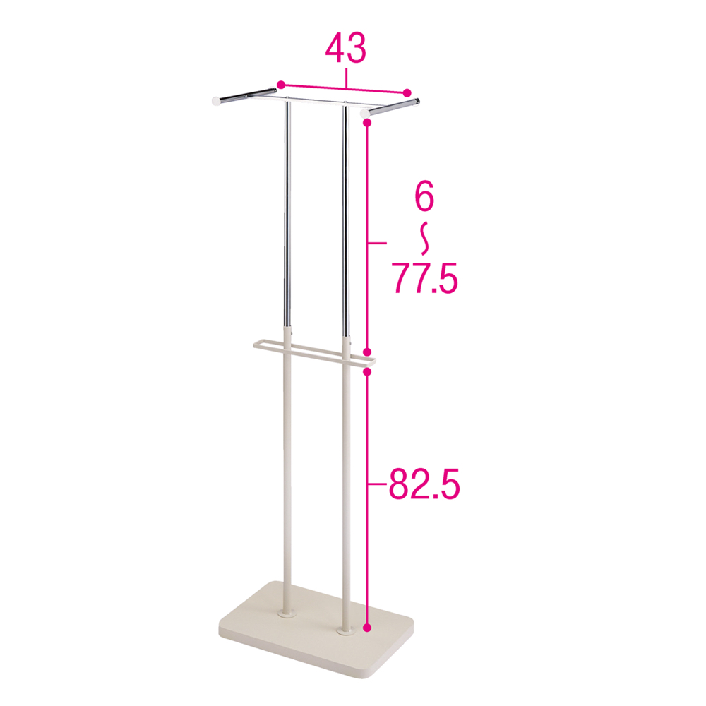 明日のコーデの準備に。あったらいいなと思う場所に。ご家庭に1台は欲しいちょい掛けハンガーラック。ショップにあるような什器を思わせるシンプルモダンデザインで快適オシャレに!ダークブラウン ダブルタイプ省スペース設計の“ちょい掛けハンガー”あったらいいなと思う場所に置ける、まるでショップのようなスタイリッシュなハンガーラック。リビングにおいて普段使いの洋服のハンガーラックとして。クローゼットルームで明日のコーディネート用として。また洗面所前の廊下で洗濯物の一時保管掛け用など、様々な用途に使えます。スッキリと見えながら、しっかりとした造りの国内製造品です。ホワイト ダブルタイプ ※赤文字は内寸(単位:cm)お部屋のちょっとしたスペースに置けるダブルタイプは幅48cm、奥行30cm。ご家族の洋服掛けハンガーラックとして活躍します。シリーズ品のシングルタイプは、幅・奥行どちら30cmでさらにコンパクト。ベース(床に面する底板)含む本体の色はホワイト、ダークブラウンの2色。ダークブラウン シングルタイプハンガーバーは高さ調節可能高さは最小96.5cm〜最大167.5cmまで調節可能(シングルタイプ・ダブルタイプ共通)。コーディネート例(ダークブラウン シングルタイプ)玄関に置いてコート・バッグのちょい掛けに帰宅直後の一時置き場、ゲストのコート掛けにもおすすめ。 ハンガー1本あたり約5キロの耐荷重なので、重さのある冬物コートも掛けられます。コーディネート例(ホワイト シングルタイプ)※バッグは市販のS字フックを使用して掛けています明日のコーデ準備にクローゼット内に置いて、明日のコーディネート一式をまとめるのにも便利。 たたんで重ねる収納と違い、ひと目で選びやすいので朝の準備が楽になります。ホワイト シングルタイプお子様専用ラックにして、お片付けの習慣を高さを低めに設定して、お子様用のハンガーラックとしてもOK。通学用グッズをまとめて忘れ物防止に。ダブルタイプズレ落ち防止の先端形状ハンガーバーの先端部分は丸形に。洋服がずれ落ちにくい仕様です。バッグやマフラー掛けに便利な小物掛け中段にある長方形の小物掛けもできるハンガーバーには、カバンやリュックはもちろん、マフラー、ストールなども掛けられます。パンツハンガーに掛けたパンツやスカートの置き場としても。小物掛け部分の耐荷重も約5kg。リュックの掛け置きにもリュックのような形のカバン類なら、背負うような形でダイレクトにかけて置くこともできます。ホワイト シングルタイプ移動もラクラクコンパクトで簡単に持ち運べるので、その時置きたい場所に移動することも出来ます。