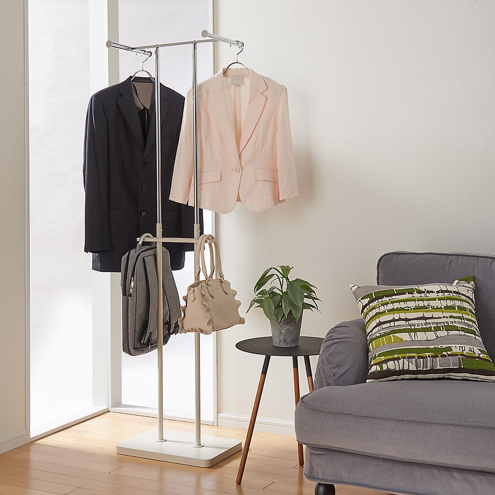 (ア)ホワイト 明日のコーデの準備として。 30cm四方の省スペースで設置が出来るのでクローゼット内に置いてみても。 ※写真のカバンは市販のS字フックを使用しています。 ※写真画像はシングルタイプです。