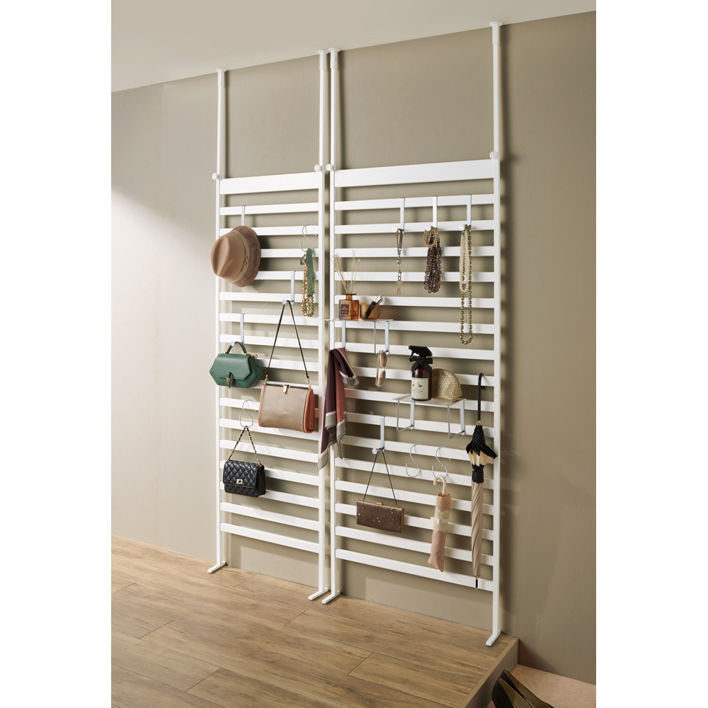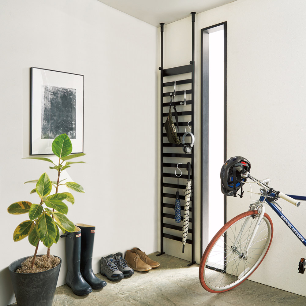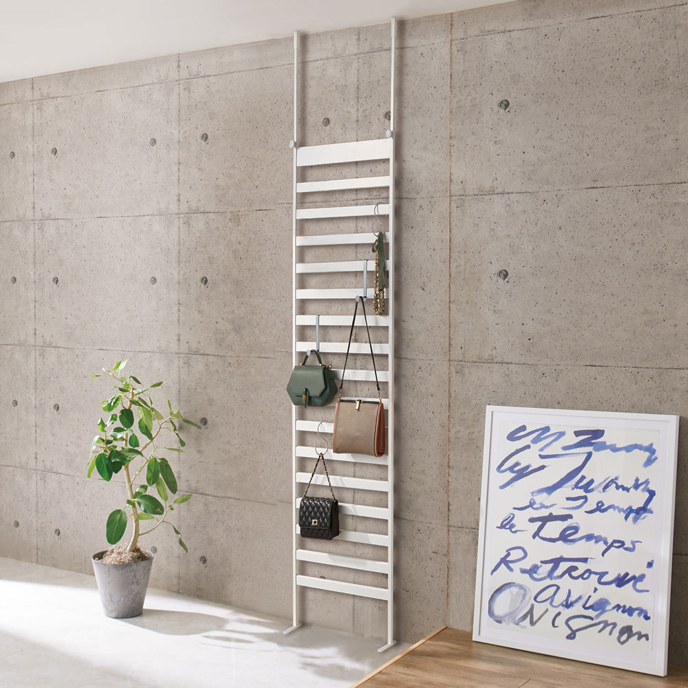 ディスプレイハンガーで玄関収納を素敵なインテリアに。薄型の突っ張り式で、狭い玄関でも省スペースで壁面収納・衣類収納ができるスチール製ハンガーラック。玄関小物&雑貨置き台としても使えるアイデア商品です。〜おしゃれな玄関インテリアを演出するディスプレイ壁面収納ハンガー〜◆コートやマフラー、帽子、バッグ、ネクタイ、ベルトからアクセサリーなどをひとまとめに壁掛け収納できます。◆収納に困る物を壁面に吊るしてまるでショップのようにおしゃれに収納できます。◆ひと目で確認できるから出かける間際の最終コーディネートにも便利です。◆玄関先にまとめておけば探し回る手間もかかりません。〜狭い玄関に便利なアイデア収納ハンガーラック〜◆デッドスペースになりがちな廊下や玄関の壁面を有効活用できる、ポールハンガーのような突っ張りハンガーラック。◆奥行たった11.5cmの薄型の省スペースサイズで狭い玄関などさまざまな場所で大活躍します。◆ボーダーのシンプルなデザインは下駄箱・シューズボックス脇だけではなく、寝室やリビングルームにもオススメです。◆天井高さは約191〜264.5cmまで対応(お部屋の梁にも設置できます)。〜別売り追加パーツで使い方広がる〜◆専用のアクリル棚を追加すれば、小物を置く台として使えます。◆追加用L字フック(5個組)を使えばさらにたくさん洋服や小物をかけられます。