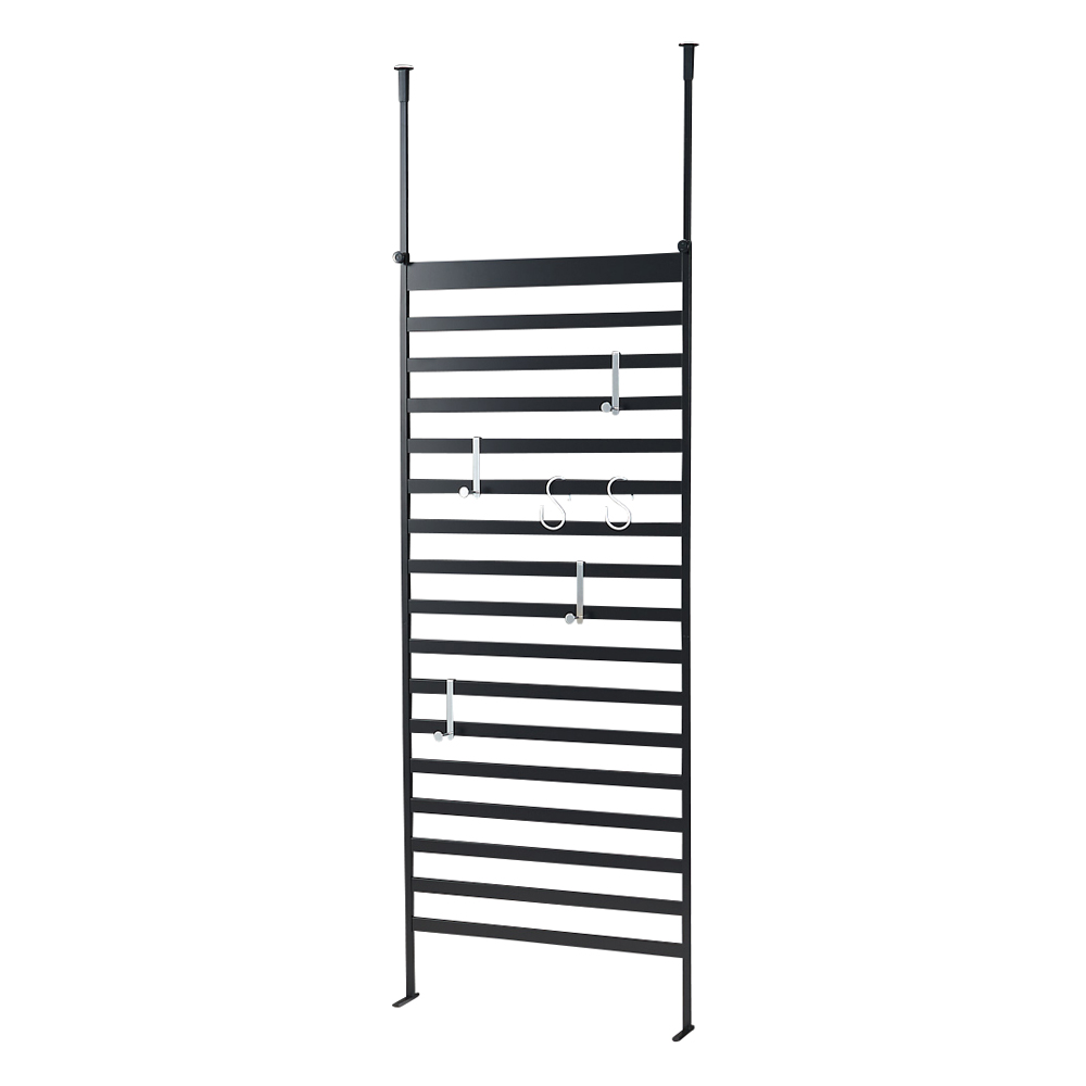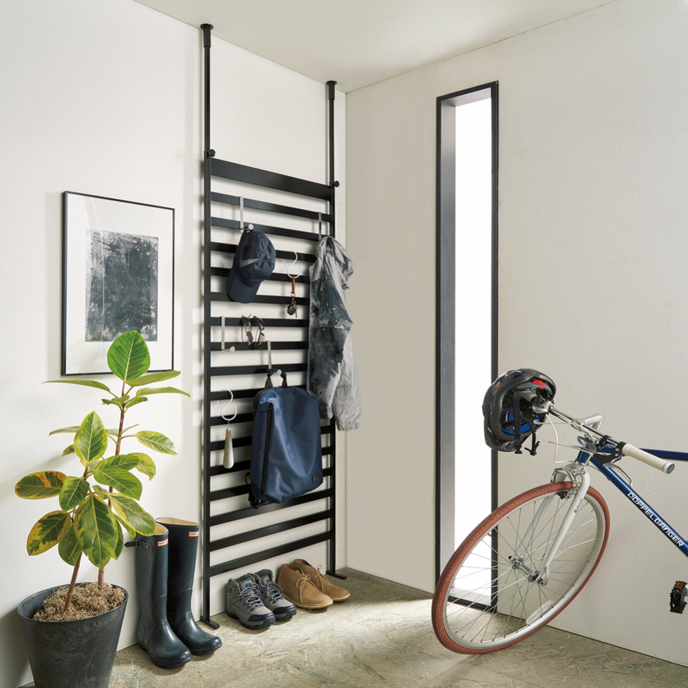 ディスプレイハンガーで玄関収納を素敵なインテリアに。薄型の突っ張り式で、狭い玄関でも省スペースで壁面収納・衣類収納ができるスチール製ハンガーラック。玄関小物&雑貨置き台としても使えるアイデア商品です。〜おしゃれな玄関インテリアを演出するディスプレイ壁面収納ハンガー〜◆コートやマフラー、帽子、バッグ、ネクタイ、ベルトからアクセサリーなどをひとまとめに壁掛け収納できます。◆収納に困る物を壁面に吊るしてまるでショップのようにおしゃれに収納できます。◆ひと目で確認できるから出かける間際の最終コーディネートにも便利です。◆玄関先にまとめておけば探し回る手間もかかりません。〜狭い玄関に便利なアイデア収納ハンガーラック〜◆デッドスペースになりがちな廊下や玄関の壁面を有効活用できる、ポールハンガーのような突っ張りハンガーラック。◆奥行たった11.5cmの薄型の省スペースサイズで狭い玄関などさまざまな場所で大活躍します。◆ボーダーのシンプルなデザインは下駄箱・シューズボックス脇だけではなく、寝室やリビングルームにもオススメです。◆天井高さは約191〜264.5cmまで対応(お部屋の梁にも設置できます)。〜別売り追加パーツで使い方広がる〜◆専用のアクリル棚を追加すれば、小物を置く台として使えます。◆追加用L字フック(5個組)を使えばさらにたくさん洋服や小物をかけられます。