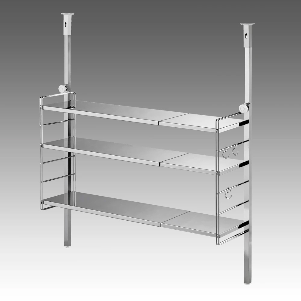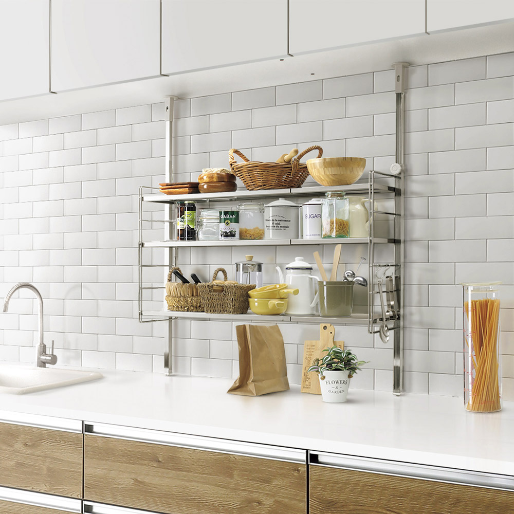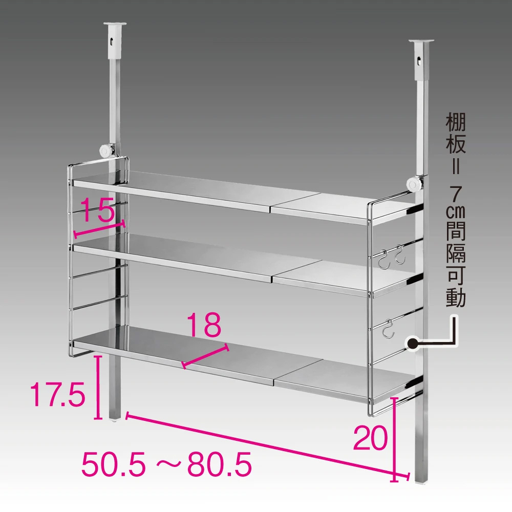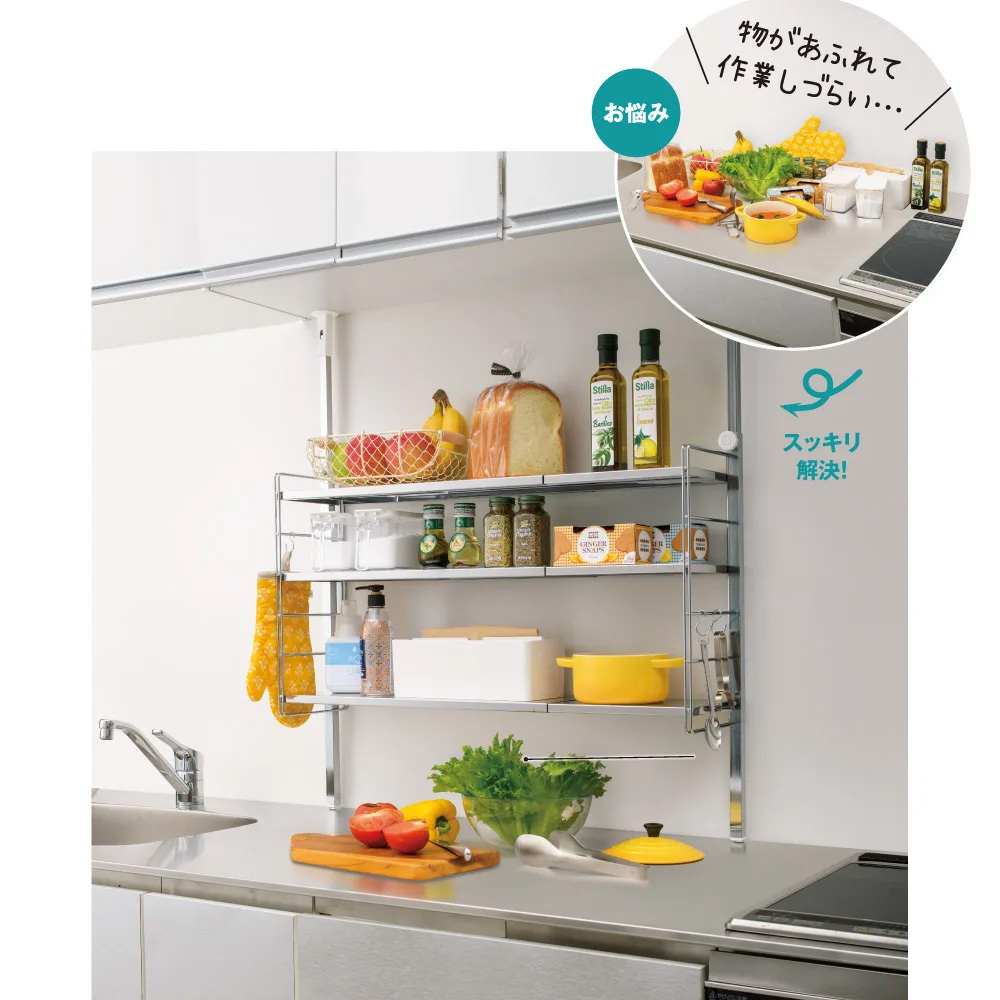 置きたい場所に合わせて幅伸縮し、収納場所と作業スペースを同時に確保できる便利ラック。突っ張り式で手前に脚が出ない分、棚板下の空間も作業スペースとして有効に使えます。一番欲しい場所に、邪魔にならない収納棚をプラス●キッチンのスペースに合わせて幅60cm〜90cmに幅伸縮。3段の棚にたっぷり収納できます。●シンクとコンロの間の壁際にも、吊戸棚下にも簡単に設置できます。調味料やキッチンペーパー・ラップなど、よく使うものが手の届く場所に置けて、作業もスムーズに。●扉がなく出し入れがしやすいので、小鍋やボウルなどを置けば、調理の時短にもつながります。●突っ張り式なので、脚部が手前に出っ張らず省スペース。棚下の空間も作業スペースとして有効利用できます。安定感のある突っ張り式で、設置もラクラク●高さ75cm〜110cmの範囲で、天井やレンジフード・吊戸棚などに突っ張るだけ。ネジ・クギ不要で、キッチンの壁や天井を傷つけません。●高さ調節部のつまみを回して取り付けたい場所に突っ張って固定し、サイドバーに棚板をのせれば設置完了です。●突っ張り部が左右別々に伸縮するので、高さの異なる場所にも設置可能。●吊り戸棚とレンジフードの高さに段差があっても取り付けられます(レンジフードの形状によっては、コンロまわりに設置できない場合があります)。●棚板耐荷重は1枚当たり約3kg。フレームは丈夫なスチール製です。使いやすく、お手入れも簡単です●棚の奥行は19cm。スパイス類や調理器具などが出し入れしやすく収納でき、小鍋や食器のちょい置きにも便利。●棚板は7cm間隔で簡単に高さ調節でき、置く物に合わせて効率のよい収納ができます。●S字フック3個付きで、軽量スプーンやトングなどのキッチンツールが吊るせます。布製の鍋敷きやミトン掛けにも便利。●棚板は水や熱に強く、汚れもサッと拭きとれるステンレス製。丸洗いもできて清潔が保てます。●丈夫で丁寧なつくりの日本製です。設置スペースや収納量に合わせて以下の4タイプから選べます・棚板2段・幅40cm〜60cm伸縮タイプ・棚板2段・幅60cm〜90cm伸縮タイプ・棚板3段・幅40cm〜60cm伸縮タイプ・棚板3段・幅60cm〜90cm伸縮タイプ●高さはすべて75cm〜110cmに調節可能。