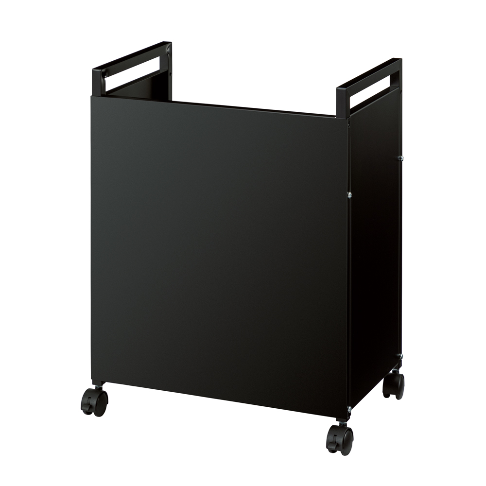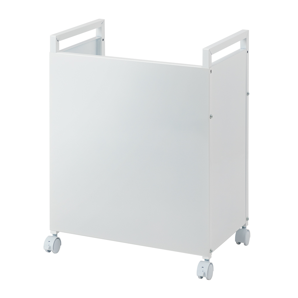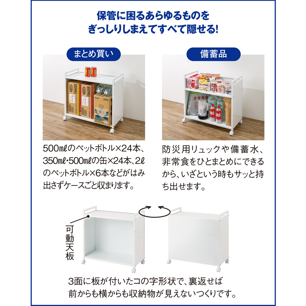キッチンの床に置いてごちゃつく米袋や飲料ケースがすっきり収まり、移動もできる、動く収納庫。キャスター&サイドパネル付きで、クルッと回せば生活感を丸ごと目隠し!キッチンだけでなく、リビングや書斎、子供部屋などあらゆるエリアで活躍します。ホワイト 左:大 幅65cm、右:小 幅50cmスッキリ収納、目隠しも移動もできるワゴン重い物もかさばる物もおまかせ。収納場所が少なく「とりあえず置く」が常態化しているキッチンが片付く有能ワゴン。キャスター&サイドパネル付きで、クルッと回せば生活感を丸ごと目隠し。総耐荷重約50kg(耐荷重試験は100kgをクリア)の頑丈設計で、物を載せたままスムーズに移動もできます。小 幅50cm(お届け商品)カラーはホワイト・ブラックの2色幅50cm(小)と65cm(大)の2タイプ。どちらも奥行34cm、高さ61cm。カウンター下にも収まるサイズで、キッチンだけでなくリビングや書斎、子供部屋などでも活躍。ホワイト小幅50cmごちゃつくキッチンを整理整頓鍋や調味料などをすっきり収納。壁際に置いて、使うとき手元に移動すれば調理の時短に。食品ストックを奥深くに収納せず「見える化」することで、賞味期限切れや買い過ぎも防ぎます。クルッと回して生活感を目隠し3面にパネルが付いたコの字形状。裏返せば、前からも横からも収納物が見えないつくり。目隠し収納できるので、キッチンやダイニングの見映えもアップ。ブラック 左:小幅50cm、右:大幅65cm置き場に困る物の収納にリビングでミシンやアイロン、掃除用品などを下段にひとまとめにし、天板上はティッシュやリモコンの指定席に。通路を防ぐ床置きの邪魔物を整理でき、通りにくかった動線もしっかり確保。ホワイト大幅65cm書類収納、デスク使いも下段にファイルや書類を並べ天板にノートパソコンを置いて、テレワークにも。使用後はダイニングテーブル下にしまえます。雑誌や本を並べ、動かせる書棚としての利用も。新聞・雑誌を外から見えないように保管し、回収日には玄関先までそのまま移動すればラク。ストック品・防災用の備蓄収納にストック類、ふるさと納税で届く食材入りの段ボールなどをまとめて収納。防災用リュックや備蓄水・非常食をまとめておけば、いざというとき役立ちます。天板の耐荷重は約10kg。土鍋や鋳物鍋など重量のある調理器具の置き場にも。下段棚の耐荷重は約40kg。お米の袋やウォーターサーバーの予備、350ml・500mlの缶・ペットボトル飲料24本入り、2リットル飲料6本入りの段ボールなどがケースごと載せられます(有効内寸:幅44cm 奥行30cm、高さは34cmか46cmに調節可)。高さ調節可能&お手入れ簡単な天板天板の位置は12cm間隔で2段階に調節可。天板を低くした場合は、缶詰などが安定感よく並べられ、反対側から見るとちょうど隠れる高さになります。また、天板は熱や水、汚れに強いスチール(メラミン焼付塗装)でお手入れもラク。熱い鍋などが置け、前面・側面にマグネットもつけられます。両サイドの持ち手で移動・回転がラク便利なキャスター付き掃除の時の移動がスムーズ。重い物を持ち運ぶ労力も省けます。キャスターはストッパー(4個中2個)付きで、動かさない時はしっかり固定。