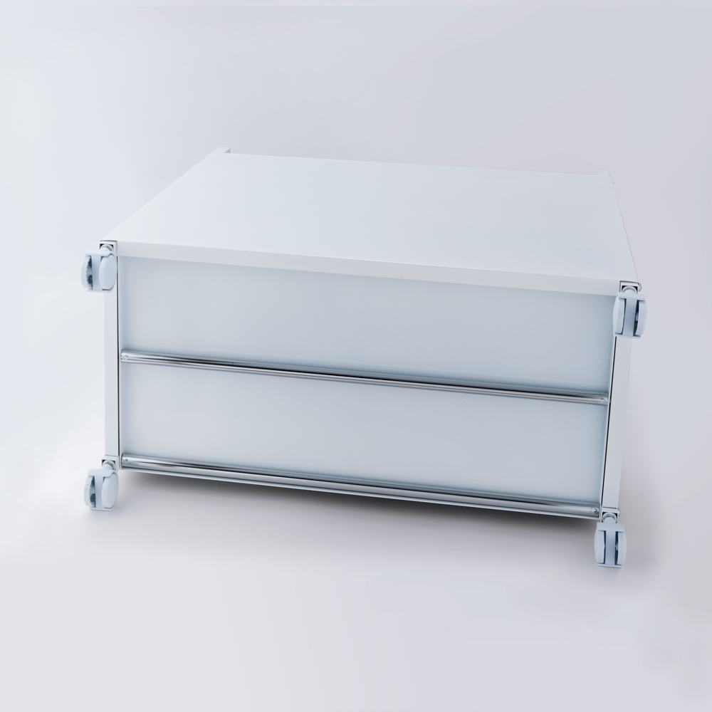 使用イメージ(ア)ホワイト 【テレワークに】書類やファイルを入れてダイニングテーブルの近くでデスク使いもでき、使用後はテーブル下にしまえます。ソファに座ってパソコン作業をするのにもちょうどいい高さです。 ※写真は別売りの大タイプです。