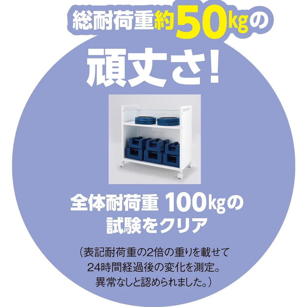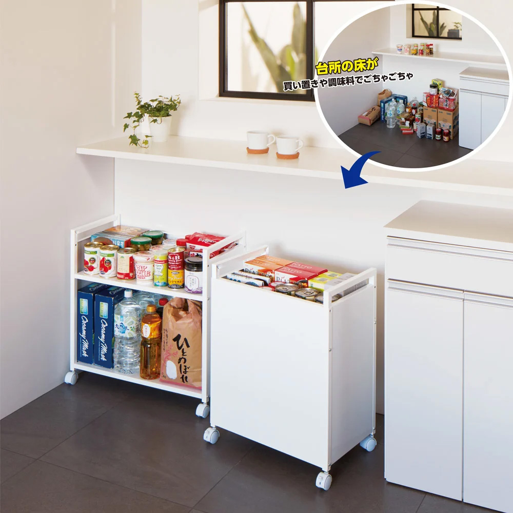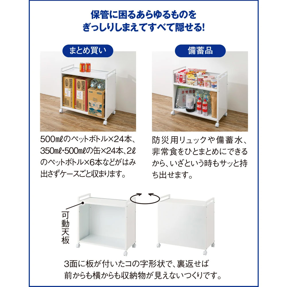 キッチンの床に置いてごちゃつく米袋や飲料ケースがすっきり収まり、移動もできる、動く収納庫。キャスター&サイドパネル付きで、クルッと回せば生活感を丸ごと目隠し!キッチンだけでなく、リビングや書斎、子供部屋などあらゆるエリアで活躍します。ホワイト 左:幅65cm、右:幅50cmスッキリ収納、目隠しも移動もできるワゴン重い物もかさばる物もおまかせ。収納場所が少なく「とりあえず置く」が常態化しているキッチンが片付く有能ワゴン。キャスター&サイドパネル付きで、クルッと回せば生活感を丸ごと目隠し。総耐荷重約50kg(耐荷重試験は100kgをクリア)の頑丈設計で、物を載せたままスムーズに移動もできます。カラーはホワイト・ブラックの2色幅50cmと65cmの2タイプ。どちらも奥行34cm、高さ61cm。カウンター下にも収まるサイズで、キッチンだけでなくリビングや書斎、子供部屋などでも活躍。ホワイト幅50cmごちゃつくキッチンを整理整頓鍋や調味料などをすっきり収納。壁際に置いて、使うとき手元に移動すれば調理の時短に。食品ストックを奥深くに収納せず「見える化」することで、賞味期限切れや買い過ぎも防ぎます。クルッと回して生活感を目隠し3面にパネルが付いたコの字形状。裏返せば、前からも横からも収納物が見えないつくり。目隠し収納できるので、キッチンやダイニングの見映えもアップ。ブラック 左:幅50cm、右:幅65cm置き場に困る物の収納にリビングでミシンやアイロン、掃除用品などを下段にひとまとめにし、天板上はティッシュやリモコンの指定席に。ホワイト幅65cm書類収納、デスク使いも下段にファイルや書類を並べ天板にノートパソコンを置いて、テレワークにも。使用後はダイニングテーブル下にしまえます。雑誌や本を並べ、動かせる書棚としての利用も。ストック品・防災用の備蓄収納にストック類、ふるさと納税で届く食材入りの段ボールなどをまとめて収納。防災用リュックや備蓄水・非常食をまとめておけば、いざというとき役立ちます。天板の耐荷重は約10kg。土鍋や鋳物鍋など重量のある調理器具の置き場にも。下段棚の耐荷重は約40kg。お米の袋やウォーターサーバーの予備、350ml・500mlの缶・ペットボトル飲料24本入り、2リットル飲料6本入りの段ボールなどがケースごと載せられます(有効内寸:幅44/59cm 奥行30cm、高さは34cmか46cmに調節可)。高さ調節可能&お手入れ簡単な天板天板の位置は12cm間隔で2段階に調節可。天板を低くした場合は、缶詰などが安定感よく並べられ、反対側から見るとちょうど隠れる高さになります。また、天板は熱や水、汚れに強いスチール(メラミン焼付塗装)でお手入れもラク。熱い鍋などが置け、前面・側面にマグネットもつけられます。両サイドの持ち手で移動・回転がラク両サイドの持ち手を使えば、収納したままでも移動や回転がラク。天板に置いた物の落下防止やS字フックを掛けるなど、何かと便利に使えます。便利なキャスター付き掃除の時の移動がスムーズ。重い物を持ち運ぶ労力も省けます。キャスターはストッパー(4個中2個)付きで、動かさない時はしっかり固定。
