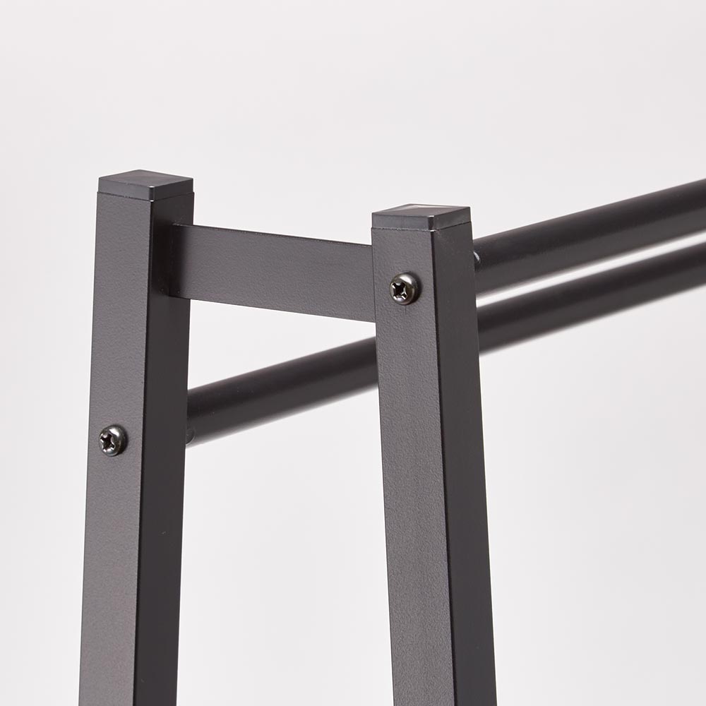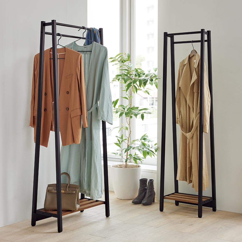 空間に圧迫感を与えない無駄のないシルエットのハンガーに収納力がアップしたダブルタイプが登場。使用頻度や小物など前後に分けてさらに収納しやすく。空間に圧迫感を与えない無駄のないシルエットのハンガー、さらに収納力がアップした「ダブルタイプ」が登場。■ダブルタイプのバーでさらに収納しやすく収納力がアップしたバーは使用頻度や小物など、前後に分けてさらに収納がしやすく。さらに前後に高さを変えて設置しているので、後ろにかけたコート類も取り出しやすいつくりです。■頑丈なだけでなく、おしゃれなハンガーお客様の声にお応えして生まれた頑丈ながらスタイリッシュに仕上げたハンガーラック。80cm幅ならコーディネートで選びたいコートや羽織など満足に掛けられるサイズ。スリムなAライン設計なので圧迫感のないつくりです。壁に沿わせて設置すればおしゃれな店舗のような空間に。■掃除しやすい設計棚の下には約10cmの空間があるので、お掃除もラク。おしゃれながら掃除しやすいので、玄関に、ウォークインクローゼットのスペースに、寝室になど場所を選ばずに活躍してくれます。