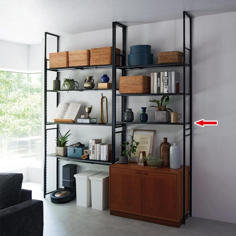 コーディネート例(ア)ブラック 【奥行29.5cmの薄型】家具上が暗くならず、圧迫感なく置ける薄型です。 ※このページで購入できる商品は追加用の伸縮棚です。