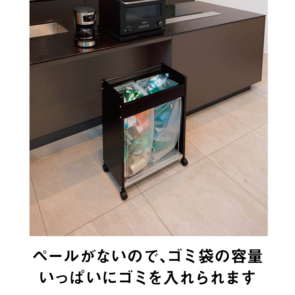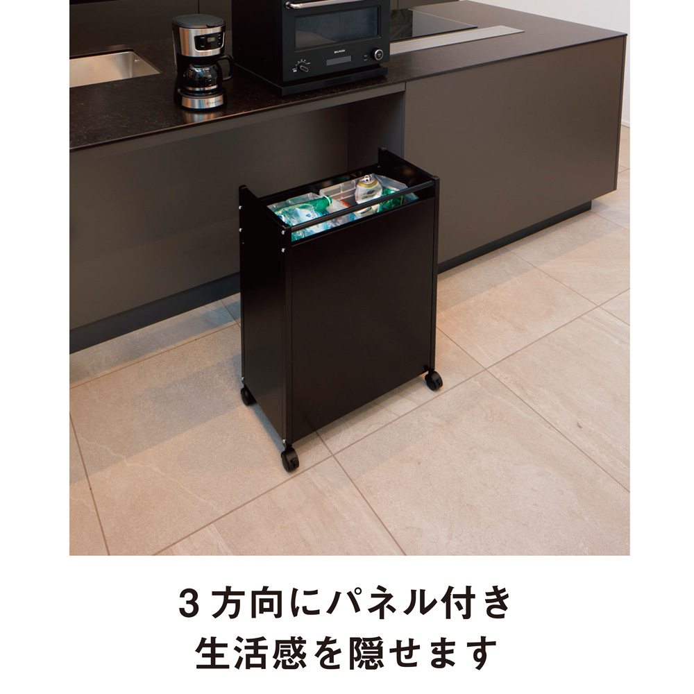 使用イメージ(イ)ブラック 3方向にパネル付きで、カウンター下などに置いても生活感を隠せます。 ※写真は別売りの70リットルタイプです。70リットルタイプには30リットルのゴミ袋が2つ掛けられます。