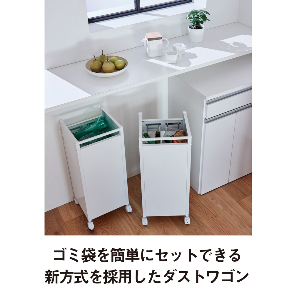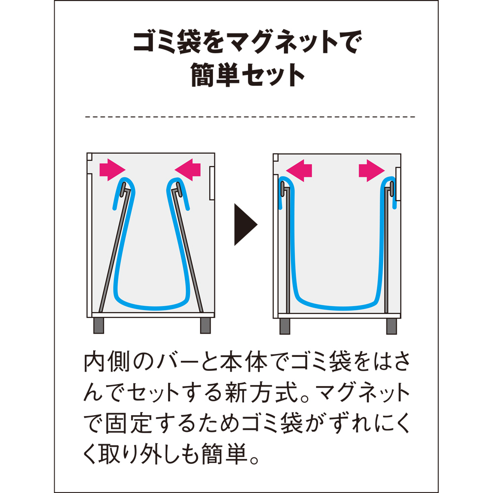 いろいろな形、サイズのゴミ袋がマグネットで簡単に掛けられる新方式のダストワゴン。大容量ゴミ袋も持ち手のあるレジ袋も掛けられ、分別使いもゴミ袋の交換も簡単で、ゴミにまつわるストレスがグッと軽減します。バーとマグネットでゴミ袋を固定する新方式を採用。●内側のバーと本体でゴミ袋をはさみ、マグネットで固定する新方式を採用。●持ち手のないゴミ袋でもズレにくく、取り付け、取り外しも簡単です。●持ち手のあるレジ袋も掛けられるので、分別使いもできます。●底板に予備のゴミ袋を置いておけば、サッと交換できます。●丈夫で汚れに強いスチールとガルバリウム鋼板を使用。汚れても簡単に拭き取れます。シンプルなデザインでキッチンの生活感を一掃。●シンプルなデザインで、どんなインテリアにもマッチします●3方向にパネル付きで、カウンター下などに置いても生活感がありません。●背面はゴミ出しやゴミ袋の交換がしやすいオープン仕様。●ペールがないため袋の容量いっぱいにゴミを入れることができます。●掃除が必要な部分が少ないので、清潔感が長持ちします。ゴミの量、スペースに合わせて選べる3タイプ●30L、45L、70Lの3タイプをご用意。複数のゴミ袋を掛けて分別使いも可能です。●一般的な45Lゴミ袋が掛けられ、分別使いもできる、使いやすいサイズです。●キャスター付きで、ゴミがたくさんたまっていても移動はスムーズ。掃除の時も邪魔になりません。●調理中はシンクの近くに移動すれば、サッと捨てられて効率的です。●食材は週末にまとめ買い、飲料はネットショップで注文といったライフスタイルで、ゴミがたくさん出るので保管場所を確保したい、ゴミ袋の交換ストレスを減らしたいというご家庭にぴったりです。