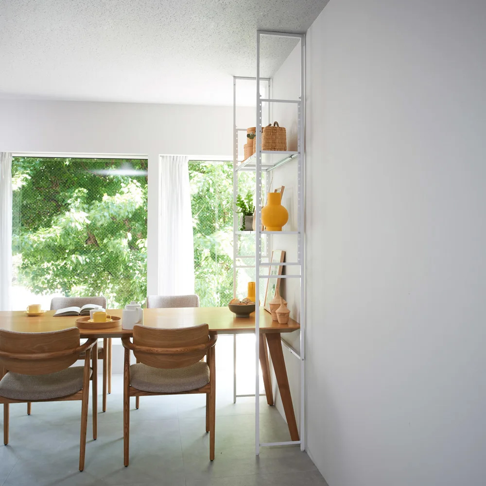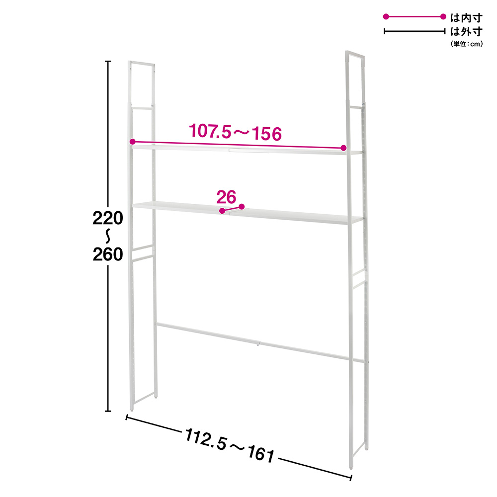 家具上の無駄な空間に棚を配置し、収納スペースを増やせる幅伸縮ラック。突っ張り式で天井近くまで利用でき、どんなインテリアにもなじむルックスです。ホワイト 2段 幅112.5cm〜161cm(お届け商品)※赤文字は内寸(単位cm)家具上の空間を活用できるスマートな伸縮ラック家具の上のデッドスペースを、収納棚として活かせるスチールラック。幅が伸縮するので、お手持ちの家具上にフィットします。床から天井まで広く使える突っ張り式。脚部には水平調整が可能なアジャスター付きです。使用例:ホワイト 2段 幅112.5cm〜161cm (天井高さ240cm)インテリアに馴染み、幅広く使えるフレームと棚の上面が同色なので、スチール棚にありがちなギラギラ感が少なく落ち着いた印象に。どんなお部屋にも合い、本やDVDを並べたり(側板がないのでブックエンドをご使用ください)、趣味の物を飾るなど幅広い用途で使えます。家具上だけでなく、床から天井までの範囲を広く使ってもOK。下部のオープン部に掃除機やゴミ箱などを直置きできます。使用例:ホワイト 2段幅81cm〜126cm(天井高さ240cm)家具の近くに設置して棚のように使えるリビングやダイニングでの使用、子ども部屋のデスク上にもおすすめ。チェストやサイドボードの上にも設置できます。ダイニングテーブルに設置すれば棚のように使用できて、ティッシュケースやカトラリーなどが手に取りやすくなります。左からホワイト、ブラックスッキリ見えて便利なオープンタイプ奥行き29.5cmと薄型のオープン棚なので、家具の上が暗くならず開放感があります。背板が無いので、コンセントやスイッチをふさがずに設置でき便利。色は明るく清潔感のあるホワイト、シックなインテリアにも似合うブラックの2色。場所に合わせてフレーム幅を調整できる幅が112.5cm〜161cmに伸縮するので、置きたい場所にぴったり設置できます。天井に合わせた高さにできる高さは220cm〜260cmの範囲で調節できます。天井突っ張り部はポールではなく、スマートなコの字型。伸縮式に見えづらいスタイリッシュなデザイン。固定用ネジが目立たない幅伸縮式のラックは、伸縮部をつまみで固定をする場合が多く、つまみが収納スペースを圧迫しがち。本商品は頭の小さいネジで固定するため、ネジが外から見えづらく、収納有効スペースも減りません。棚板の高さ調節OK棚板は4cm間隔で高さ調節できます。床から9cm〜101cm、114cm〜206cmの範囲に設置可能です。棚板の奥行は26cmで、一般的な収納ボックスが収まるサイズです。頑丈な設計棚板1枚当たりの耐荷重は約20kg。たっぷり収納できる頑丈な設計です。※写真は幅伸長時選べるサイズと追加棚2段タイプ(幅2種)、4段タイプをご用意。・棚2段 幅81〜126cmタイプ(棚板2枚)・棚4段 幅81〜126cmタイプ(棚板4枚)・棚2段 幅112.5〜161cmタイプ(棚板2枚)別売りの追加伸縮棚は1枚から購入できます。・幅76〜122cmタイプ・幅107.5〜156cmタイプ