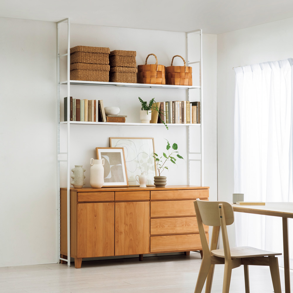棚板1枚当たりの耐荷重約20kgの頑丈仕様。別売りの追加用の棚もあります。
