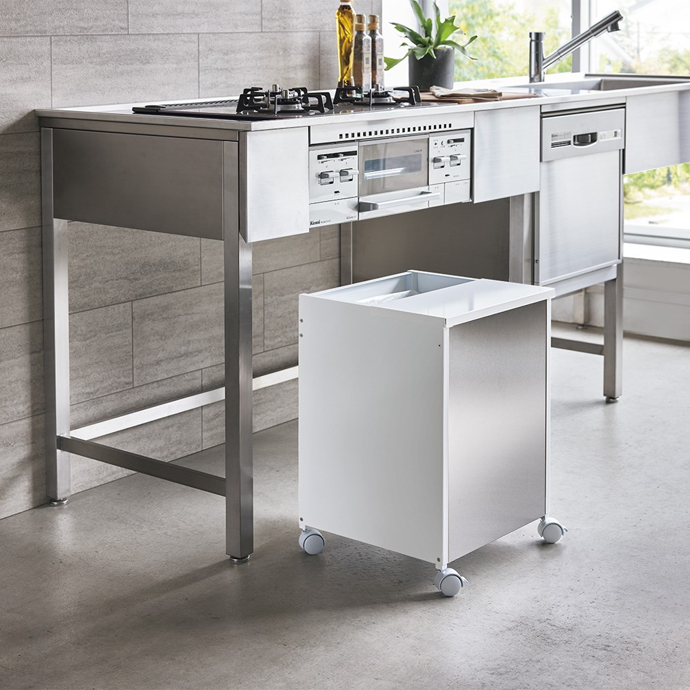 (イ)ホワイト ゴミが見えにくく、捨てやすい、ステンレス仕様のダストワゴン。調理中はシンクの近くに移動すれば、サッと捨てられて効率的です。 ※写真は45リットルのゴミ袋を1つ装着しています。