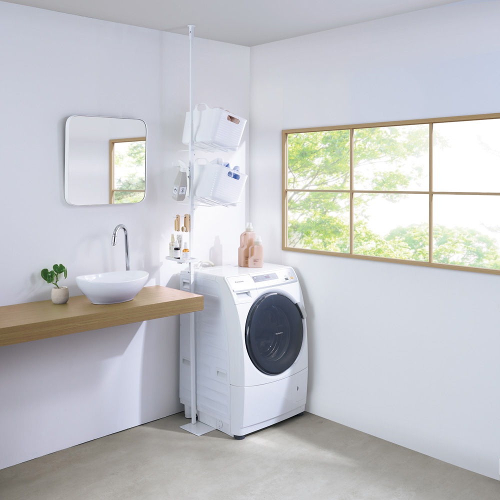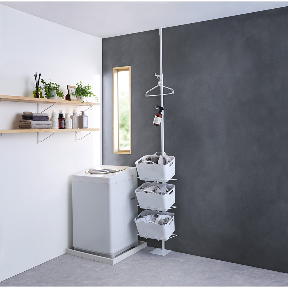 狭い脱衣所でも大丈夫! これまで床に置いていた脱衣カゴひとつ分のスペースで、洗濯物や洗剤、洗濯小物までたっぷり収納できます。高さも配置も自由に、“上の空間”を有効活用できるスペパカグ(※)。(※)スペパカグはスペース・パフォーマンスをガンガンUPさせる家具の新ジャンル。株式会社dinosの登録商標です。1本脚の天井突っ張り式で、“上の空間”を有効活用●床置きした脱衣カゴの上、ぽっかり空いていませんか? それなら、見逃し空間をムダなく活用できる「スペパカグ」で、スペース・パフォーマンスをガンガンUPさせましょう。●天井に突っ張るだけの簡単設置で、空間を何倍も有効活用できるランドリーバスケットです。●天井高196cm〜263cmの範囲で無段階に調節できるので、天井の梁下にも対応。突っ張りパイプはバネ入りで、しっかり固定できます。●バスケットやフックは組立時に、無段階で高さ調節可能。●お子さまのいるお家はバスケットを低く。また、高い位置にバスケットを固定して洗濯機の上の空間を活用するなど、ご家庭に合わせた配置や使い方ができます。●脚部はつまずきにくい薄型のパネル状だから、足元も安心でお掃除もラクラク。●シンプルで清潔感のあるデザインなので、毎日気持ちよく使えます。狭いランドリールームでも少ないスペースで設置OK●設置に必要な床面積は、およそ脱衣カゴひとつ分。省スペースでたっぷり収納できます。●ほぼ同容量のワゴンタイプと比べ、奥行をとらないので圧迫感も軽減。●壁際のほか、洗面所と洗濯機の狭いすき間などにも設置可能。●すき間に設置する際は、バスケットは右側に、フックは左側になど、それぞれ使いやすい向きにも設定できます。容量たっぷりのバスケットは使い勝手抜群●ご家庭に合わせて選べるよう、バスケット2個タイプから4個タイプまで3タイプのシリーズをご用意。●バスケットはやや斜めの角度に固定できて中が見やすく、洗濯物の出し入れもスムーズ。●便利な持ち手付きで、洗濯物の分別から干し場への移動まで活躍します。●脱衣カゴとして、またタオル入れや洗剤の収納などさまざまな用途に使えて重宝します。●バスケットは水に強いポリエチレン製。汚れても洗えてお手入れが簡単です。いろいろ使えて、あると助かるフック付き●ハンガーに掛けた衣類のちょい掛けに。●洗濯ネットや小物干しハンガーなどを掛けておけば、さっと使えて便利。●使用途中のスプレー洗剤なども、ちょっと引っ掛けておけます。別売のトレーをプラスすれば、さらに便利に●内寸幅21.5cm、奥行9cmの程よいサイズのトレーを別売でご用意。●入浴時にスマートフォンや外したアクセサリーなどを置いたり、洗濯前の衣類のポケットから出てきた小物や小銭などの一時置きにも便利です。●トレーも組立時にお好きな高さに固定可能。●落下防止用の縁付きで、小さなピアスなどの落下も防ぎます。こんな使い方もおすすめ●脱衣所で家族1人ずつバスケットを分けて、タオルやパジャマ、着替えの収納に。●ウォークインクローゼットなどで、一度着ただけでは洗わないニットやデニムなどの置き場に。●散らかりがちな子どものおもちゃ入れに。信頼と安心の国内生産品●国内の工場で作られた安心の日本製。●細部まで配慮された丁寧な仕上げなど、品質の高さは国産品だからこそ。●毎日過ごす場所にはストレスなく使えるものを、とお考えの方におすすめします。暮らし方が変わっても長く使える●引っ越しなどで室内環境が変化しても、設置場所を選ばない突っ張り式なら新居でも活躍。●生活スタイルに合わせた使い方ができて長期間使えるので、コスパも抜群です。シリーズ商品のご案内突っ張りランドリーバスケットは以下のシリーズ商品がございます。※このページはバスケット3段フック2個タイプの販売ページです。・バスケット2段フック2個・バスケット3段フック2個・バスケット4段フック1個・専用トレー 外寸幅22.5cm奥行11.5cm