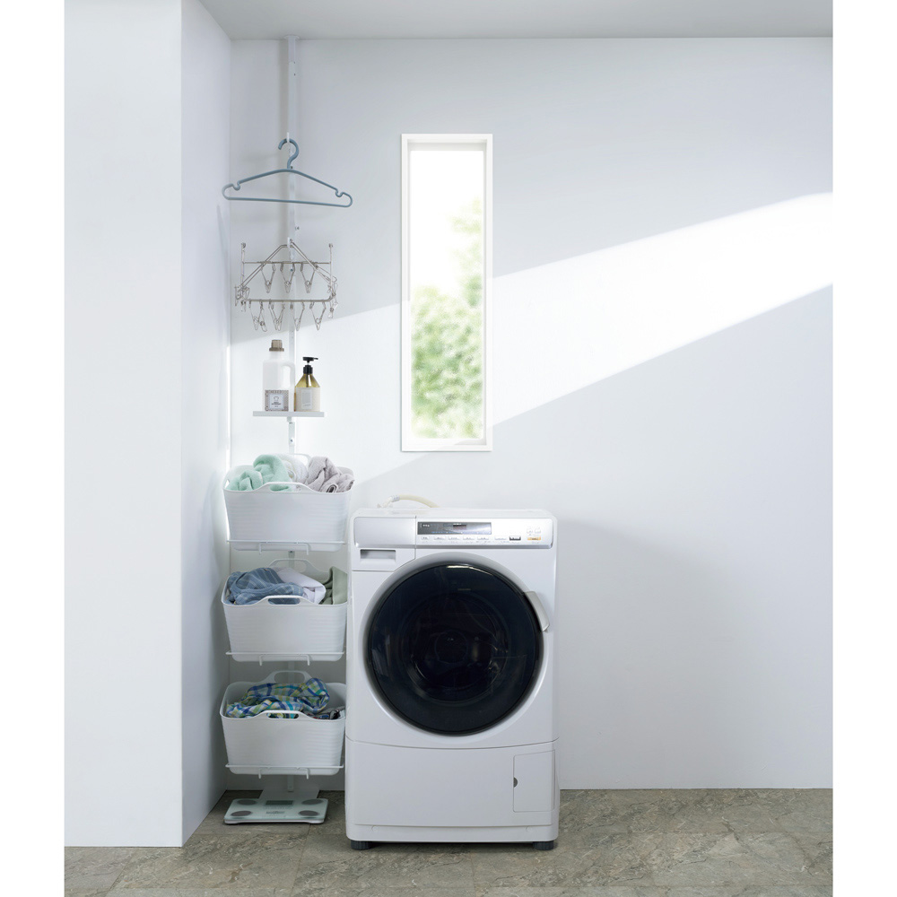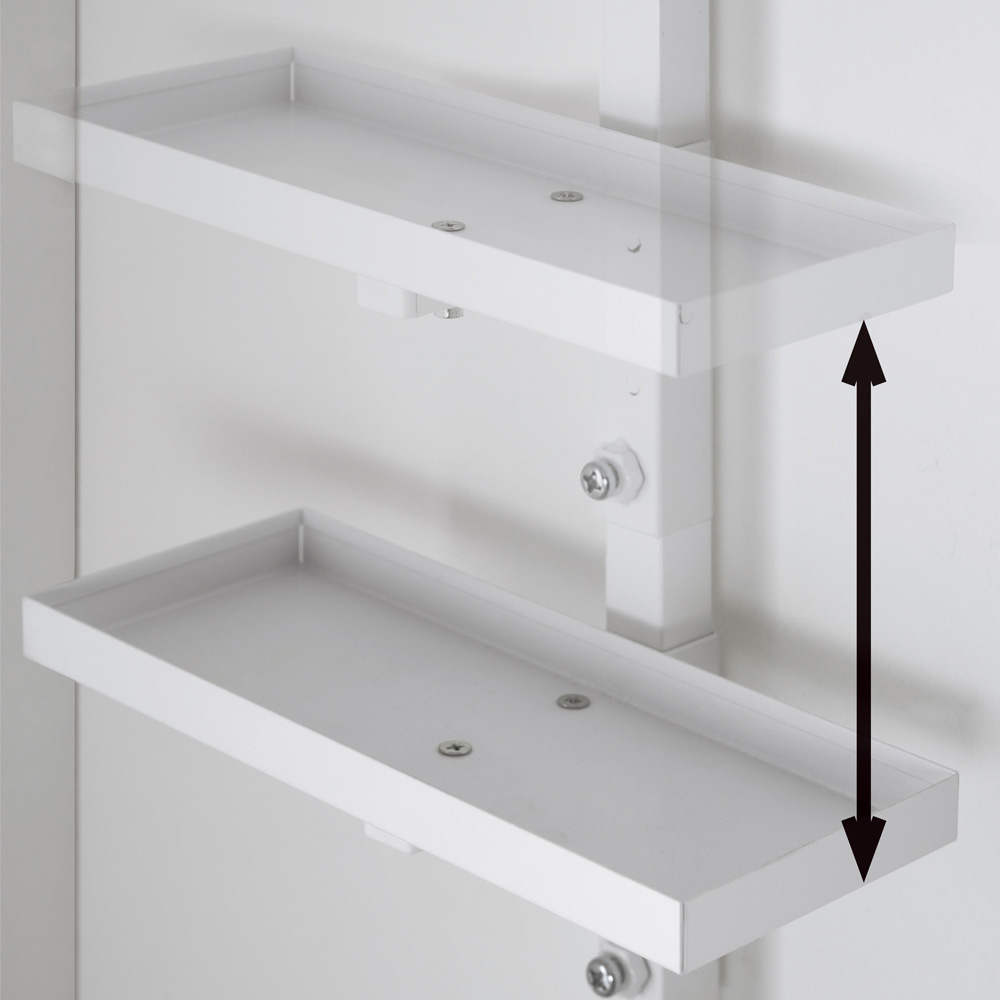 コーディネート例 壁に沿って置いても、洗面所と洗濯機の間に間仕切りのように設置してもOK。トレーは両面に設置できます。 ※写真は別売りのバスケット2段フック2個タイプに、専用トレーを設置しています。