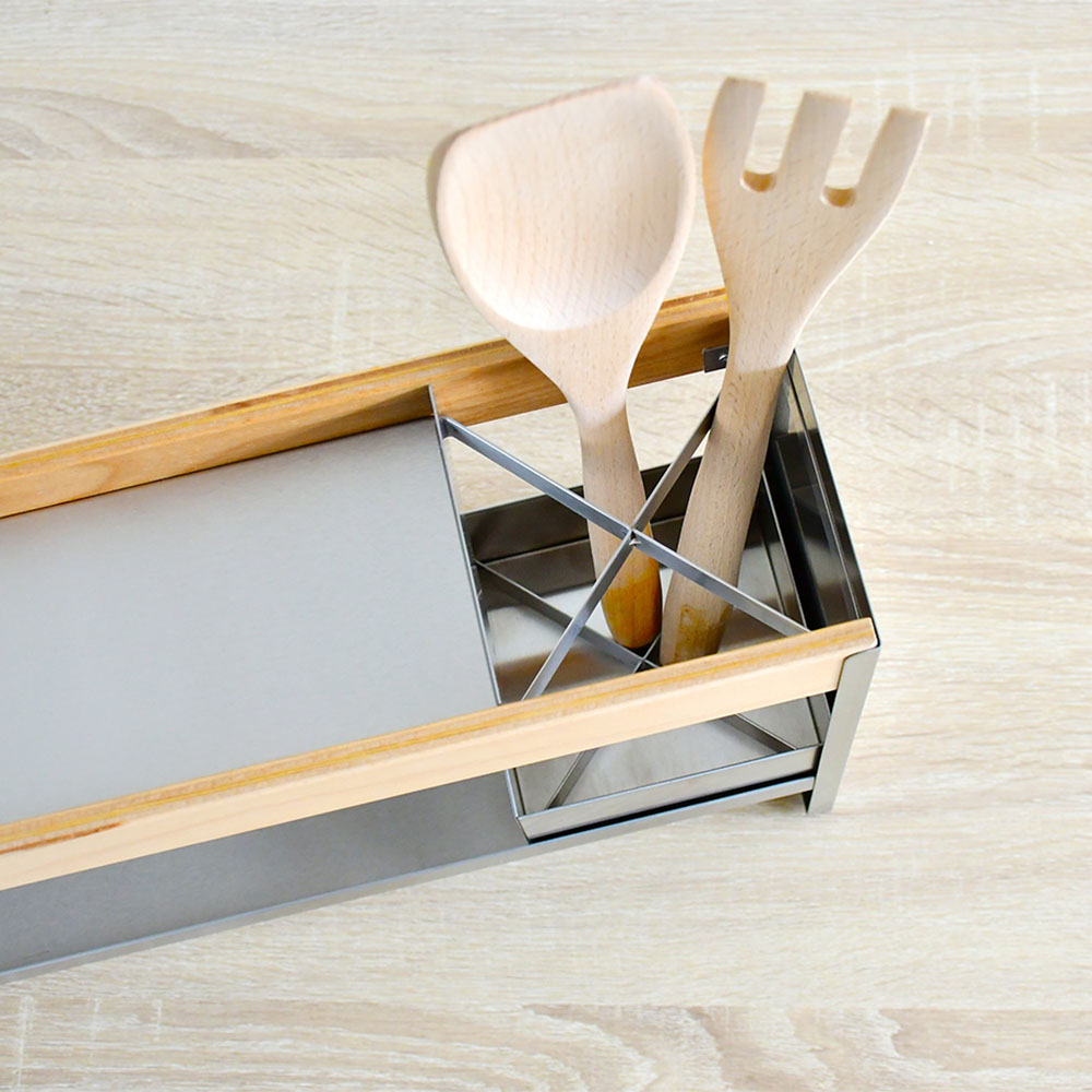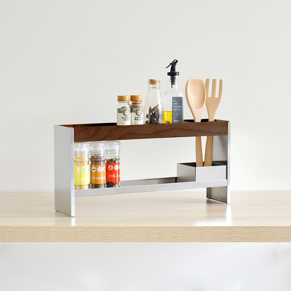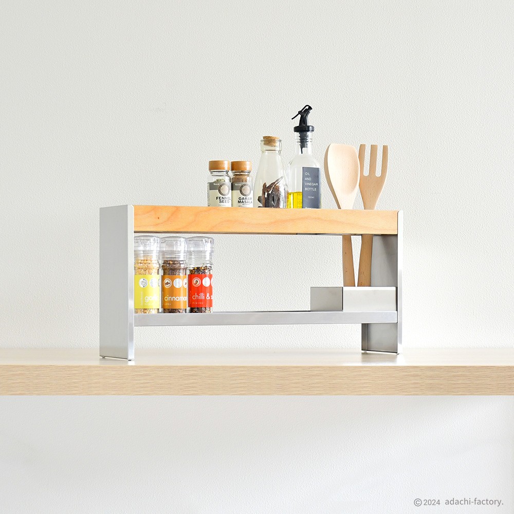 サビに強くお手入れのしやすいステンレスに、南魚沼産木材をポイントに使ったキッチン収納シリーズ。コンロ横やキッチンカウンターにおけば、各種のスパイスやキッチンツールの置き場所として便利です。ツール収納部はクロスしているため収納しやすく、受け部のボックスは取り外し可能でお手入れもしやすく衛生面にも優れています。新潟南魚沼の木材を使う取り組み近年生活スタイルが変化したことで木材需要が減少し、林業が哀退した今、この先手入れがされないであろう森林が増えています。主伐や間伐などの適切な森林整備を行うことで森林を健全な状態に導き、森林が持つ機能の回復を目指しています。今、使用する木々は100年前の先人たちから受け継いだものです。その大切な資源を「モノづくり」を生業とするわたしたちがカタチを変え、人々が魚沼杉やブナの価値に気づくことで、山が生き返ることを目指します。価値が対価になり、森へ還元することで次世代に繋がると信じて・・。それこそがわたしたちが目指すサステナビリティ長期ビジョンです。Brand Concept使い手の方たちのライフスタイルに彩りを添えるようにていねいにモノづくりしそのモノの存在価値(コト)をやさしく伝え作り手としてだけではなく人生のストーリーテラーとしてモノがたりを体感してもらえるお手伝いをしていくRoot is… モノ・コトはここから始まる