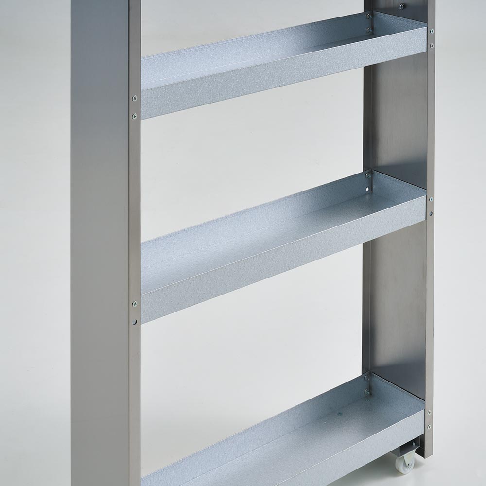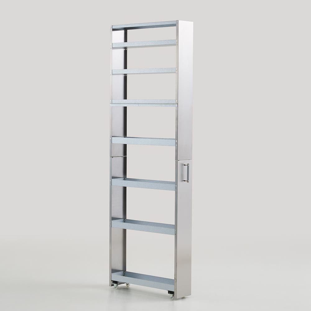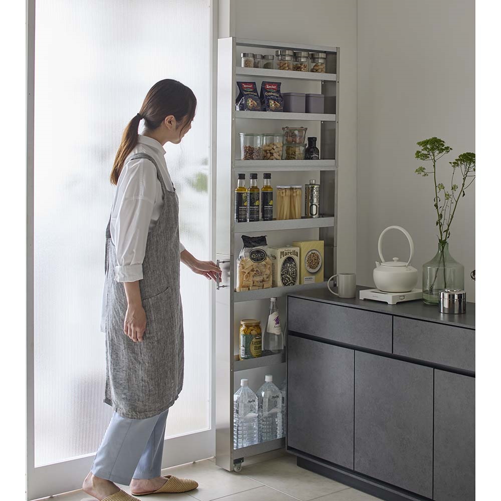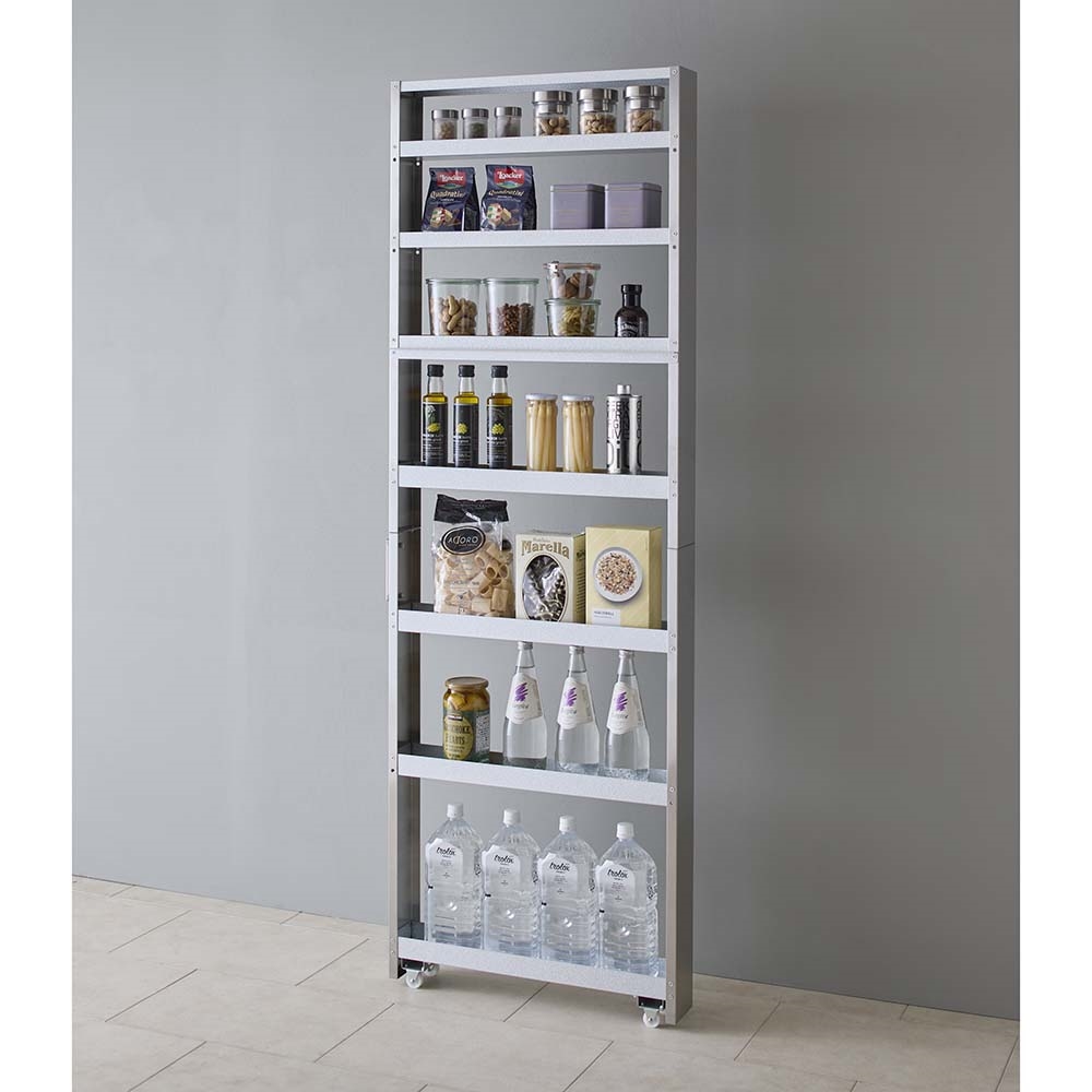 狭い場所に納まるコンパクトでスリムなすき間収納家具。高級感があり水ハネや汚れ、サビにも強いステンレス製だからキッチンやサニタリーで大活躍。デッドスペースを有効活用して、たっぷりの大量収納できる食品ストッカー・キッチンストッカーが実現。清潔感あふれるステンレス製でお手入れ簡単。デッドスペースを大容量収納に変えるキッチン収納■たった幅10cmからの隙間空間を有効活用して大量収納が可能なキッチンストッカーのスペースに。■前面にステンレス素材を用いることで、水跳ね・汚れに強くお手入れのしやすいキッチン収納庫になりました。隙間家具でも妥協しない。コンパクトスリムでも高機能なキッチンストッカー■可動板は3枚付きです。収納物に合わせて調整可能です。■スチール製の棚板には収納物が落ちないようにこぼれ止めが付いています。背の低いキッチンアイテムも安定して収納が可能です。■ワゴン下部分には滑らかな開閉・出し入れを可能にし、ワゴンを支えるためのキャスターを設置し安定感のある設計に。■スムーズに開け閉めできるので中身に使用頻度の高いものをまとめて、調理・家事を時短できるアイデアアイテムです。開け閉めする際は、必ず取っ手を持って動かすようにお願いいたします。横の部分などを持つと怪我をする恐れがございますのでご注意ください。収納物や設置場所に合わせて多彩に選べる、省スペースで豊かなバリエーションがポイント。■選べる幅サイズ展開であなたのキッチンにピッタリなサイズをお選び下さい。■幅は10cm・15cm・20cm・25cmの4タイプお選びいただけます。■幅10cmタイプは細々した調味料の整理整頓にも便利。細長い瓶や小さなストックを見やすく管理できます。縦に収納スペースが広いので、カトラリースタンドに立てたままの調理器具・キッチンツールやお箸・菜箸なども収納可能。■幅15cmは大きめの調味料ボトルや収納ケースに詰めたラップやふきん・タオルなどのキッチンアイテムを収納して食品ストッカーとして活躍します。■幅20cmタイプは2Lペットボトルを1列に収納出来るゆとりサイズ。他、シリアルや大きめの保存容器に詰め替えた食品ストック類・予備のキッチンペーパーをまとめても。光沢のあるステンレスは様々なキッチンインテリアに調和する万能おしゃれカラー■ステンレスの輝くシルバー色は、キッチンに馴染みやすいインテリアとしても定番のカラー。■一般的なキッチンの造り付け収納の取っ手や、水栓、冷蔵庫などのキッチン家電に多用される色です。■水回りに多く採用されるカラーなので、どんなスタイルのキッチンにも違和感なくマッチします。■クールモダンなスタイルやナチュラルインテリア、北欧インテリアは勿論、昨今トレンドの石目調・大理石調のラグジュアリーでゴージャスなお部屋・システムキッチンにもおすすめです。■シンプルな見た目のデザインで、造り付けの建具とも合わせやすく、統一感のあるキッチンインテリアが叶います。信頼と安心の国内工場での生産品のキッチン収納・メタルラックです■国内の職人がひとつずつ丁寧に仕上げたキッチンラック・キッチンボードです。■細部の丁寧な仕上がりなど、国産品ならではの高品質な食器棚をお楽しみください。■キッチンのすきまを無駄なく使いたいあなたにお勧めのキッチン収納ラックです。新築やリフォーム、模様替えの時にもおすすめの逸品■お引越しや模様替えのタイミングでスペースを便利に有効活用してみませんか?■高価な備え付け家具やリフォームよりも、リーズナブルに新生活を始められます。■是非普段使うものこそ、大好きなものをじっくりとご検討下さい。