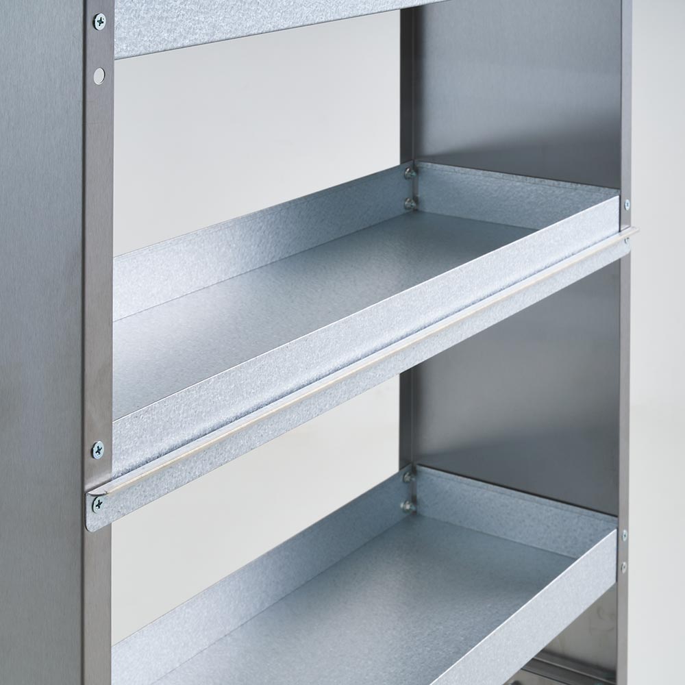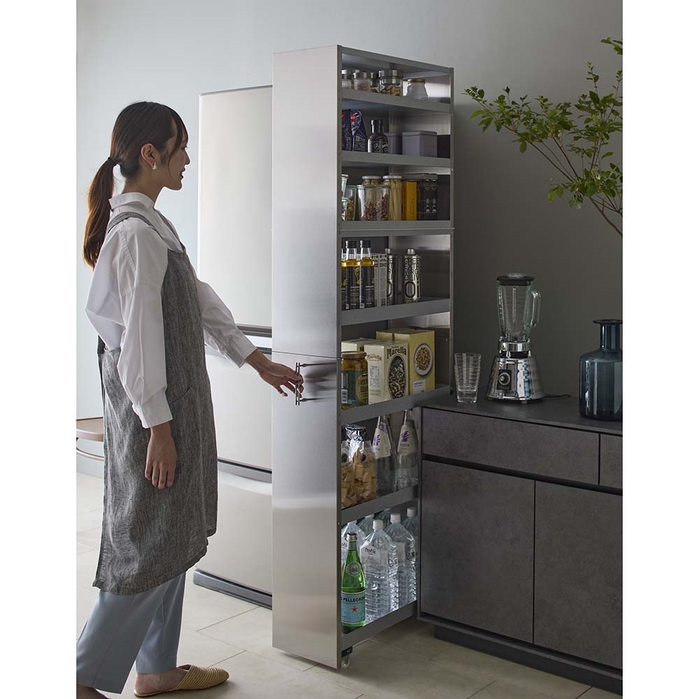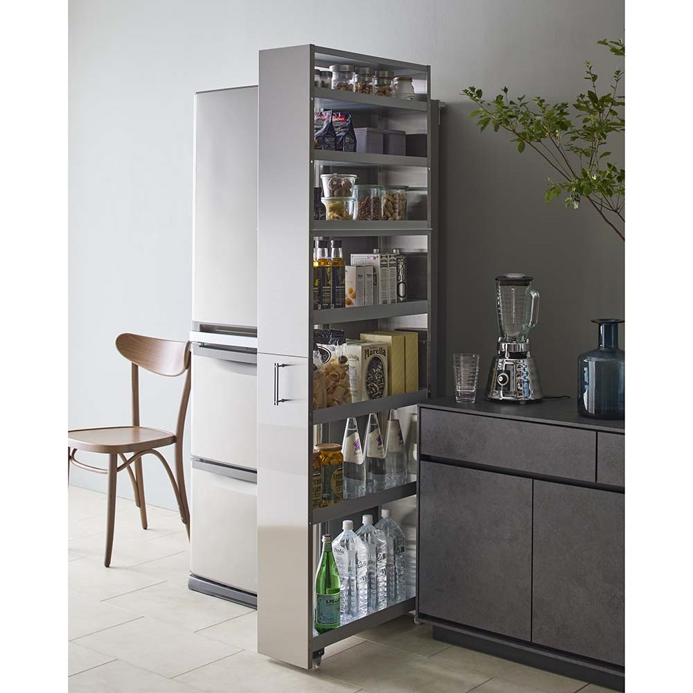狭い場所に納まるコンパクトでスリムなすき間収納家具。高級感があり水ハネや汚れ、サビにも強いステンレス製だからキッチンやサニタリーで大活躍。デッドスペースを有効活用して、たっぷりの大量収納できる食品ストッカー・キッチンストッカーが実現。清潔感あふれるステンレス製でお手入れ簡単。デッドスペースを大容量収納に変えるキッチン収納■たった幅10cmからの隙間空間を有効活用して大量収納が可能なキッチンストッカーのスペースに。■前面にステンレス素材を用いることで、水跳ね・汚れに強くお手入れのしやすいキッチン収納庫になりました。隙間家具でも妥協しない。コンパクトスリムでも高機能なキッチンストッカー■可動板は3枚付きです。収納物に合わせて調整可能です。■スチール製の棚板には収納物が落ちないようにこぼれ止めが付いています。背の低いキッチンアイテムも安定して収納が可能です。■ワゴン下部分には滑らかな開閉・出し入れを可能にし、ワゴンを支えるためのキャスターを設置し安定感のある設計に。■スムーズに開け閉めできるので中身に使用頻度の高いものをまとめて、調理・家事を時短できるアイデアアイテムです。開け閉めする際は、必ず取っ手を持って動かすようにお願いいたします。横の部分などを持つと怪我をする恐れがございますのでご注意ください。収納物や設置場所に合わせて多彩に選べる、省スペースで豊かなバリエーションがポイント。■選べる幅サイズ展開であなたのキッチンにピッタリなサイズをお選び下さい。■幅は10cm・15cm・20cm・25cmの4タイプお選びいただけます。■幅10cmタイプは細々した調味料の整理整頓にも便利。細長い瓶や小さなストックを見やすく管理できます。縦に収納スペースが広いので、カトラリースタンドに立てたままの調理器具・キッチンツールやお箸・菜箸なども収納可能。■幅15cmは大きめの調味料ボトルや収納ケースに詰めたラップやふきん・タオルなどのキッチンアイテムを収納して食品ストッカーとして活躍します。■幅20cmタイプは2Lペットボトルを1列に収納出来るゆとりサイズ。他、シリアルや大きめの保存容器に詰め替えた食品ストック類・予備のキッチンペーパーをまとめても。光沢のあるステンレスは様々なキッチンインテリアに調和する万能おしゃれカラー■ステンレスの輝くシルバー色は、キッチンに馴染みやすいインテリアとしても定番のカラー。■一般的なキッチンの造り付け収納の取っ手や、水栓、冷蔵庫などのキッチン家電に多用される色です。■水回りに多く採用されるカラーなので、どんなスタイルのキッチンにも違和感なくマッチします。■クールモダンなスタイルやナチュラルインテリア、北欧インテリアは勿論、昨今トレンドの石目調・大理石調のラグジュアリーでゴージャスなお部屋・システムキッチンにもおすすめです。■シンプルな見た目のデザインで、造り付けの建具とも合わせやすく、統一感のあるキッチンインテリアが叶います。信頼と安心の国内工場での生産品のキッチン収納・メタルラックです■国内の職人がひとつずつ丁寧に仕上げたキッチンラック・キッチンボードです。■細部の丁寧な仕上がりなど、国産品ならではの高品質な食器棚をお楽しみください。■キッチンのすきまを無駄なく使いたいあなたにお勧めのキッチン収納ラックです。新築やリフォーム、模様替えの時にもおすすめの逸品■お引越しや模様替えのタイミングでスペースを便利に有効活用してみませんか?■高価な備え付け家具やリフォームよりも、リーズナブルに新生活を始められます。■是非普段使うものこそ、大好きなものをじっくりとご検討下さい。