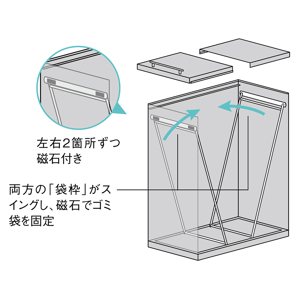 ゴミ袋は磁石で留める仕様で、取り出しもセットも簡単。