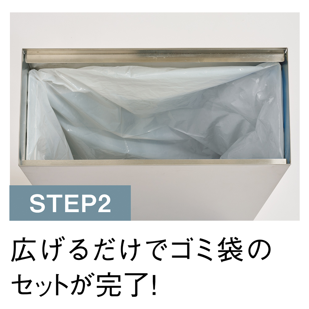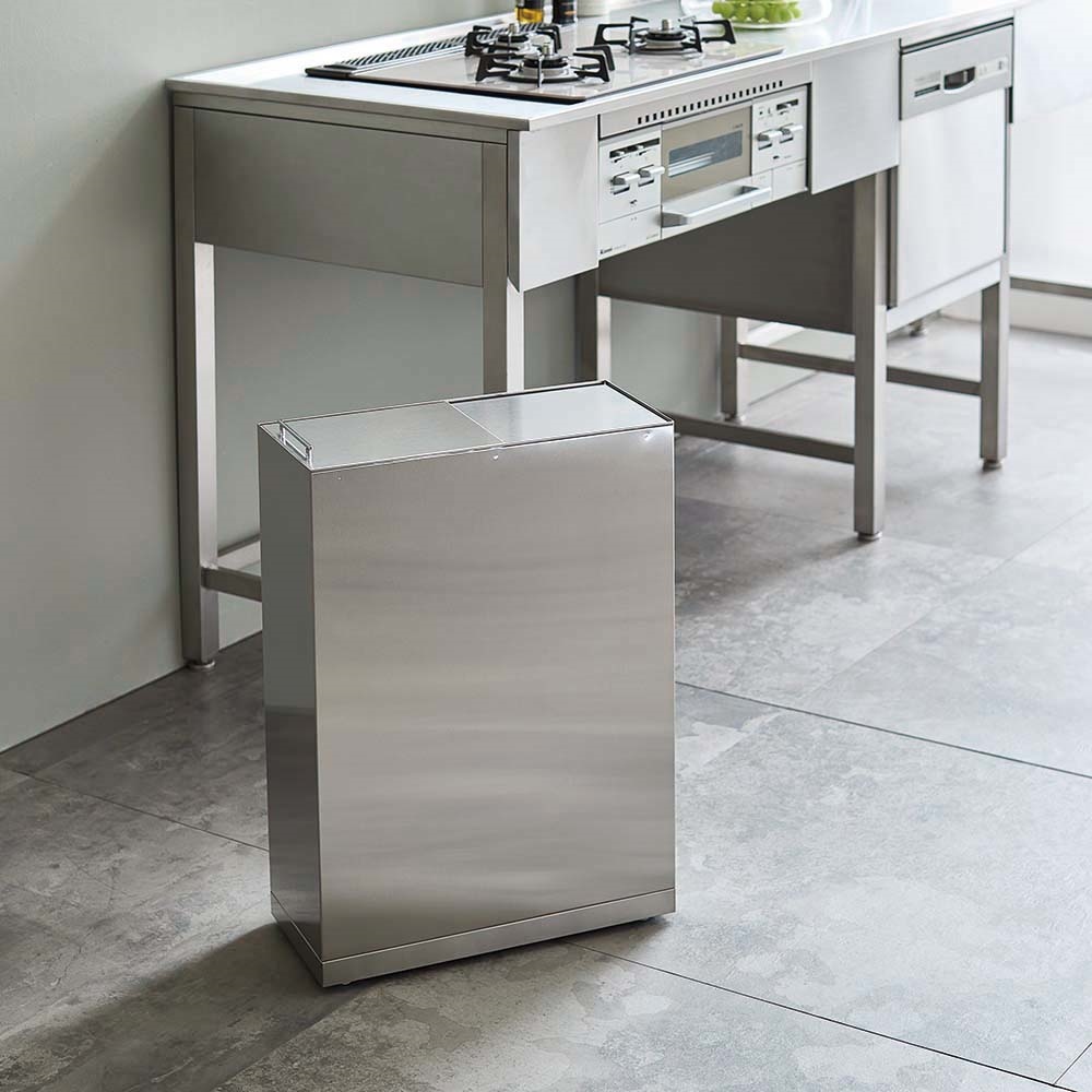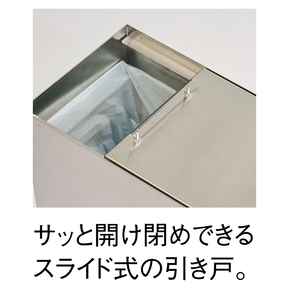 高級感あふれるステンレス製のダストボックス。特殊構造でゴミ袋の交換がラクにできます。ゴミ袋の取り換え作業がラクにできる特殊構造のダストボックス■内部の左右に動く2つのゴミ袋枠の先端の磁石でゴミ袋を止める構造■磁石で止める仕組みなのでゴミ袋の取り出しもセットも簡単です。■片方に袋を3〜4枚セットしておけば、使った後すぐに新しい袋をセットでき便利です。清潔感あふれるステンレス製でスタイリッシュ■ヘアライン調のステンレス素材で高級感があります。■ステンレス素材を用いることで、水跳ね・汚れに強くお手入れのしやすい。■シンプルモダンなデザインで、造り付けの建具とも合わせやすく、統一感のあるキッチンインテリアが叶います。置く場所を選ばないコンパクトサイズ■スリムなサイズでカウンター脇に置いても邪魔になりにくいサイズです。■フタの開閉がスライド式なので縦置きでも横置きでも便利にご使用いただけます。フタは調理中に開けっ放しにできるスライド式■サッと開けしめできるスライド式のフタなので、調理中に開けっ放しにできて効率アップ!キャスター付きで移動もスムーズ■簡単に移動できるので、汚れがちなゴミ箱周りの掃除がラクに。信頼と安心の日本製■国内の職人がひとつずつ丁寧に仕上げました。■細部の丁寧な仕上がりなど、日本製ならではの高品質なダストボックスをお楽しみください。