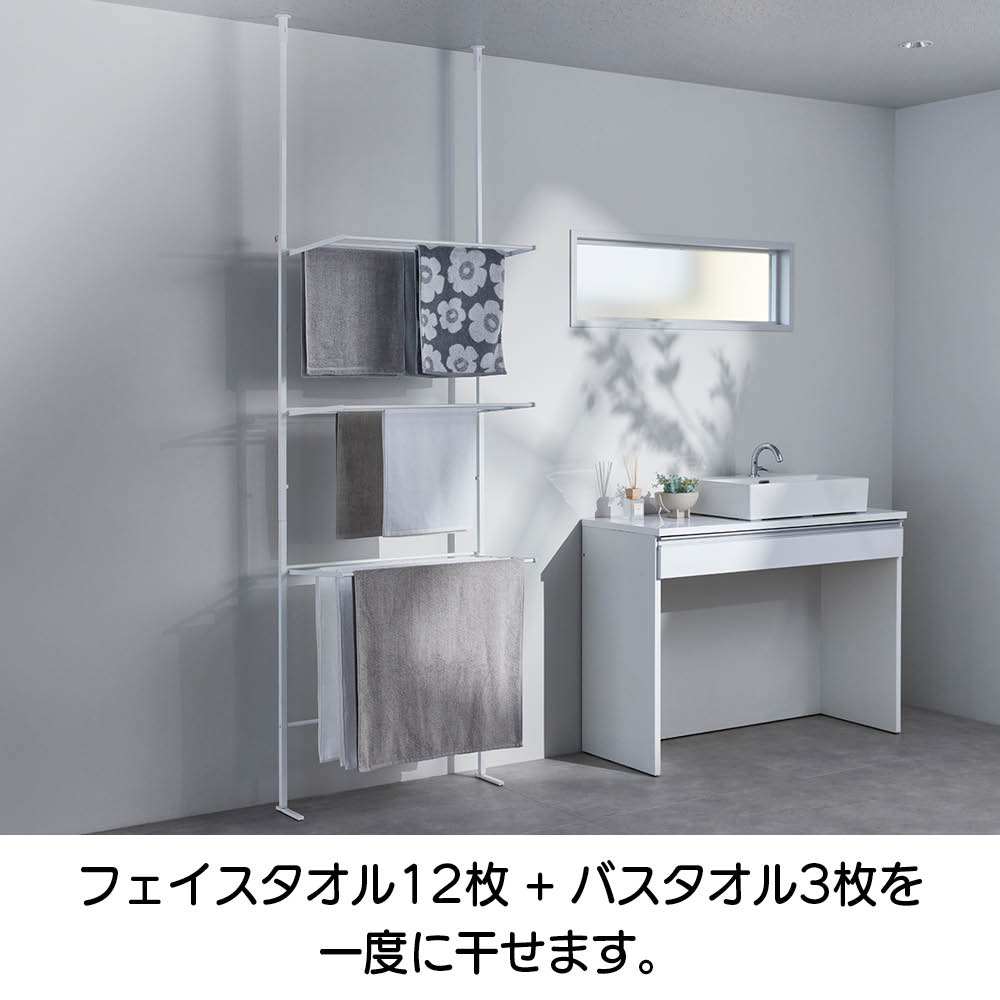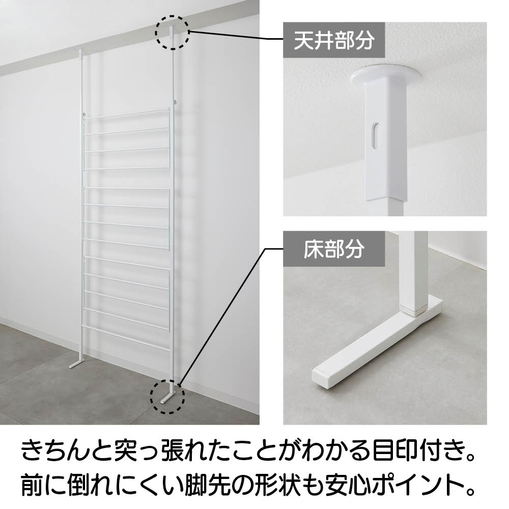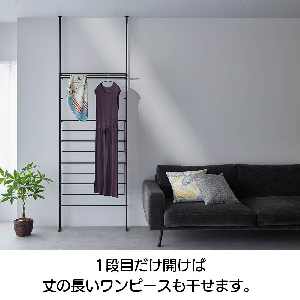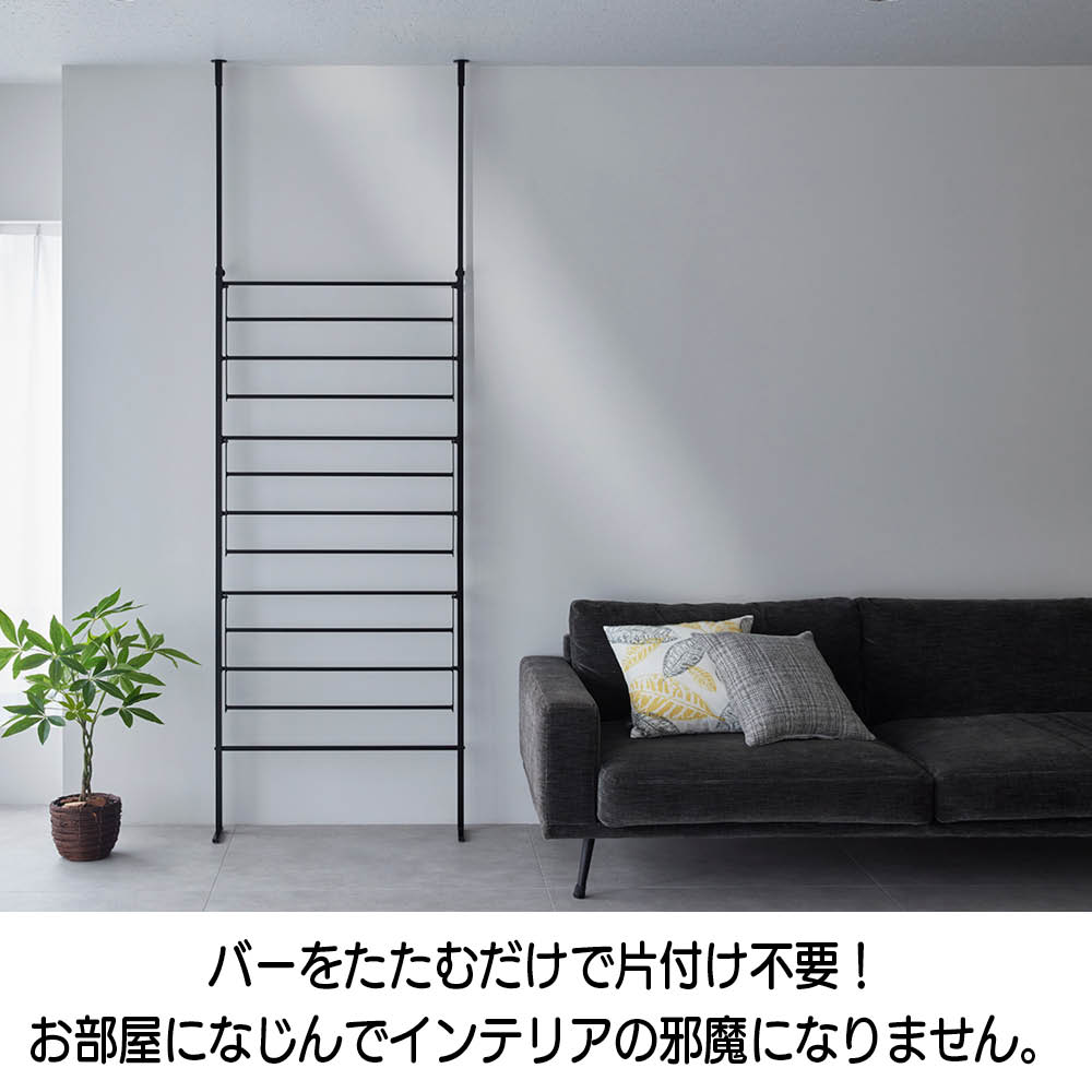 壁際に突っ張って設置する物干し。使うたびに出し入れする面倒も、収納場所の心配も無用です。使わない時はバーをたたんで壁面すっきり、しかもその状態でサマになるデザイン。バーユニットの開き方次第で、さまざまな洗濯物をきれいに干すことができます。ありそうでなかった「超薄型&省スペース」の物干し使いやすさとデザインにこだわった、ディノスが開発した物干しです。インテリアと見間違える、シャープなデザイン生活感を感じさせないデザインで、リビングに設置してもお部屋に馴染みます。毎日使うものだからシンプルに、インテリア性を考慮して仕上げました。リビングや洗面所に、ちょっとした物干しスペースを実現何も置いていなかった壁際がオシャレな物干しスペースに大変身。使わない時はバーユニットを畳むことができるので、空いたスペースを有効にお使いいただけます。超薄型&省スペース片付けいらずで暮らしにゆとりを面倒な物干しの後片付けも、これならワンタッチでOK。使わない時はバーを畳んで収納するだけですっきりと収納。薄型で邪魔になりません。バスタオルもフェイスタオルもこの物干し1台でバーユニットを3つ開けば、1・2段目でフェイスタオルを計12枚、3段目にはバスタオルが3枚干せます。3段目は数日に1回洗濯するバスタオルの定位置にするのも◎。セーターや枕などの平干しも可能バーユニットは洗濯物を掛けるだけでなく、平干し台としても使用可能。どこに干したらいいか迷う枕や、ハンガーに掛けると伸びてしまうニット類もスマートに平干しできて便利です。丈の長い洗濯物にも対応1段目のバーだけを開けば十分な高さがあるので、マキシワンピースやパンツなど、丈の長い衣類をハンガーに掛けて干すことができます。ほどよい風通しで乾きやすく設計各バーユニットのバー同士の間隔は約11cm。全部のバーにタオルなどを掛けても、空気の通り道ができ、室内干しでも乾きやすくなっています。壁際に設置できる天井突っ張り式天井突っ張り式でスペースを有効活用、しっかりと突っ張れたことがわかる目印付きで安心です。床に接する脚先は、手前が長くなっているので前に倒れにくく、安定感があります。ディノスこだわりの企画商品つっぱりラダー物干しは、使いやすさとデザインの両立を求めてディノスが企画開発を行い、新潟・燕三条のいくつもの専門工場が関わって完成します。