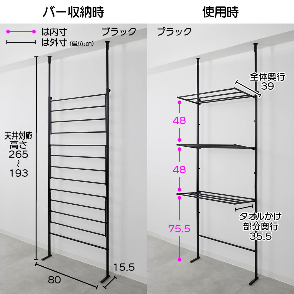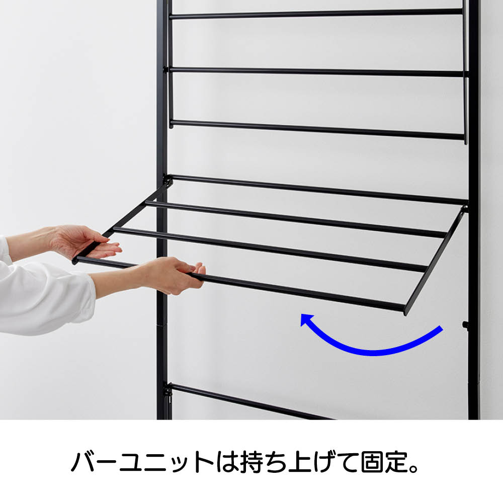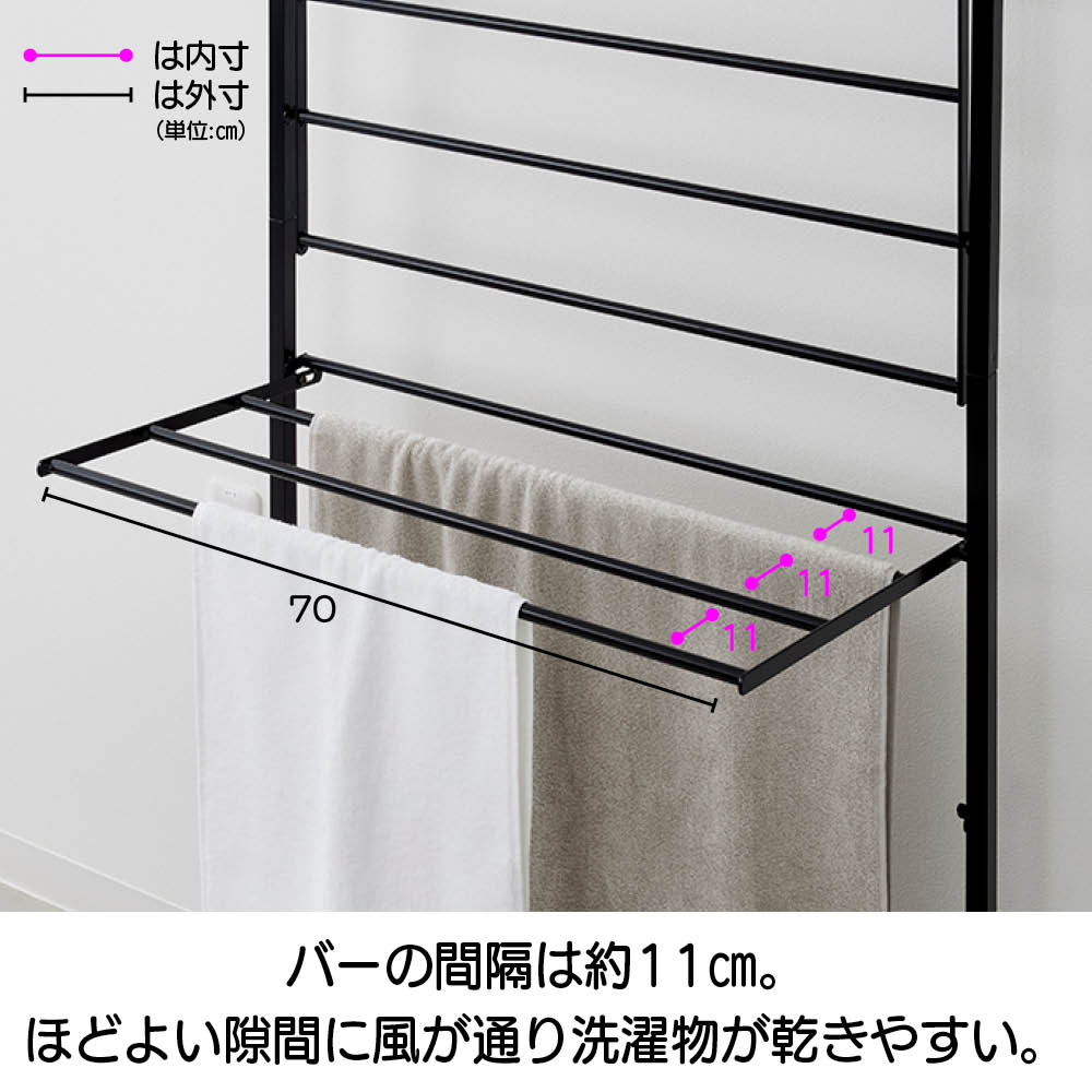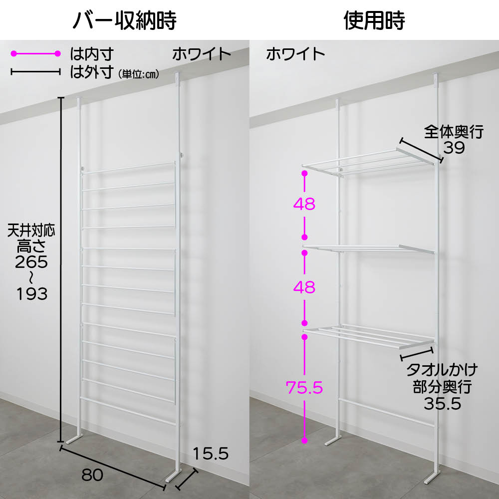 壁際に突っ張って設置する物干し。使うたびに出し入れする面倒も、収納場所の心配も無用です。使わない時はバーをたたんで壁面すっきり、しかもその状態でサマになるデザイン。バーユニットの開き方次第で、さまざまな洗濯物をきれいに干すことができます。ありそうでなかった「超薄型&省スペース」の物干し使いやすさとデザインにこだわった、ディノスが開発した物干しです。インテリアと見間違える、シャープなデザイン生活感を感じさせないデザインで、リビングに設置してもお部屋に馴染みます。毎日使うものだからシンプルに、インテリア性を考慮して仕上げました。リビングや洗面所に、ちょっとした物干しスペースを実現何も置いていなかった壁際がオシャレな物干しスペースに大変身。使わない時はバーユニットを畳むことができるので、空いたスペースを有効にお使いいただけます。超薄型&省スペース片付けいらずで暮らしにゆとりを面倒な物干しの後片付けも、これならワンタッチでOK。使わない時はバーを畳んで収納するだけですっきりと収納。薄型で邪魔になりません。バスタオルもフェイスタオルもこの物干し1台でバーユニットを3つ開けば、1・2段目でフェイスタオルを計12枚、3段目にはバスタオルが3枚干せます。3段目は数日に1回洗濯するバスタオルの定位置にするのも◎。セーターや枕などの平干しも可能バーユニットは洗濯物を掛けるだけでなく、平干し台としても使用可能。どこに干したらいいか迷う枕や、ハンガーに掛けると伸びてしまうニット類もスマートに平干しできて便利です。丈の長い洗濯物にも対応1段目のバーだけを開けば十分な高さがあるので、マキシワンピースやパンツなど、丈の長い衣類をハンガーに掛けて干すことができます。ほどよい風通しで乾きやすく設計各バーユニットのバー同士の間隔は約11cm。全部のバーにタオルなどを掛けても、空気の通り道ができ、室内干しでも乾きやすくなっています。壁際に設置できる天井突っ張り式天井突っ張り式でスペースを有効活用、しっかりと突っ張れたことがわかる目印付きで安心です。床に接する脚先は、手前が長くなっているので前に倒れにくく、安定感があります。ディノスこだわりの企画商品つっぱりラダー物干しは、使いやすさとデザインの両立を求めてディノスが企画開発を行い、新潟・燕三条のいくつもの専門工場が関わって完成します。