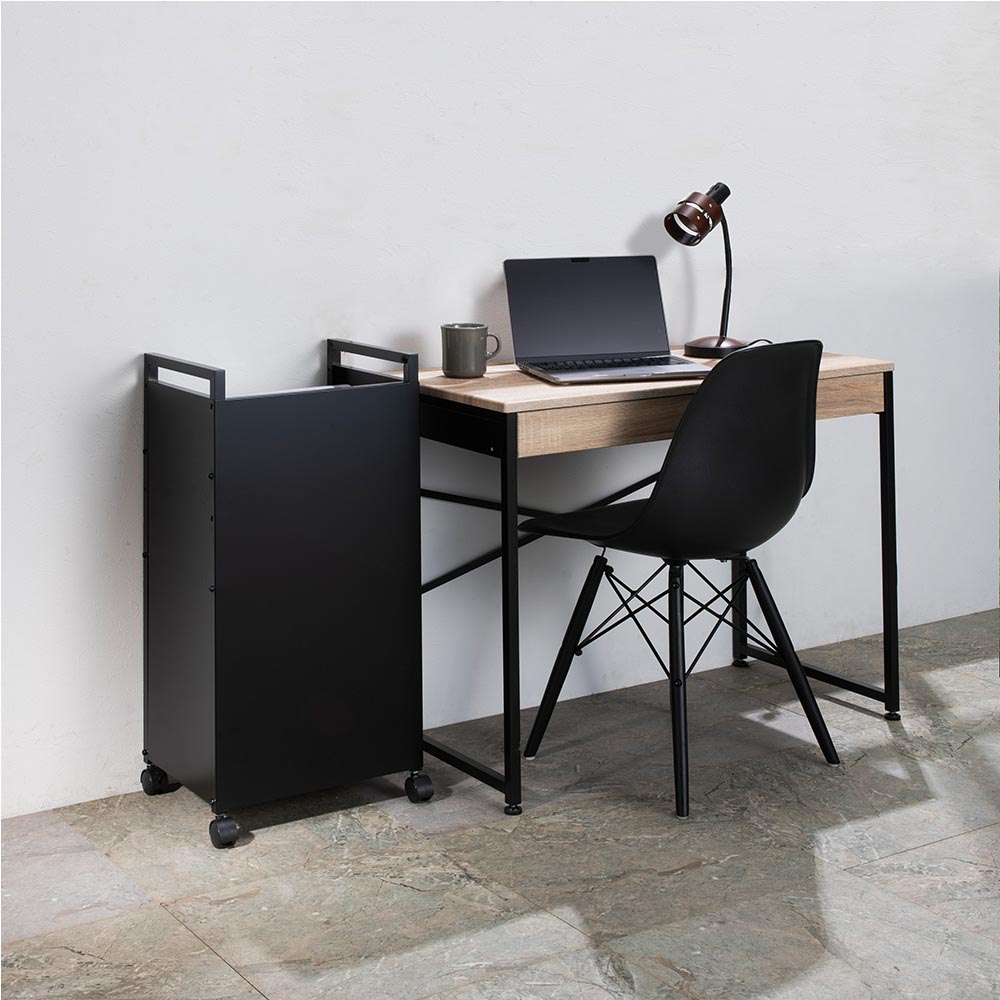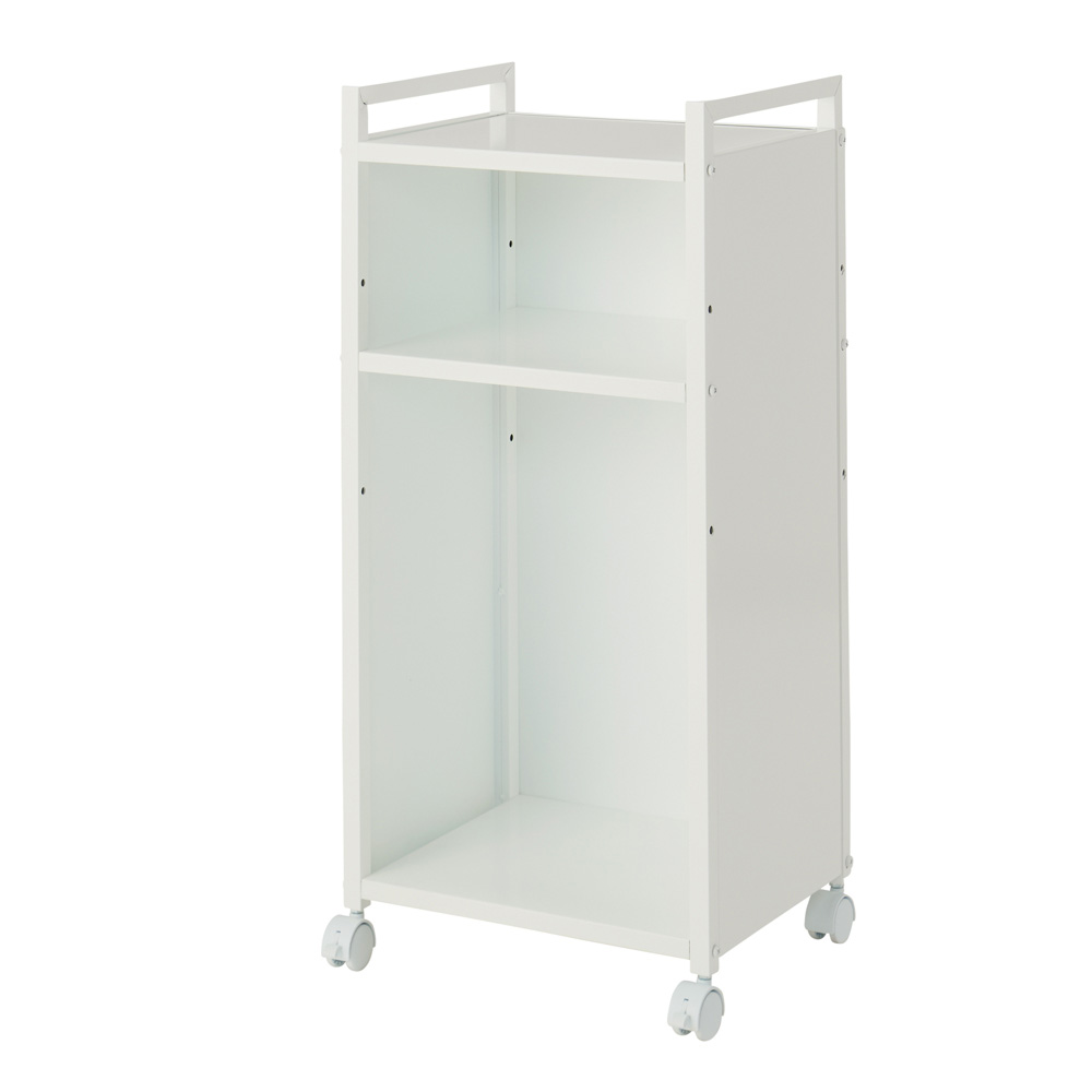総耐荷重約50kg(耐荷重試験は100kgをクリア)の頑丈設計で、重い物もかさばる物もおまかせ。キャスター&サイドパネル付きで、クルッと回せば生活感を丸ごと隠せるキャスターワゴン。高さ80cmのハイタイプはデスクサイドでも活躍します。ホワイト 写真左からハイタイプ幅50cm、ハイタイプ幅40cmスッキリ収納、目隠しも移動もできるワゴン重い物もかさばる物もおまかせ。出番が多いのに収納場所がなく「とりあえず置く」が常態化している生活用品が片付く有能ワゴン。キャスター&サイドパネル付きで、クルッと回せば生活感を丸ごと目隠し。総耐荷重約60kg(耐荷重試験は120kgをクリア)の頑丈設計で、物を載せたままスムーズに移動もできます。ホワイト ハイタイプ幅50cm来客時など、クルッと回せば丸ごと目隠しできます。キッチンだけでなく、子供部屋などあらゆるエリアで活躍します。ランドセルを置く定位置にしても。教科書・帽子・文房具はもちろん習字道具やプリント類など、まとめて収納すれば忘れ物なく明日の準備ができます。お子さまが成長し、子供用品を入れなくなっても、リビングやダイニングの収納として長く使えます。ブラック ハイタイプ幅40cmハイタイプは高さ80cmでデスクサイドにもぴったりデスクサイドワゴンとしても活躍する高さ80cmのハイタイプ。使わない時は隠しておけるから、リビングやダイニングでリモートワークをする人にもオススメです。カラーはホワイト・ブラックの2色ハイタイプは幅40cmと50cmの2タイプ。どちらも奥行34cm、高さ80cm。写真は別売りのロータイプですクルッと回して生活感を目隠し3面にパネルが付いたコの字形状。裏返せば、前からも横からも収納物が見えないつくり。目隠し収納できるので、キッチンやダイニングの見映えもアップ。写真は別売りのロータイプですストック品・防災用の備蓄収納にストック類、防災用リュックや備蓄水・非常食をまとめておけば、いざというとき役立ちます。ハイタイプ天板・中棚の耐荷重は約10kg。下段棚の耐荷重は約40kg。(写真は別売りのロータイプです)高さ調節可能&お手入れ簡単な天板天板・中棚の位置は12cm間隔で2段階に調節可。天板を低くした場合は、缶詰などが安定感よく並べられ、反対側から見るとちょうど隠れる高さになります。また、天板は熱や水、汚れに強いスチール(メラミン焼付塗装)でお手入れもラク。熱い鍋などが置け、前面・側面にマグネットもつけられます。両サイドの持ち手で移動・回転がラク両サイドの持ち手を使えば、収納したままでも移動や回転がラク。シンプルなバータイプなので、天板に置いた物の落下防止やS字フックを掛けるなど、何かと便利に使えます。便利なキャスター付き掃除の時の移動がスムーズ。重い物を持ち運ぶ労力も省けます。キャスターはストッパー(4個中2個)付きで、動かさない時はしっかり固定。