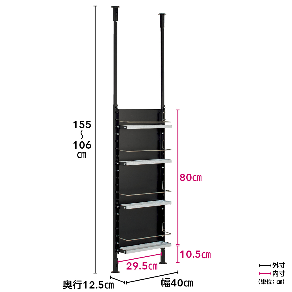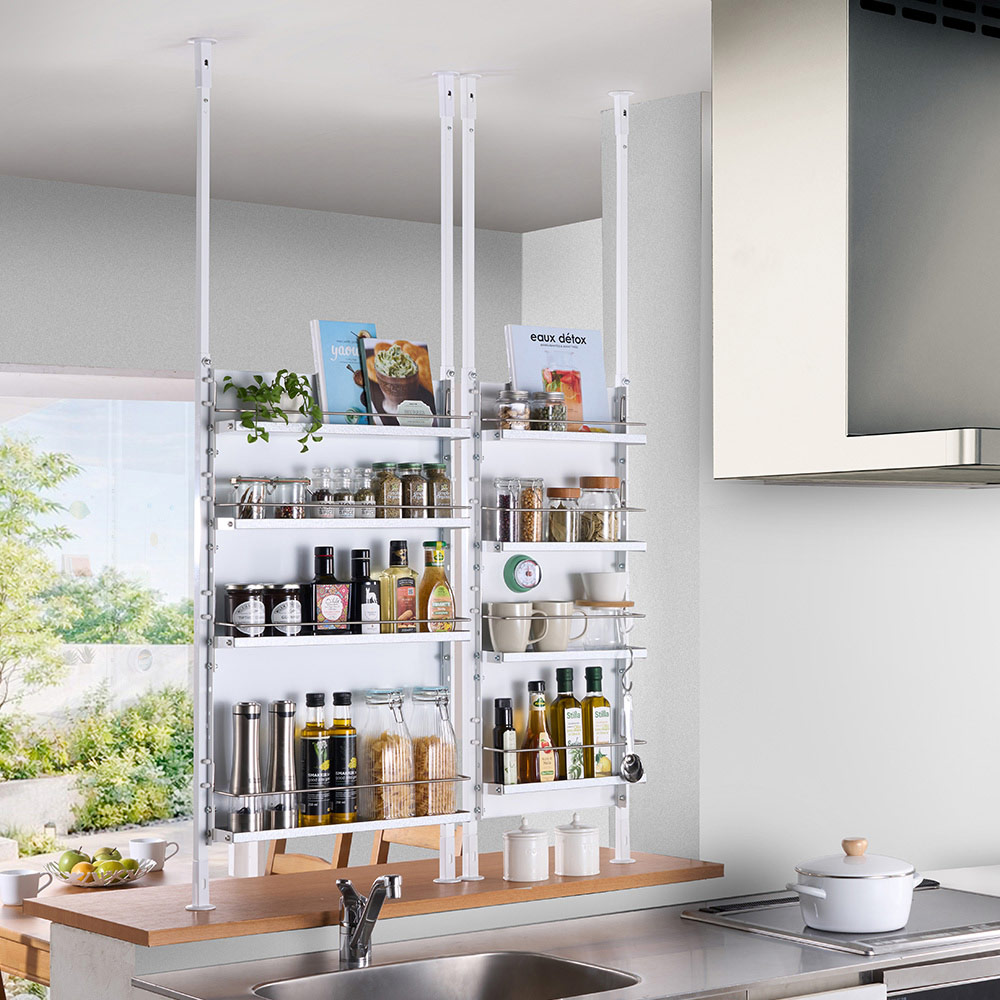 対面式キッチンのカウンター上に設置して、収納不足を解消しながらキッチン側のごちゃつきを隠してくれる突っ張りシェルフ。天井までの高さを有効に使えるハイタイプと、吊戸棚の下に設置できるロータイプをご用意しました。カウンター上の収納不足と見えすぎ問題を一挙に解決(ア)ホワイト 写真左からハイタイプ幅55cm・ハイタイプ幅40cm対面式キッチンのカウンター上に設置して、収納不足を解消しながらキッチン側のごちゃつきを隠してくれる突っ張りシェルフ。ハイタイプは天井までの高さを有効に使えます。 ※写真はキッチン側から撮影ダイニング側はデコレーションを楽しんで(ア)ホワイト 写真左からハイタイプ幅40cm・ハイタイプ幅55cmパネル面はマグネットが使えるスチール製。マグネット式のフックやラックで、ダイニング側からも小物収納やディスプレイが楽しめます。 ※写真はダイニングテーブル側から撮影丈夫で丁寧なつくりの日本製収納面 写真左:幅55cm(ア)ホワイト 写真右:幅40cm(イ)ブラック隠すも収納も叶える対面キッチン目隠しラックは、ロータイプとハイタイプの2タイプ、幅は40cmと55cmの2タイプ。色はホワイトとブラックの2色展開で、お部屋に合わせてお選びいただけます。丈夫で丁寧なつくりの日本製です。背面はスチール製パネル仕様裏面 写真左:幅40cm(ア)ホワイト 写真右:幅55cm(イ)ブラック背面はキッチン側のごちゃつきをスッキリ隠してくれるパネル仕様。スチール製なので、マグネットを使ったディスプレイも楽しめます。棚板は水や汚れに強いガルバリウム鋼板製上から 幅40cmタイプの棚板、幅55cmタイプの棚板です棚板は水や汚れに強いガルバリウム鋼板製。建築材に使われるほど強度や耐久性に優れ、お手入れが簡単だから長く清潔にお使いいただけます。高さ106cm〜155cm対応のハイタイプ(ア)ホワイト ※写真は別売りのロータイプハイタイプは106cmから155cmまでの高さに対応。カウンターから天井までの高さを有効活用できます。壁付けの収納棚としても使えます(ア)ホワイト ※写真は別売りのロータイプ幅55cmキッチンカウンターやコンロ脇の壁面収納としても使用可能。高さが違っても設置できる突っ張り式で、作業スペースを確保しながら調味料や調理道具がサッと取り出せます。収納物が落ちにくいこぼれ止め付きスパイスの瓶など細かい物が落ちにくい、ステンレス製のこぼれ止め付き。可動棚板と同様に、4cm間隔で高さが変えられます。全段可動の棚板で効率収納が可能棚板は収納物に合わせて4cm間隔で高さ調節が可能。背の高いボトルなども収納でき、手前の調理スペースを確保もできます。お手入れが簡単だからキレイが長持ち棚板は水や汚れに強いガルバリウム鋼板製。調味料や油をこぼしてもサッと拭くだけできれいになるから、いつも清潔にお使いいただけます。