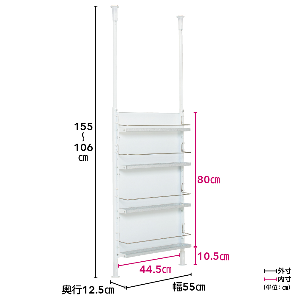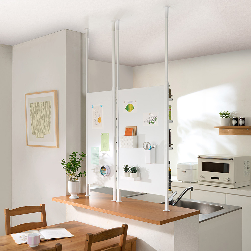 対面式キッチンのカウンター上に設置して、収納不足を解消しながらキッチン側のごちゃつきを隠してくれる突っ張りシェルフ。天井までの高さを有効に使えるハイタイプと、吊戸棚の下に設置できるロータイプをご用意しました。カウンター上の収納不足と見えすぎ問題を一挙に解決(ア)ホワイト 写真左からハイタイプ幅55cm・ハイタイプ幅40cm対面式キッチンのカウンター上に設置して、収納不足を解消しながらキッチン側のごちゃつきを隠してくれる突っ張りシェルフ。ハイタイプは天井までの高さを有効に使えます。 ※写真はキッチン側から撮影ダイニング側はデコレーションを楽しんで(ア)ホワイト 写真左からハイタイプ幅40cm・ハイタイプ幅55cmパネル面はマグネットが使えるスチール製。マグネット式のフックやラックで、ダイニング側からも小物収納やディスプレイが楽しめます。 ※写真はダイニングテーブル側から撮影丈夫で丁寧なつくりの日本製収納面 写真左:幅55cm(ア)ホワイト 写真右:幅40cm(イ)ブラック隠すも収納も叶える対面キッチン目隠しラックは、ロータイプとハイタイプの2タイプ、幅は40cmと55cmの2タイプ。色はホワイトとブラックの2色展開で、お部屋に合わせてお選びいただけます。丈夫で丁寧なつくりの日本製です。背面はスチール製パネル仕様裏面 写真左:幅40cm(ア)ホワイト 写真右:幅55cm(イ)ブラック背面はキッチン側のごちゃつきをスッキリ隠してくれるパネル仕様。スチール製なので、マグネットを使ったディスプレイも楽しめます。棚板は水や汚れに強いガルバリウム鋼板製上から 幅40cmタイプの棚板、幅55cmタイプの棚板です棚板は水や汚れに強いガルバリウム鋼板製。建築材に使われるほど強度や耐久性に優れ、お手入れが簡単だから長く清潔にお使いいただけます。高さ106cm〜155cm対応のハイタイプ(ア)ホワイト ※写真は別売りのロータイプハイタイプは106cmから155cmまでの高さに対応。カウンターから天井までの高さを有効活用できます。壁付けの収納棚としても使えます(ア)ホワイト ※写真は別売りのロータイプ幅55cmキッチンカウンターやコンロ脇の壁面収納としても使用可能。高さが違っても設置できる突っ張り式で、作業スペースを確保しながら調味料や調理道具がサッと取り出せます。収納物が落ちにくいこぼれ止め付きスパイスの瓶など細かい物が落ちにくい、ステンレス製のこぼれ止め付き。可動棚板と同様に、4cm間隔で高さが変えられます。全段可動の棚板で効率収納が可能棚板は収納物に合わせて4cm間隔で高さ調節が可能。背の高いボトルなども収納でき、手前の調理スペースを確保もできます。お手入れが簡単だからキレイが長持ち棚板は水や汚れに強いガルバリウム鋼板製。調味料や油をこぼしてもサッと拭くだけできれいになるから、いつも清潔にお使いいただけます。