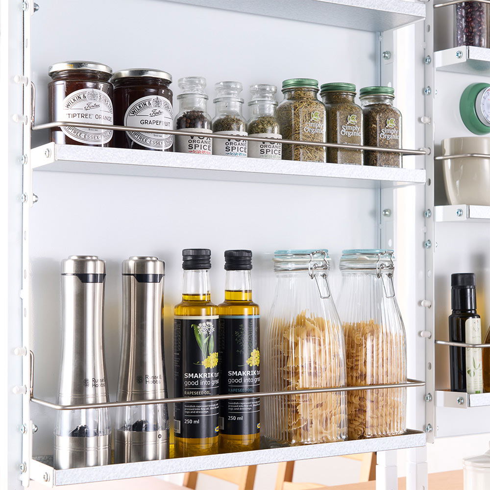 こぼれ止めも可動式。袋類、調味料など高さに合わせて調節できます。
