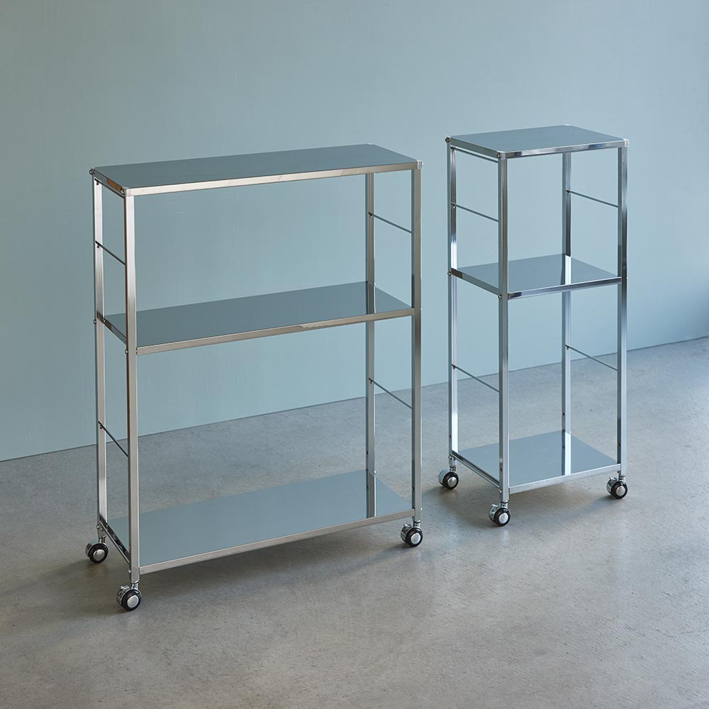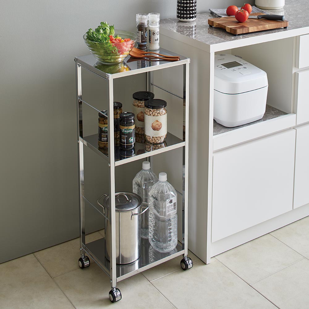 調理スペース不足と収納不足を一気に解決するステンレス製のキッチンワゴン。調理スペースが足りず、不自由を感じていた方におすすめです。調理がはかどる、作業スペースを広げるワゴン調理スペース不足と収納不足を一気に解決するステンレス製のキッチンワゴン。収納はもちろん、作業台や配膳にマルチに活躍します。標準的なキッチンの高さ(85cm)に合わせて作られているので、横付けすると調理スペースに続く作業台に。調理スペースが広がると、切った食材や完成した料理を置いておけるので、片付けをしながら調理する必要がなく、作業効率が上がります。また、本体にはマグネットが付くので、キッチンタイマーなどの保管場所としても最適です。製造は金属加工で有名な新潟・燕三条地域のメーカーが手掛けています。収納力たっぷりでキッチンが散らかりません下段は置くものの高さによって、5cmの2段階調節が可能です。キッチン上に出しっぱなしになりがちな調理道具やボトル類の収納場所としてぴったりです。耐荷重は天板と上段・下段は約10kgなので、調理家電や鍋、ボトル類などの重いものをのせても大丈夫です。サイドのフレームにはふきんなどを掛けても便利。機能性に優れお手入れが楽なステンレス製天板と棚部分は、傷や汚れ・水はねに強いステンレス製なので手入れもラクラク。耐熱温度も約500度なので、フライパンや鍋など、熱いものをのせても問題ありません。ステンレスは耐熱性・耐水性があるため、耐荷重10kg以内なら、蒸気のでる炊飯器などを置いても◎。調理スペースが足りず、調理中不自由を感じていた方も、このラックがあればつい料理がはかどり、料理の品数も増えるかもしれません♪※鍋を乗せる際は、安全のため鍋敷き等をご使用を推奨します。キャスター付きで移動も配膳も楽々脚にはキャスターが付いているので、コンロ横やシンク横など、作業する場所にすぐに移動が可能。調理中のものや洗いものをちょっと置きたい時にも活躍します。また、食卓への配膳でも活躍します。特に熱くて重い鍋などは、コンロから天板に移してそのまま移動できるので安心です。キャスターはストッパー付きで、作業時には動かないようにすることもでき、天板の上で包丁を使ったり、かき混ぜたりしても揺れないので安全です。※組み立て時間の目安は大人2名で20分以内です。キッチンのコンセント事情や収納するものに合わせて選べる4サイズ展開サイズは幅36.5cmと67.5cmの2サイズ展開。さらに、調理家電を多くお持ちで、キッチンにコンセントが少ない方でも安心の1500W 2口コンセント付きのタイプもそれぞれラインアップしています。全体のスペースや収納するものに合わせてお選びいただけます。下部のシリーズ商品とおすすめ関連商品からご確認ください。