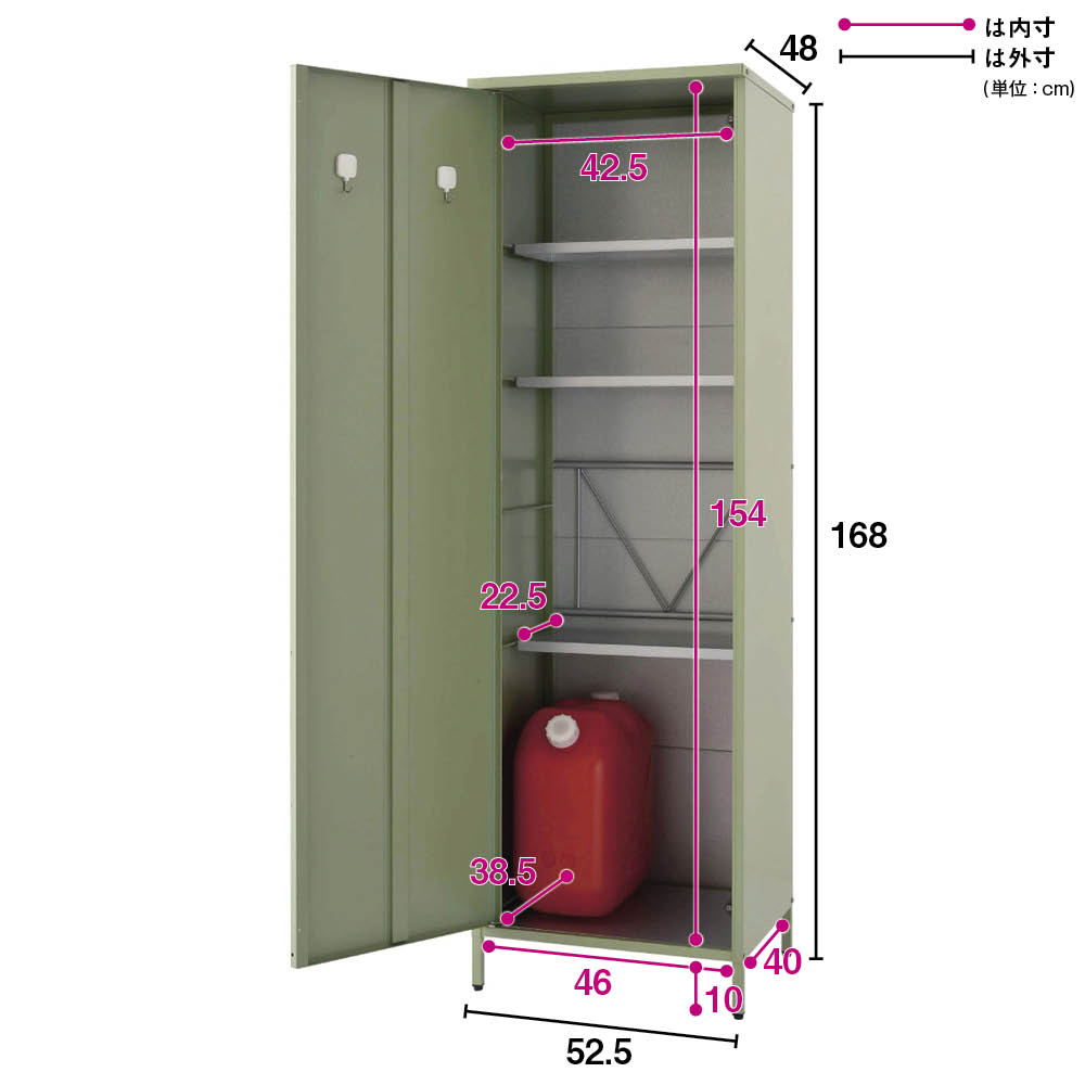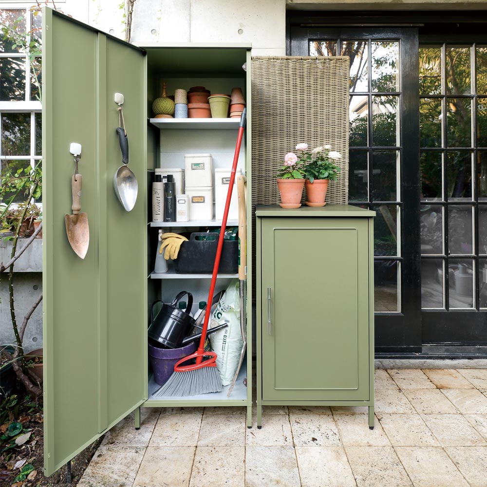 【吉谷桂子先生コラボ商品】【頑丈】【スリム収納】【日本製】【幅52.5×高さ168cm】庭を明るく演出できる、これまでにないカラーの収納庫。ベランダや玄関などの狭いスペースにも置けるスリムタイプ。土や肥料、ガーデニングにまつわるアイテムをひとまとめに収納可能!◎吉谷桂子さんとディノスがコラボして作った、お庭を明るく演出してくれるセージグリーンの収納庫◎・丈夫なボンデ鋼板を使用。・ベランダにもおすすめのコンパクトなデザイン。・物置の扉は優しい雰囲気を演出してくれるセージグリーン。お庭や壁のテイストにマッチする色味になっています。◎収納力もしっかり◎・作業に必要なツールのほか、土や肥料、日用品のストックまでも収納できる、頼れる収納力も自慢です。・棚板は奥行きが浅めのつくり。棚板と扉の間にスペースがあるので、長い柄のものを収納することができます。◎タフな素材を使用◎・丈夫でサビに強いボンデ鋼板を使用しています。◎機能面も充実◎・付属のマグネットフックで効率的に収納できます。・脚部には、設置時のガタツキを抑えるアジャスター付き。・足は高めの約10cm。収納庫下にサンダルなどの履物を収納できます。庫内の湿気対策にも。◎雨水が浸入しにくいつくり◎・上部は「ひさし」構造で、雨水の浸入を防ぎます。・天板は雨が入りにくい作りにしました。◎お庭づくりを支えるエクステリア収納◎・ガーデニング雑貨やベランダ用品もたっぷり収納できます。・設置場所や条件に合わせた物置き・収納庫をチョイスして、快適なエクステリアの収納プランを。【信頼と安心の国内工場での生産品】・管理の行き届いた日本国内の工場で、加工から製造、梱包に至るまで丁寧に仕上げました。・細部の丁寧な仕上がり、国産品ならではの品質は自信を持っておすすめします。※完全防水仕様ではございません。隙間から雨水が入る場合もあります。軒下や屋根のある場所でのご使用をお勧めしています。