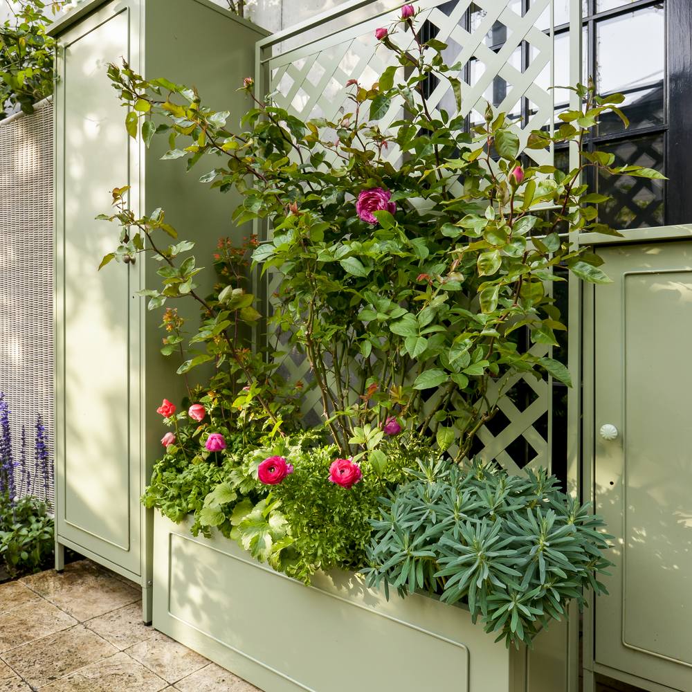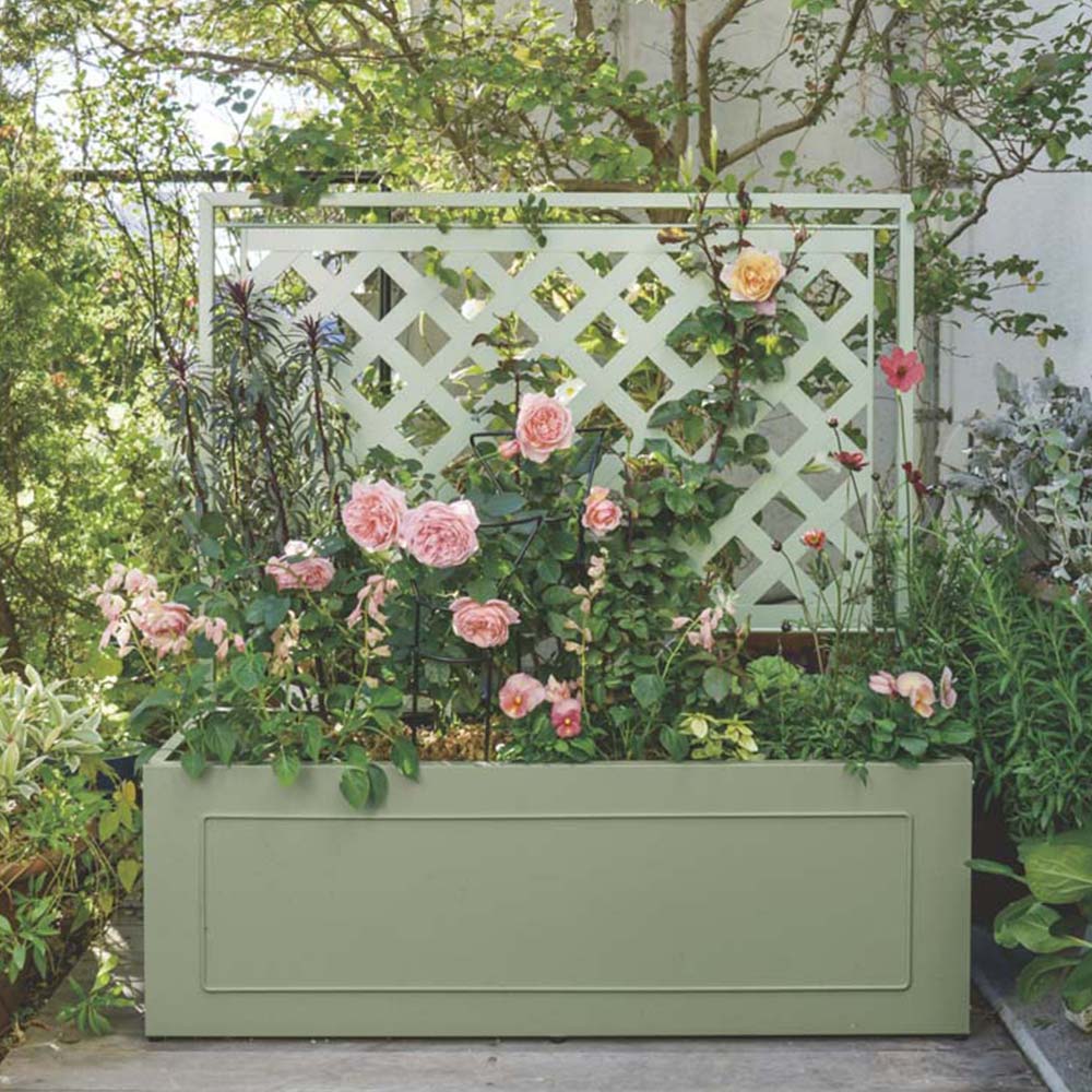 ※スチール製品は素材の特性上、経年変化でサビが発生致します。長くお使い頂くために、お届け直後の錆止め材の塗布をお薦めしております。 また、ご使用開始後も定期的なお手入れをお薦めします。(お手入れ方法&取り付け方法)【吉谷桂子先生コラボ商品】プランターボックス&トレリスが一つに!狭い場所を草花で彩るのにぴったりです。空間を明るく、広く見せるセージグリーンは吉谷桂子さんのセレクトカラーです。セージグリーンは植物となじみがよく、葉や花の色、形を引き立てます吉谷さんいわく、セージグリーンは「最も植物となじみがよく、草花の色やフォルムを美しく見せる色」。グリーンは暖色と寒色の中間色になるので、植物がどんな色であってもうまくつなぎ合わせてくれます。置く場所を選ばずガーデニングを楽しめるプランターボックス付きだから、地面のない場所でも植栽が楽しめます。地植えできない玄関やアプローチでも壁面を飾ることができます。※市販のポットやプランターをご使用ください。お庭にまとまり感を生み出す買い集めたお気に入りの植物たちも、鉢がバラバラだと見た目ももうひとつ。お気に入りの素材を使ったプランターボックスに収めれば、スッキリまとまりガーデンの印象もイメージアップ。プランターボックス&トレリスの一台2役プランターボックスから延びるグリーンが、そのままトレリスに絡んでシーンを演出。1台でお庭に印象的な風景を演出してくれます。空間を上手に仕切ればシーンの演出にも奥行が生まれ、プライベート感あふれる居心地のよい空間に。ウォールデコレーションやパーテーションにもボリュームあるデザインで、間仕切りとしての使い方もおすすめ。あまり「見栄え」の良くない背景を、さりげなく隠す効果もあります。背景が整うと、ガーデンもスッキリした印象に。簡単にお庭の印象に変化をもたらしてくれます。脚部には、設置時のガタツキを抑えるアジャスター付き設置時のガタツキを抑えるアジャスター付きで、設置場所の凸凹や傾斜にも対応します。ベランダガーデンにもおすすめガーデニング雑貨は、置いておくだけでお庭の雰囲気を盛り上げてくれます。適度なサイズのガーデニンググッズなら、玄関やベランダにもぴったり。エレガントガーデンやナチュラルガーデンにもお似合いです。初心者の方にもぜひお勧めしたい、ガーデニング用品を使ったお庭の演出テクニックです。【信頼と安心の国内工場での生産品】管理の行き届いた日本国内の工場で、加工から製造、梱包に至るまで丁寧に仕上げました。細部の丁寧な仕上がり、国産品ならではの品質は自信を持っておすすめします。