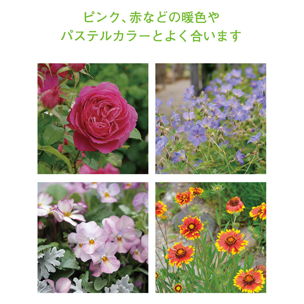 グリーンは中間色なのでどんな色もうまくつなぎます。ピンクや赤、ラベンダーなど暖色に合わせると特に相性◎。