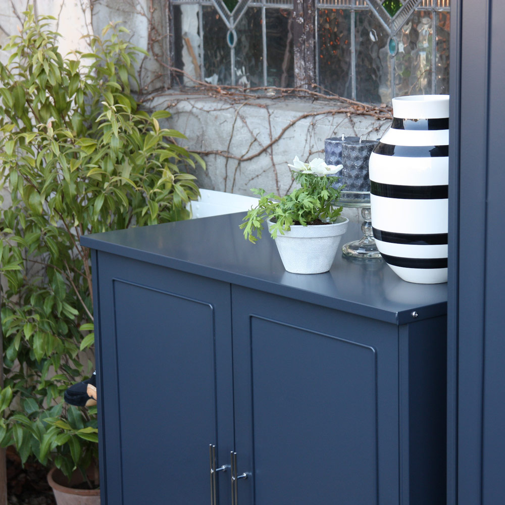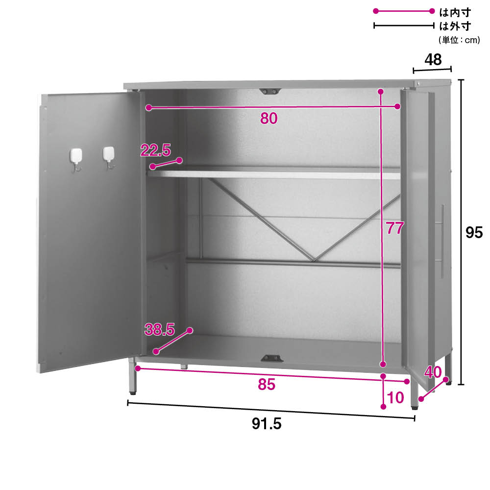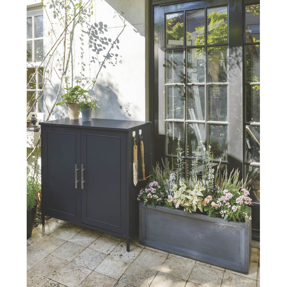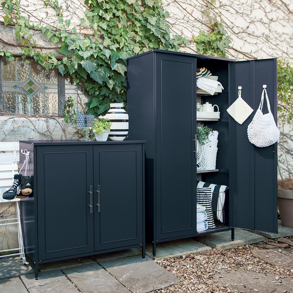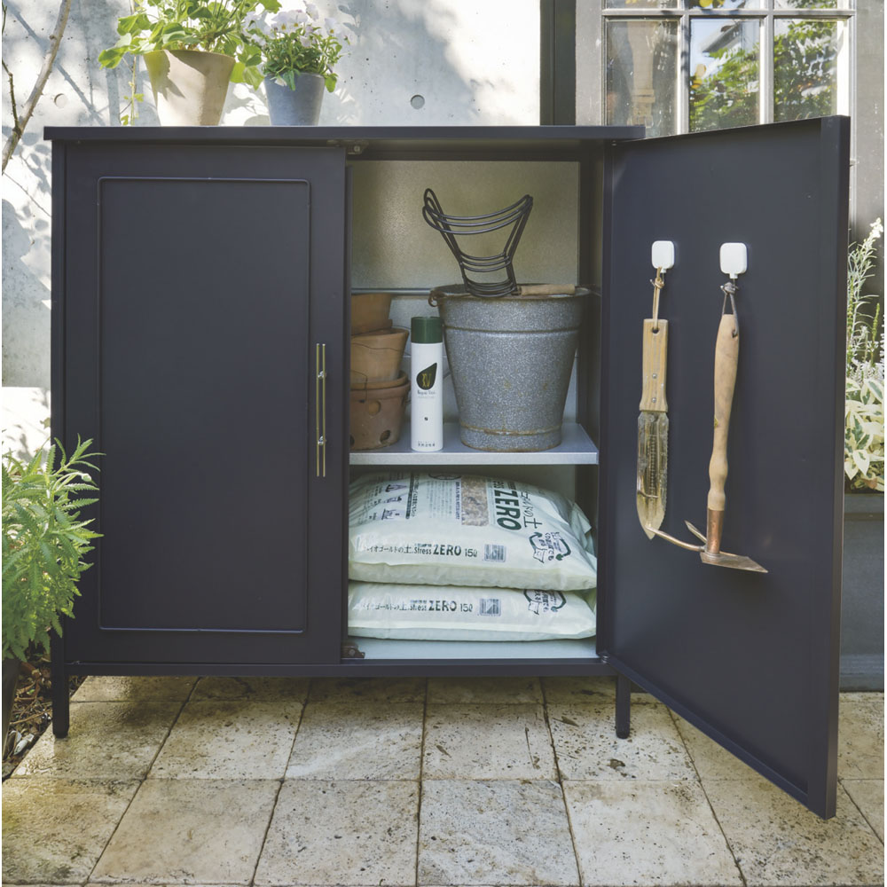 シックなダークグレー色を纏った屋外用収納庫。ヨーロッパの伝統色をイメージしました。ストックヤードも美しくまとめて。ヨーロッパで古くから愛される 伝統の色合いを日本製で再現グリーンに美しく映える、ヨーロッパ伝統の落ち着いたダークグレーの色合い、国内仕上げのしっかり丁寧な作りも魅力です。花々を引き立てるシックな色合いが、お庭の景観を引き締めます。手元に置きたい、でもしまっておきたい園芸ツールの収納には美しい収納庫を。我が家の外壁に素敵にマッチ落ち着いたデザインの物置は、お隣やご近所の目にもつきます。物置はお家の外観の一部になるともいえます。モダンデザインの物置は、お庭からベランダまで素敵に溶け込みます。しっかり収納のロッカーで、ゆとりの収納プランを。頼れる収納力ポリタンクも収納できる、頼れる収納力も自慢。棚板は奥行きが浅めのつくり。棚板と扉の間にスペースがあるので、長い柄のものを収納することができます。作業に必要なツールのほか、日用品のストックもすっきり収まる。定位置を決めれば探す手間が省け、作業効率がアップ!雨水が浸入しにくいつくり上部は「ひさし」構造で、雨水の浸入を防ぎます。天板は雨が入りにくい作りにしました。扉は浸入防止板付きで、内部に雨が吹き込みにくい構造。ホコリも防ぎ、庫内はいつもきれいな状態をキープ。タフな素材を使用。風雨にさらされる天板側面や棚板には、丈夫で耐候性に優れたガルバリウム鋼板を使用。細部にこだわった機能面も充実付属のマグネットフック(2個)で効率的に収納できます。脚部には、設置時のガタツキを抑えるアジャスター付き。お庭づくりを支えるエクステリア収納ガーデニング雑貨やベランダ用品もたっぷり収納できます。設置場所や条件に合わせた物置き収納庫をチョイスして、快適なエクステリアの収納プランを。【信頼と安心の国内工場での生産品】管理の行き届いた日本国内の工場で、加工から製造、梱包に至るまで丁寧に仕上げました。細部の丁寧な仕上がり、国産品ならではの品質は自信を持っておすすめします。【ボンデ鋼板】スチール鋼板に亜鉛被膜の保護を施すことで、耐食性・防食効果を高めた鋼板です。【ガルバリウム鋼板】アルミニウムを溶融した亜鉛合金メッキで表面処理し、耐久性耐熱性と防食作用を兼ねそなえた鋼板です。