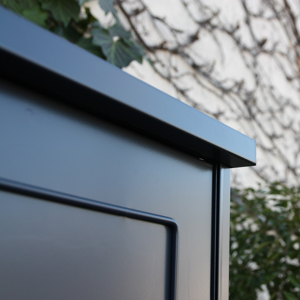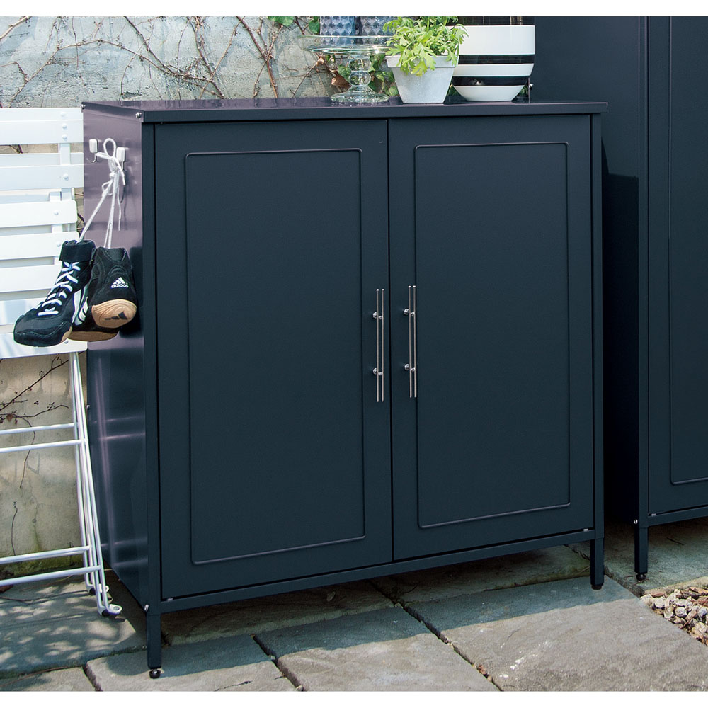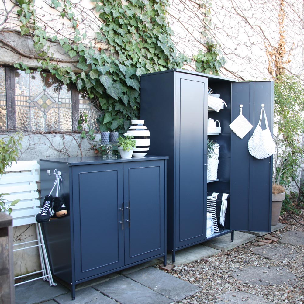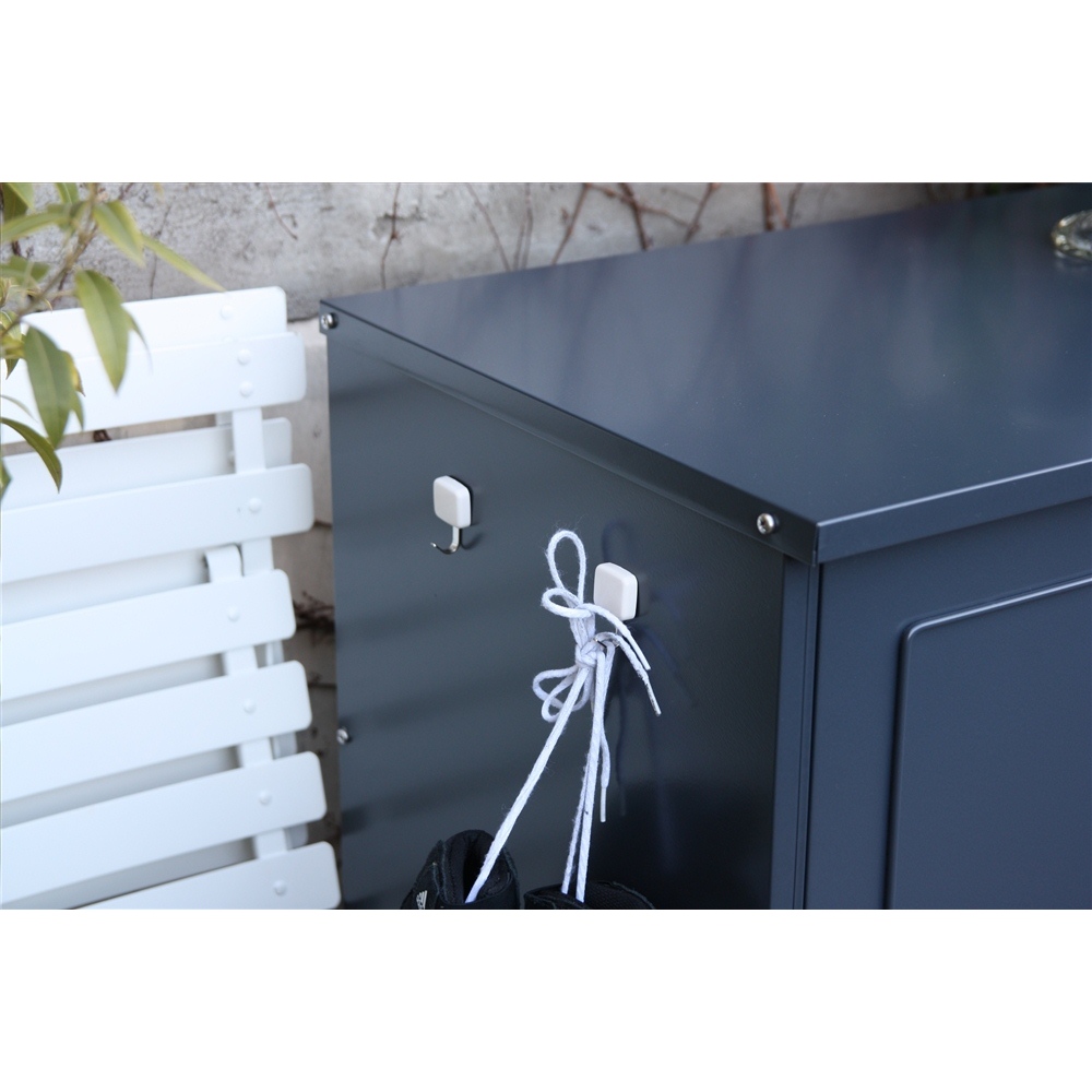 シックなダークグレー色を纏った屋外用収納庫。ヨーロッパの伝統色をイメージしました。ストックヤードも美しくまとめて。ヨーロッパで古くから愛される 伝統の色合いを日本製で再現グリーンに美しく映える、ヨーロッパ伝統の落ち着いたダークグレーの色合い、国内仕上げのしっかり丁寧な作りも魅力です。花々を引き立てるシックな色合いが、お庭の景観を引き締めます。手元に置きたい、でもしまっておきたい園芸ツールの収納には美しい収納庫を。我が家の外壁に素敵にマッチ落ち着いたデザインの物置は、お隣やご近所の目にもつきます。物置はお家の外観の一部になるともいえます。モダンデザインの物置は、お庭からベランダまで素敵に溶け込みます。しっかり収納のロッカーで、ゆとりの収納プランを。頼れる収納力ポリタンクも収納できる、頼れる収納力も自慢。棚板は奥行きが浅めのつくり。棚板と扉の間にスペースがあるので、長い柄のものを収納することができます。作業に必要なツールのほか、日用品のストックもすっきり収まる。定位置を決めれば探す手間が省け、作業効率がアップ!雨水が浸入しにくいつくり上部は「ひさし」構造で、雨水の浸入を防ぎます。天板は雨が入りにくい作りにしました。扉は浸入防止板付きで、内部に雨が吹き込みにくい構造。ホコリも防ぎ、庫内はいつもきれいな状態をキープ。タフな素材を使用。風雨にさらされる天板側面や棚板には、丈夫で耐候性に優れたガルバリウム鋼板を使用。細部にこだわった機能面も充実付属のマグネットフック(2個)で効率的に収納できます。脚部には、設置時のガタツキを抑えるアジャスター付き。お庭づくりを支えるエクステリア収納ガーデニング雑貨やベランダ用品もたっぷり収納できます。設置場所や条件に合わせた物置き収納庫をチョイスして、快適なエクステリアの収納プランを。【信頼と安心の国内工場での生産品】管理の行き届いた日本国内の工場で、加工から製造、梱包に至るまで丁寧に仕上げました。細部の丁寧な仕上がり、国産品ならではの品質は自信を持っておすすめします。【ボンデ鋼板】スチール鋼板に亜鉛被膜の保護を施すことで、耐食性・防食効果を高めた鋼板です。【ガルバリウム鋼板】アルミニウムを溶融した亜鉛合金メッキで表面処理し、耐久性耐熱性と防食作用を兼ねそなえた鋼板です。