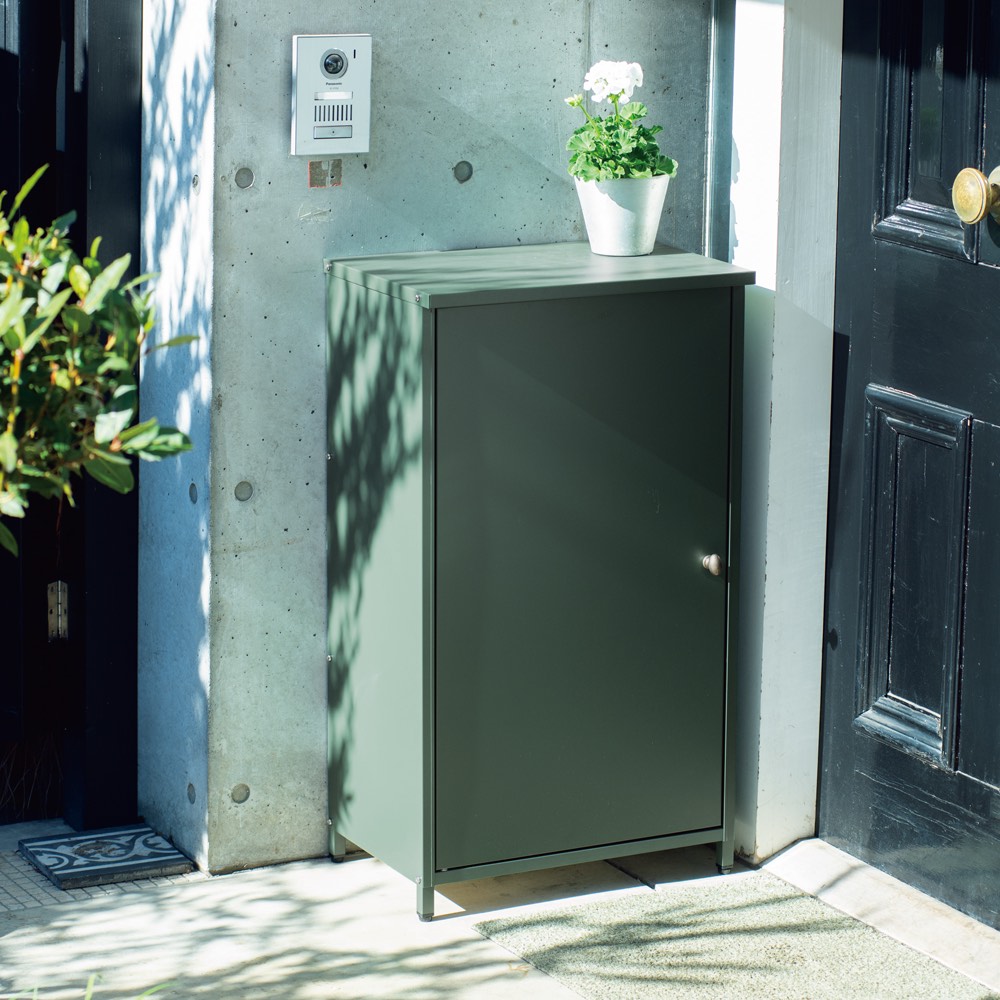 【吉谷桂子さん企画商品】ガーデングリーンに真鍮色のノブが映え玄関先や狭い場所でもフィットする、頑丈なボンデ鋼板製収納庫。庭のグリーンにつながる堅牢な収納庫です。「庭の隅や裏庭、ベランダ、玄関先、駐車スペースなど狭い場所でも置けるよう奥行35cmにこだわりました」と吉谷さん。高さは90cmで上部は作業台としても利用可能。幅は大小2サイズから選べます。【吉谷桂子/KEIKO YOSHIYA】英国園芸研究家、ガーデン&プロダクトデザイナー。7年間の英国暮らしの経験を生かしたガーデンライフを提案している。