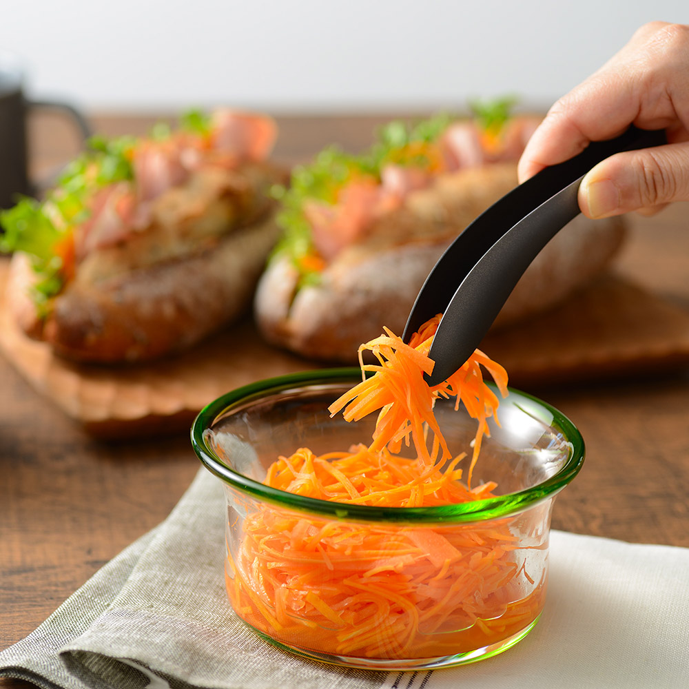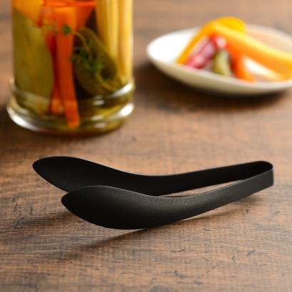 漬物や佃煮、具材入りのラー油などを取り出すのにぴったりサイズのトングです。梅干しやらっきょうなどの「ごはんのおとも」にちょうどいい小さめサイズのトングです。全体的に細身で小鉢やビンからも取りやすく、先端はぴったりとくっつくので、佃煮などの小さな食材や、千枚漬けなどの薄い食材もしっかりキャッチ。具材入りのラー油など、細かくて取り出しづらい食材もスイスイつかめますよ。ひっくり返すと先端が浮くので、テーブルを汚さずに置くことができます。汚れが落としやすいフッ素加工です。