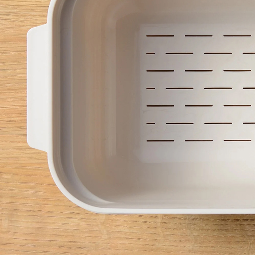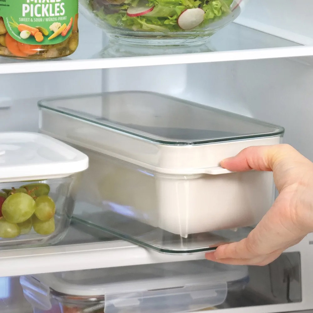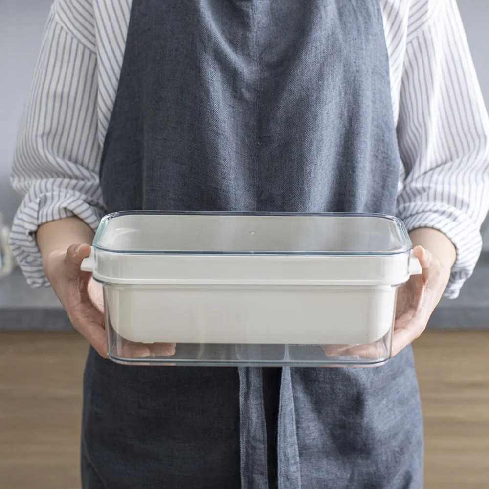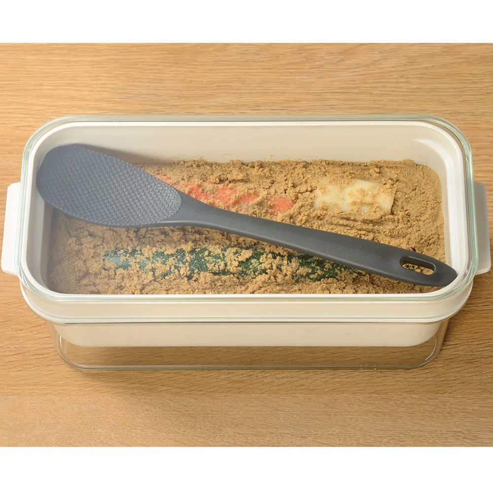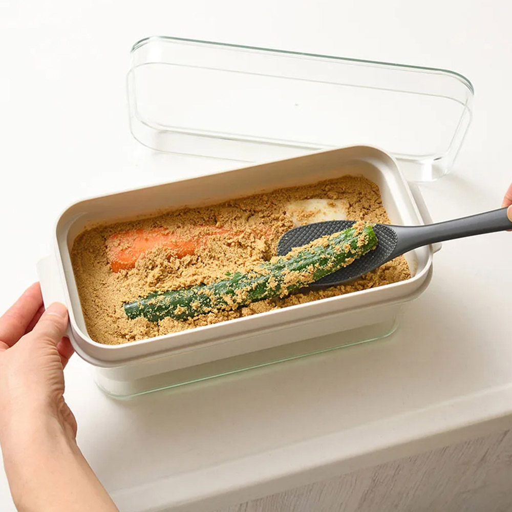 かき混ぜるたび手につくニオイや野菜から出る水分…。ぬか漬けが続かなかった人に朗報!ぬか床のお悩み全て解消します!これさえあればストレスなく美味しいぬか漬けが毎日楽しめます! 食材をカットせずに入れることが出来る縦長サイズで、発酵済ぬか床1キロを入れるのにちょうどいいサイズのぬか床容器。きゅうりなどの長さのある食材もカットせずそのまま漬けることが出来ます。内容器の底には水抜き用のスリット穴付きこの商品の一番の特徴と言えるのが、内容器に入ったスリット。このスリットから野菜から出る余分な水分が透明な外容器に自然排出されます。このスリット穴の形や数、位置を決めるのが本当に大変だったそうで、その開発期間は、なんと1年以上!試作と検証を何度も繰り返しやっと完成した自信作なんです。ぬか床の余分な水分は外容器に落ち、水捨ても簡単!あとは外容器にたまった水分を捨てるだけ。今まで、小さな穴あきの容器で水分を抜いたり、ペーパーで水気を拭き取ったりしていましたが、そんな面倒な作業はもう不要です。毎日続けるのが大変なかき混ぜも、付属のしゃもじで楽々♪ 付属の専用しゃもじは、かき混ぜや野菜の取出し、ぬかならし等に便利。絶妙なカーブが本体にぴったりとフィットする形なので、容器の端っこ部分もきっちりかき回すことが可能なのです。また表面に凹凸加工がされているので、ヌカがくっつきにくい構造。しゃもじは持ち手を汚さずに収納可能しゃもじを本体に収納した際に、持ち手が浮く設計。手を汚さず、衛生的にお使いいただけます。付属のしゃもじにはこんな工夫が!ぬかのかき混ぜや野菜の取り出し時に便利な専用しゃもじの裏面には突起が付いているので、キッチンのシンクなどに置いてもかき混ぜ部分が直に付かず、衛生的です。 縦長でコンパクトだから、冷蔵庫に入れやすい冷蔵庫にもスッキリ入る縦長サイズ。長さだけでなく幅も約13cmと程よいサイズで冷蔵庫内で邪魔にならない!出し入れもスムーズです。安定したぬか床の状態をキープ!透明で中がよく見える!冷蔵保存ができるから一年中安定したぬか床の状態を保つことができ、いつでも美味しいぬか漬けをお召し上がりいただけます。フタと外容器の透明度が高いので、中の様子がよく見え、ぬかの状態やどのくらい水分が出ているのかすぐに確認することができます。持ち手があるので運びやすく、冷蔵庫の中での出し入れもスムーズ!本体の両サイドに持ち手が付いており、本体自体も軽いのでたっぷり漬けても持ち運びやすいのが嬉しいポイント。両手に収まるコンパクトさが魅力です。本体は3つのパーツに分解可能でお手入れもラクラク外容器、内容器、フタ、しゃもじが付属しています。