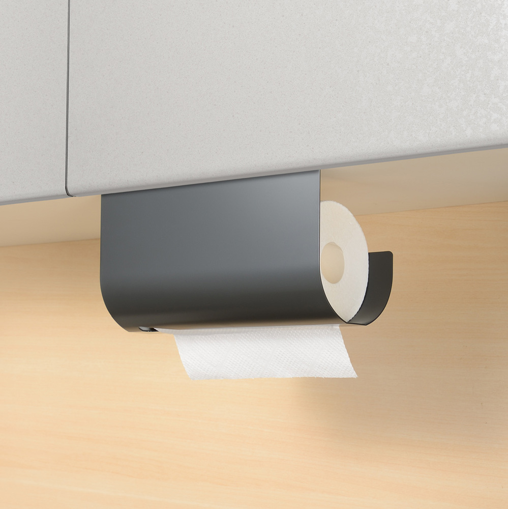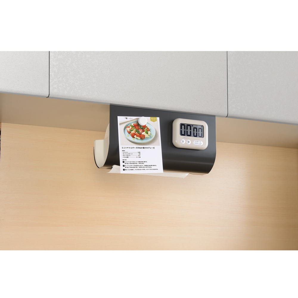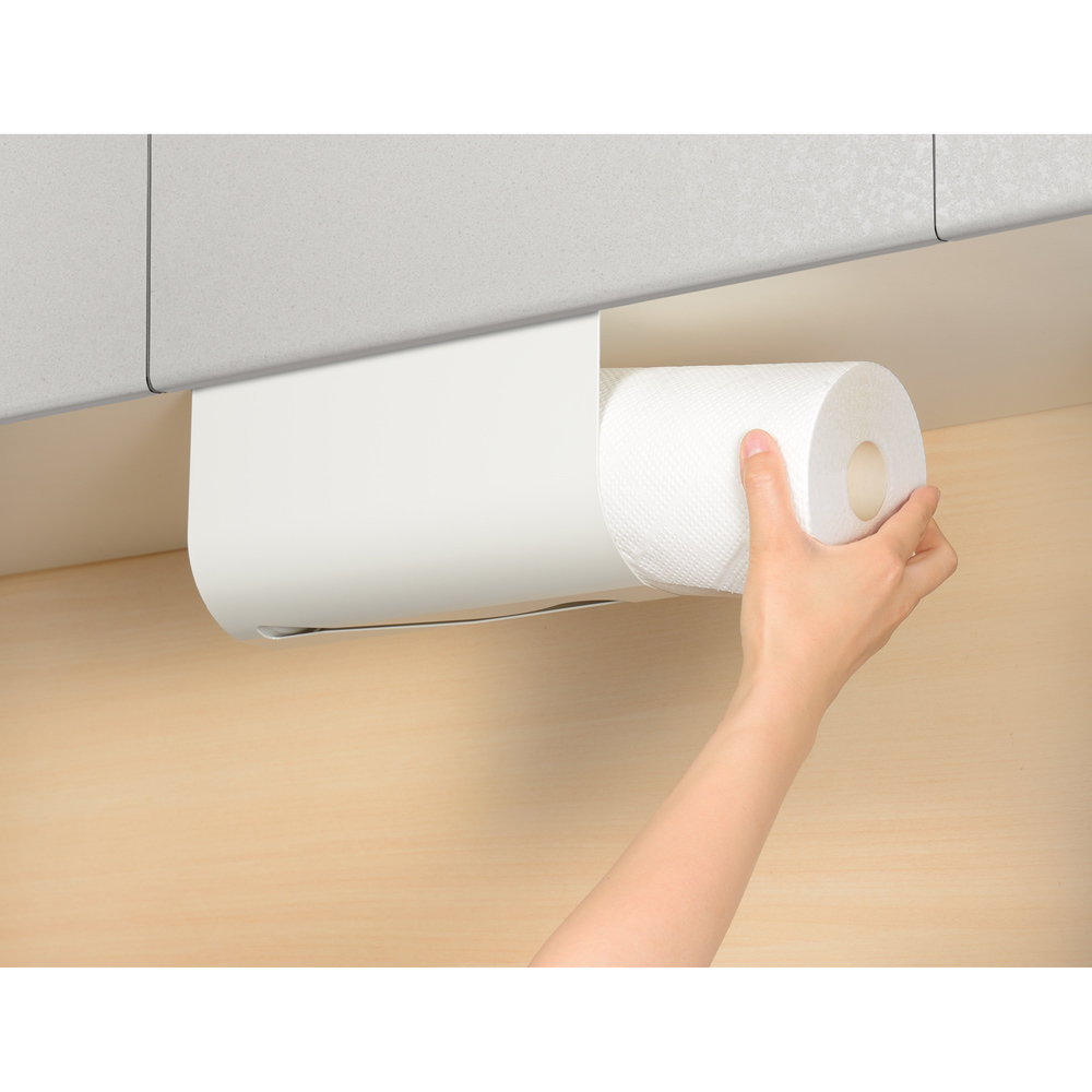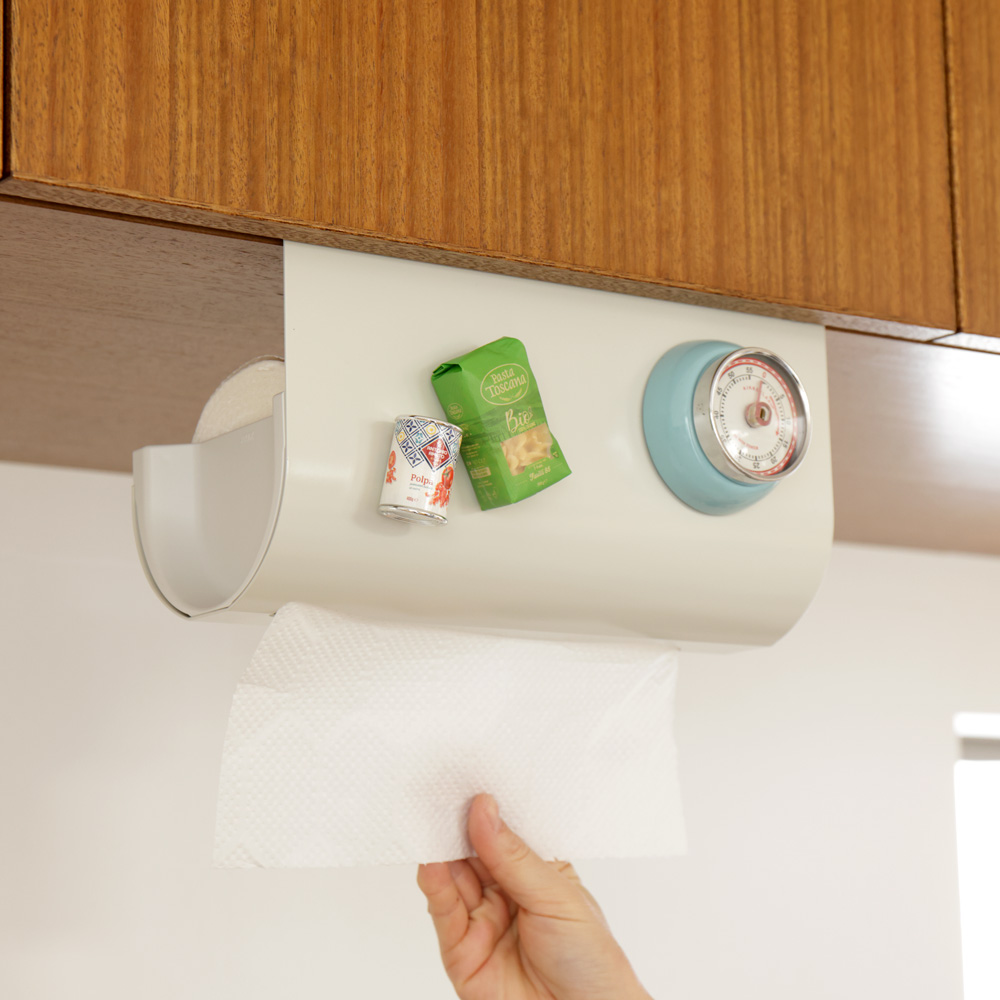 置き場所に悩むキッチンペーパーは吊り戸棚にセット。丈夫なスチール製で汚れが落ちやすく、お手入れも簡単です。