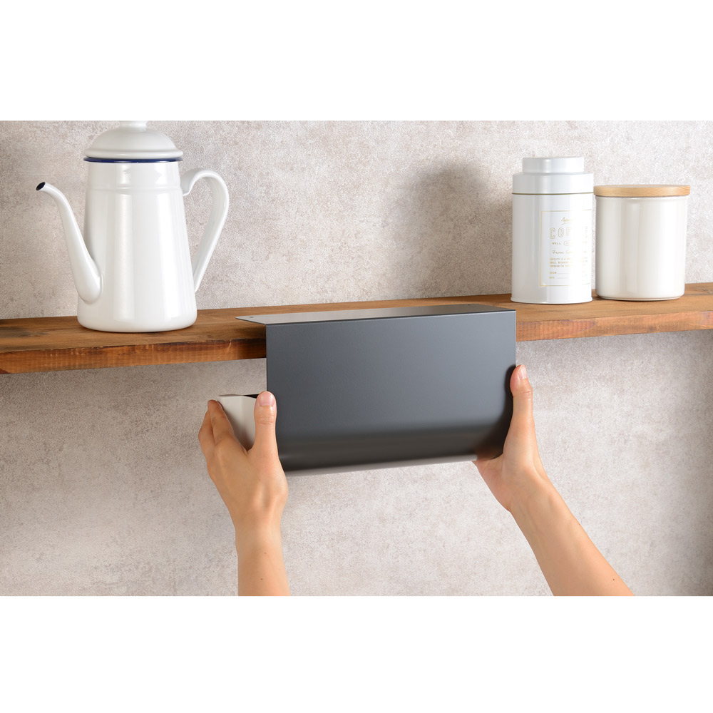 キッチンペーパーは浮かせてスッキリ。料理中でも片手でサッと切れます。吊り戸棚下を定位置にしてキッチンペーパーの置き場所問題を解決丈夫なスチール製で汚れも落ちやすく、お手入れも簡単です。吊り戸棚の下にセットすれば、水濡れの心配も少なく料理の効率もアップ。ペーパーが隠れて見た目スッキリ。生活感を出したくない…という方にもおすすめのスタイリッシュなデザイン。キッチンがすっきりおしゃれに整います。横から入れるだけでセット完了わずらわしい手間なくセットできて、途中で取り出すのも簡単です。タイマーやフックをペタッ!本体はマグネット対応。キッチンタイマーやフック、レシピカードなどを付けて有効活用できます。オープンラックにもセット可能吊り戸棚以外のオープンラックなどにものせるだけで使えます。キッチンのいろんな場所で大活躍!粘着シートでピタッとフィット繰り返し使える粘着シート付きで、棚を傷つけにくい仕様。使う場所を変えたいときにも便利です。片手でサッとらくらくカットペーパーを横に引くだけで1枚ずつカットできます。片手でOKだからストレスフリー。機能美を追求したスタイリッシュデザインインテリアの邪魔をしないシンプルなデザイン。オープンなキッチンにも自然になじみます。片手で切れる秘密は独自の切り口形状切り口を波型にすることでペーパーの横すべりを防止。ストレスなく片手で切れるアイデア設計です。
