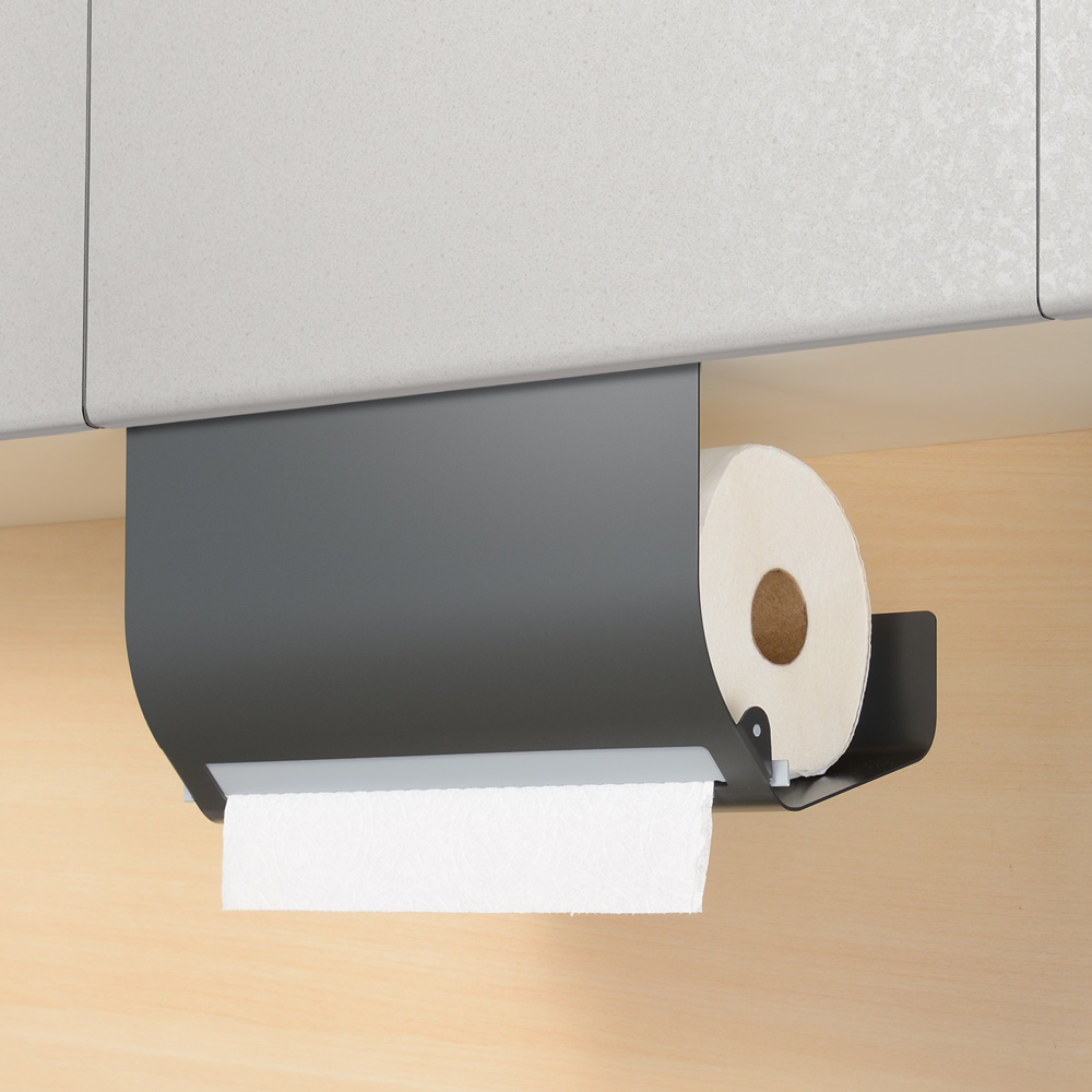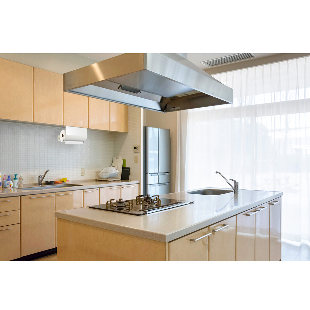 置き場所に悩むキッチンペーパーは吊り戸棚にセット。丈夫なスチール製で汚れが落ちやすく、お手入れも簡単です。