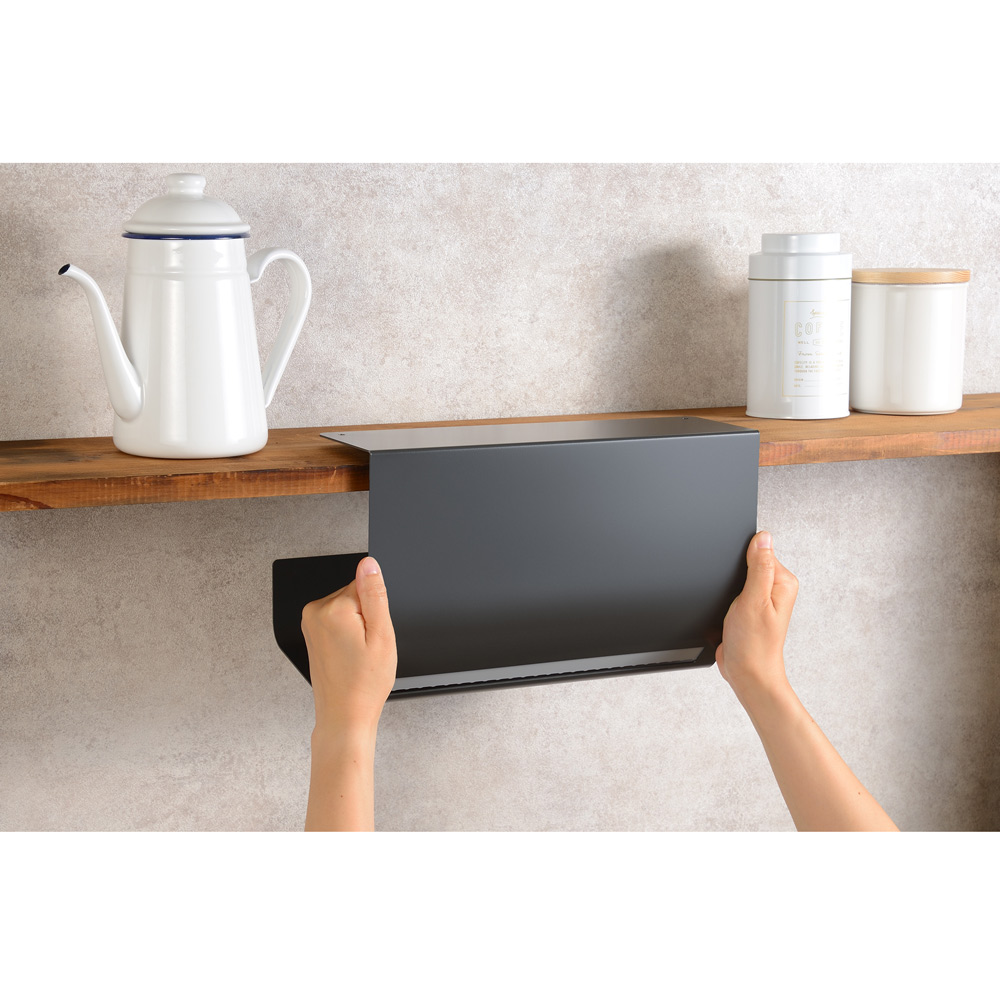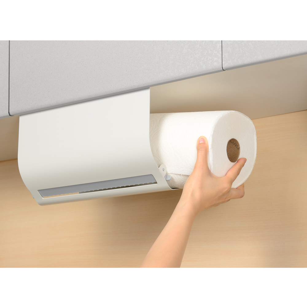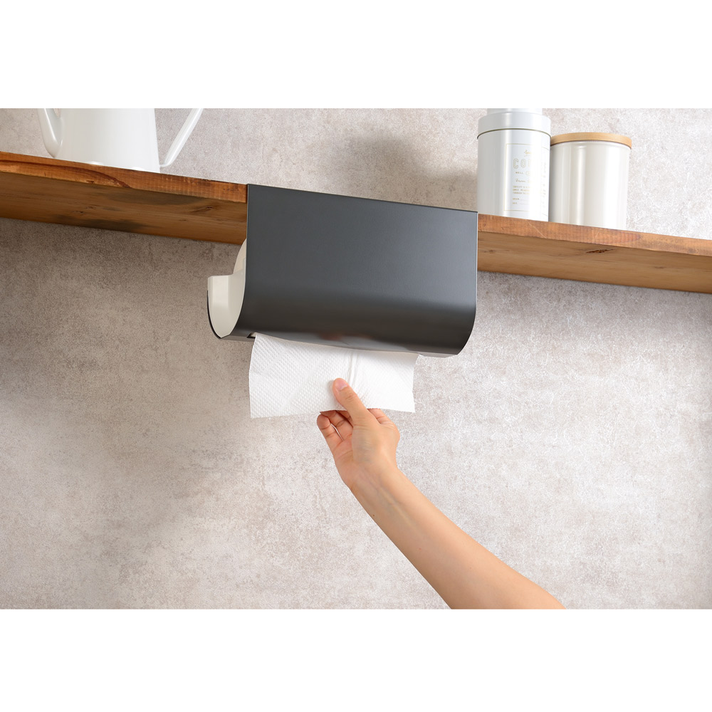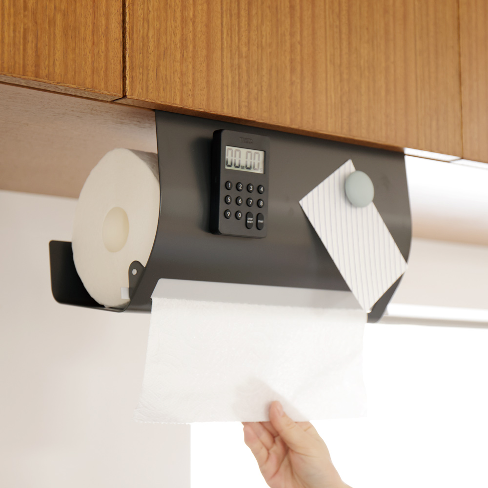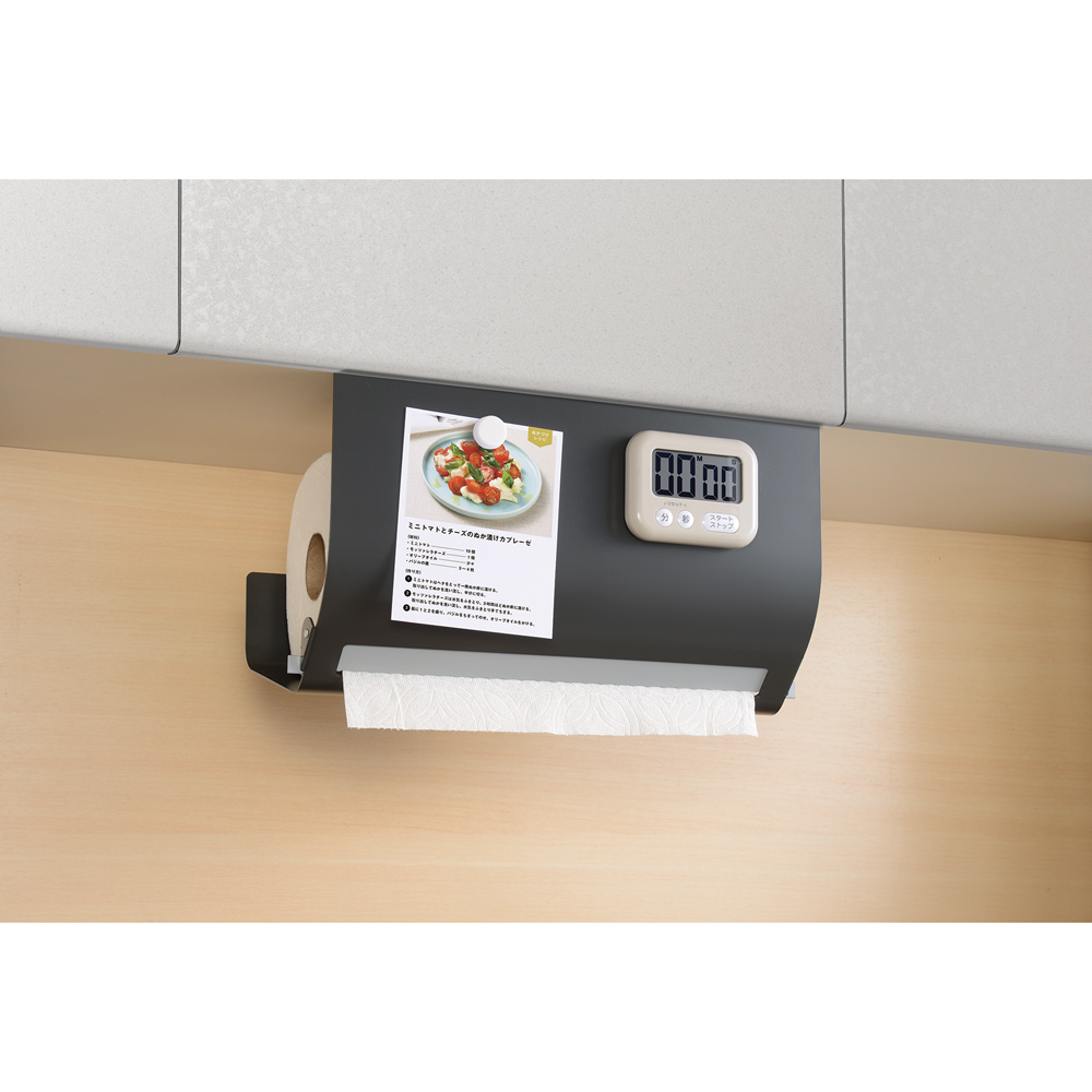 海外製の大判キッチンペーパーも。吊り戸棚に浮かせて片手でサッ!吊り戸棚下を定位置にしてキッチンペーパーの置き場所問題を解決丈夫なスチール製で汚れも落ちやすく、お手入れも簡単です。吊り戸棚の下にセットすれば、水濡れの心配も少なく料理の効率もアップ。ペーパーが隠れて見た目スッキリ。生活感を出したくない…という方にもおすすめのスタイリッシュなデザイン。キッチンがすっきりおしゃれに整います。ワンタッチでセット完了ペーパーを横から入れて、ストッパーを下げるだけで簡単にセットできます。タイマーやフックをペタッ!本体はマグネット対応。キッチンタイマーやフック、レシピカードなどを付けて有効活用できます。オープンラックにもセット可能吊り戸棚以外のオープンラックなどにものせるだけで使えます。キッチンのいろんな場所で大活躍!粘着シートでピタッとフィット繰り返し使える粘着シート付きで、棚を傷つけにくい仕様。使う場所を変えたいときにも便利です。片手でサッとらくらくカットペーパーを横に引くだけで1枚ずつカットできます。片手でOKだからストレスフリー。機能美を追求したスタイリッシュデザインインテリアの邪魔をしないシンプルなデザイン。オープンなキッチンにも自然になじみます。厚手のペーパーもスムーズにカット切り口には厚手のペーパーも切りやすい、しっかりとしたストッパーが付いているのでスムーズにカットできます。ストッパーで抑えて横すべりを防止ペーパーの横すべりを防ぐストッパー付きで、しっかりホールドできます。