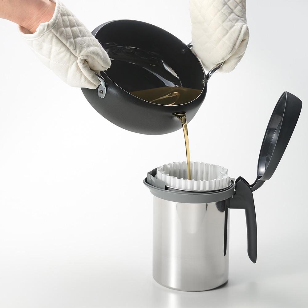 ロカポット(オイルポット)専用のろ過パウダー&フィルターセット 60回分です。ロカポット(オイルポット)専用のろ過パウダー&フィルターセット。約60回分使用することができます。付属のスプーン1杯(5g)を紙フィルターに入れて使用します。ろ過パウダーとフィルターは使用ごとに交換してください。ろ過パウダーとは?こちらの「ろ過パウダー」は食品添加物として合格している「活性白土」。実は食用油メーカーが油の臭いや汚れを取り除く工程で採用している業務用と同じ素材なんです!焦げた衣や粒状の小さな汚れまでクレーパウダーがしっかり吸着して、綺麗な透明の油に蘇ります。パウダーの粒子はろ紙のすき間よりも大きいから、パウダーが油に残る心配はありません。